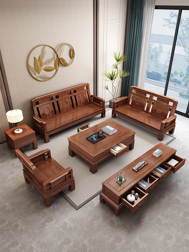 大連華豊公式フラッグシップストアの金絲胡桃木ソファー - 新中式スタイルのリビング&寝室用コンビネーション家具、冬夏に最適!高級感溢れる実木製で、快適な空間を演出します。