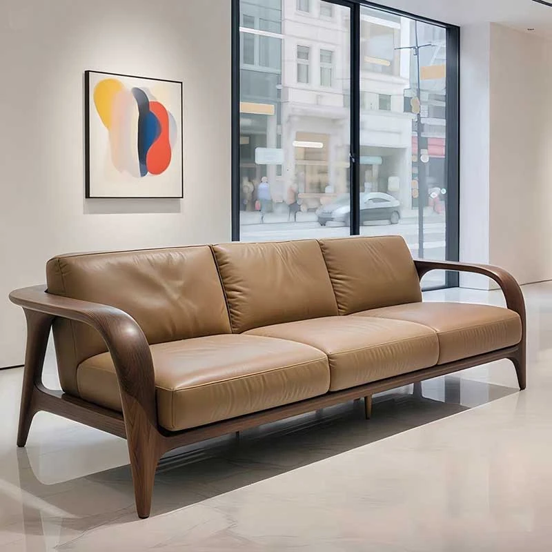 新中式ウォールナット無垢材ソファー、レザー仕上げのラグジュアリーな3人掛け。モダンでシンプル、コンパクトなリビングにぴったりの家具です。あなたの空間に洗練された美しさを加えます!