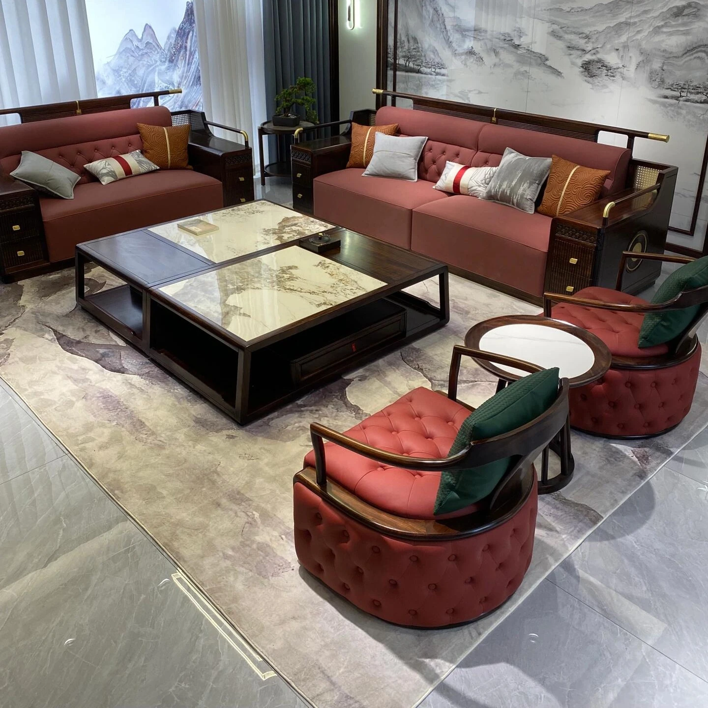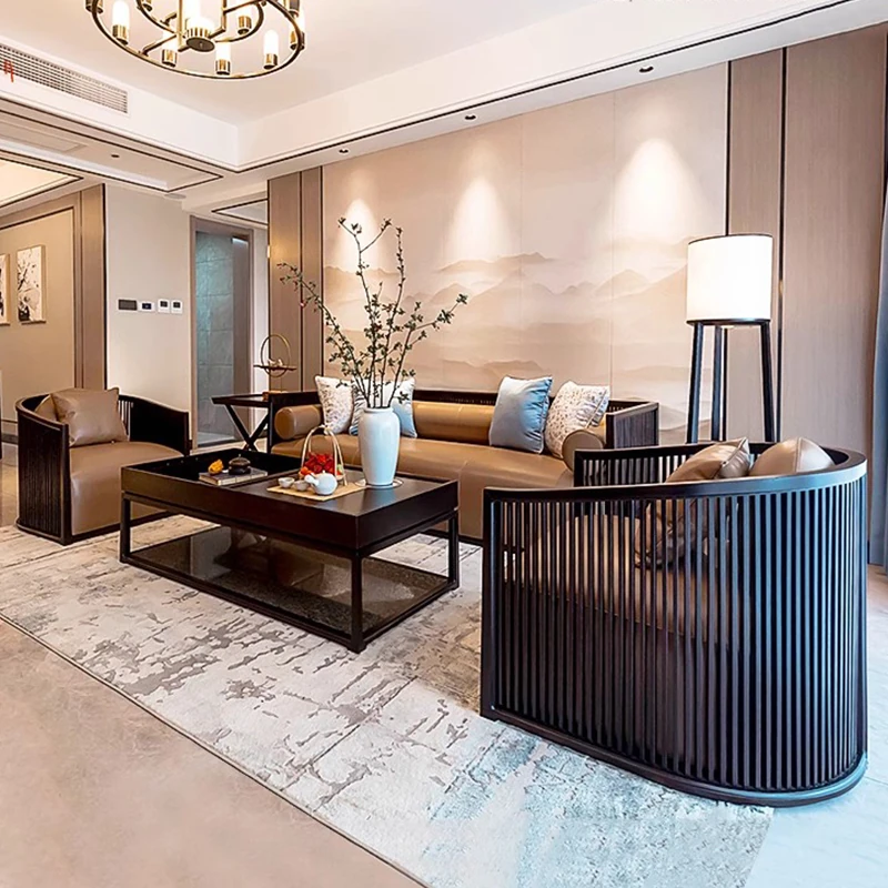 新中式の禅の雰囲気を漂わせるブラックウォールナット製ソファ&テーブルセット - 真皮素材で贅沢感を演出、民宿やホテルのリビングに最適!心安らぐ空間を提供します。