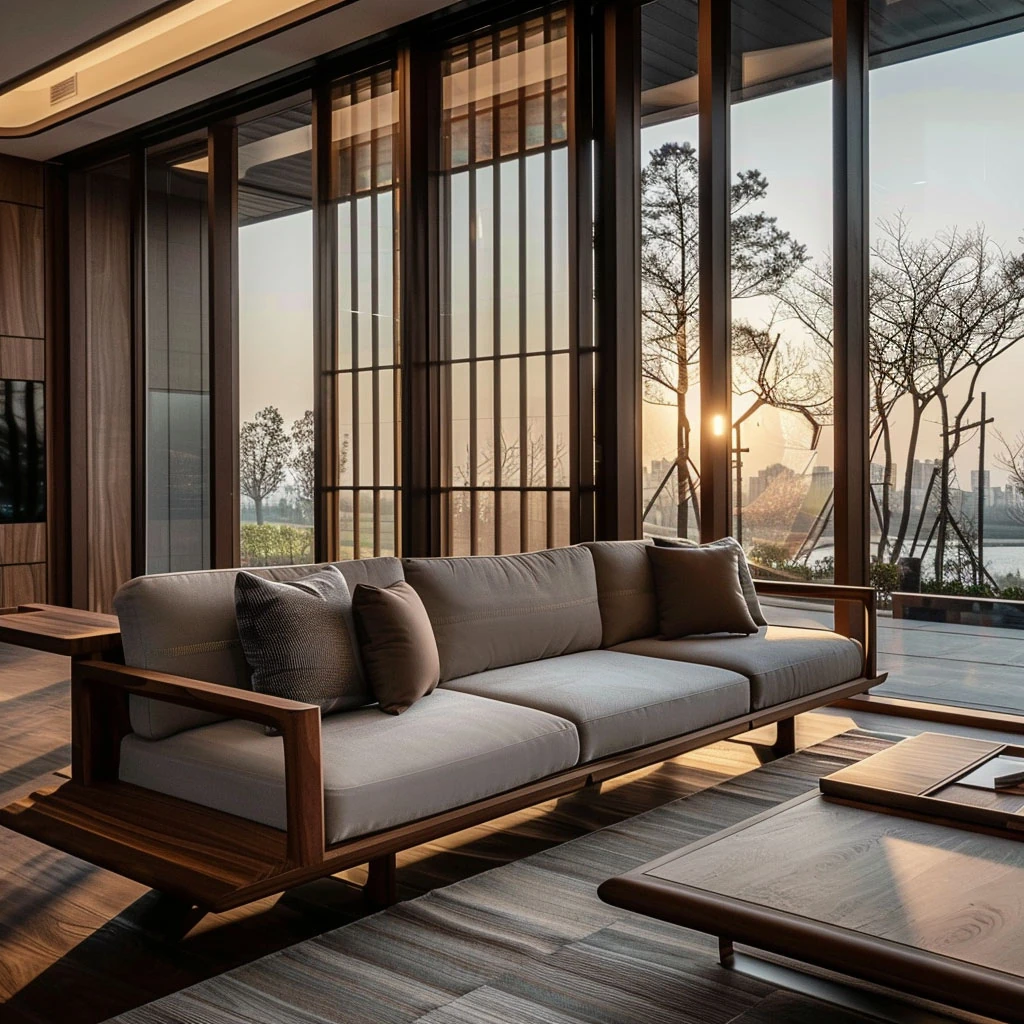 2024年新中式風格の無垢材ソファとテーブルの組み合わせ - 禅の心を感じる黒胡桃とホワイトアッシュの美しいデザイン、民宿やオフィス、ホテルに最適な家具!