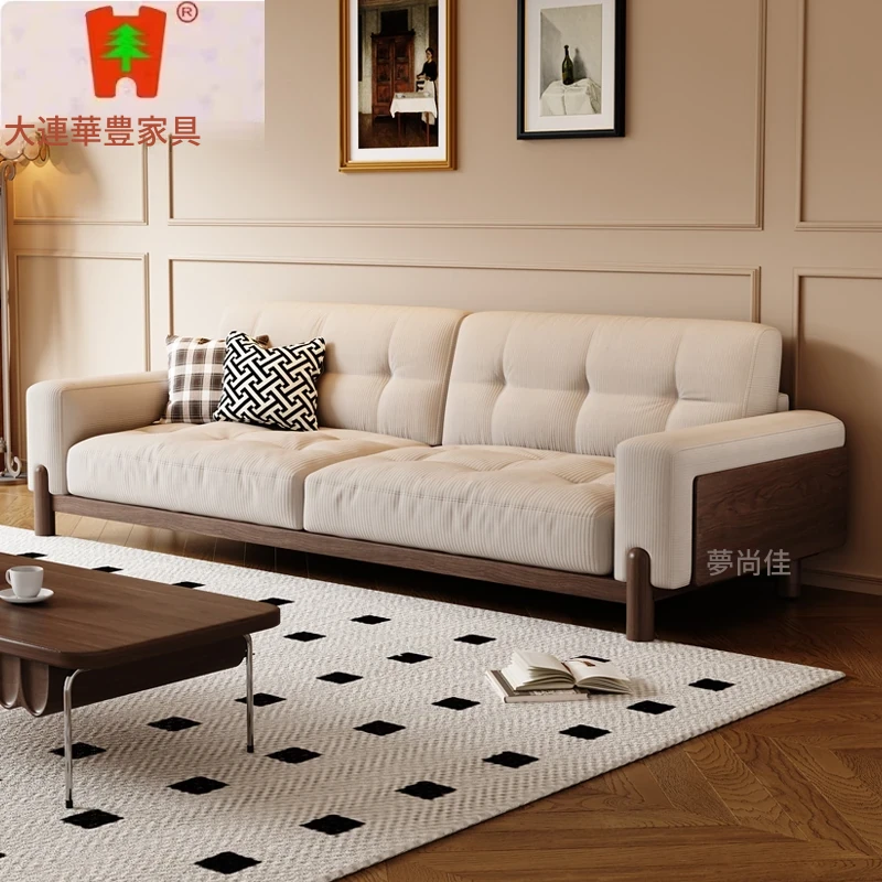 新作!2025年版北米黒胡桃木使用のシンプル欧風ストレートソファ。小型住宅にもぴったりな高級感あふれる無垢材とファブリックのコンビネーションで、リビングをスタイリッシュに演出します。