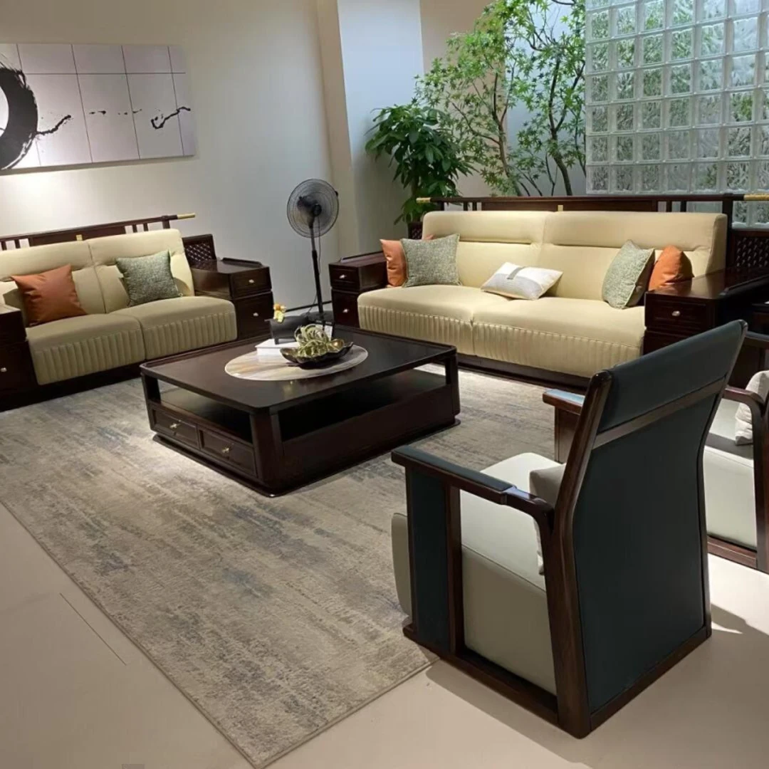 新しい中華風のラグジュアリーな実木ソファ、真皮仕上げでモダンなシンプルデザイン。北米産のブラックウォールナットを使用した大空間向けのリビングソファで、優雅なひとときを演出します。