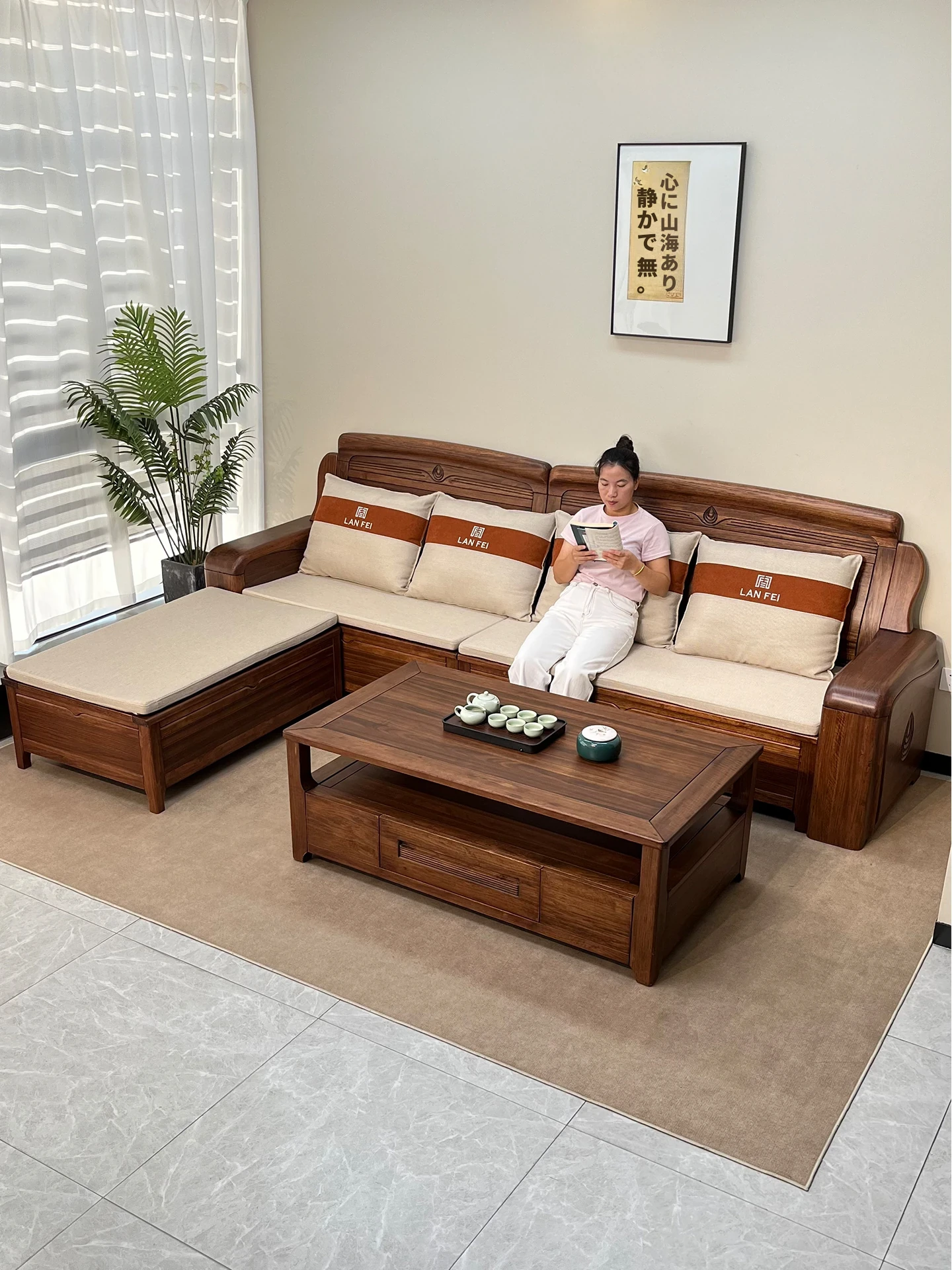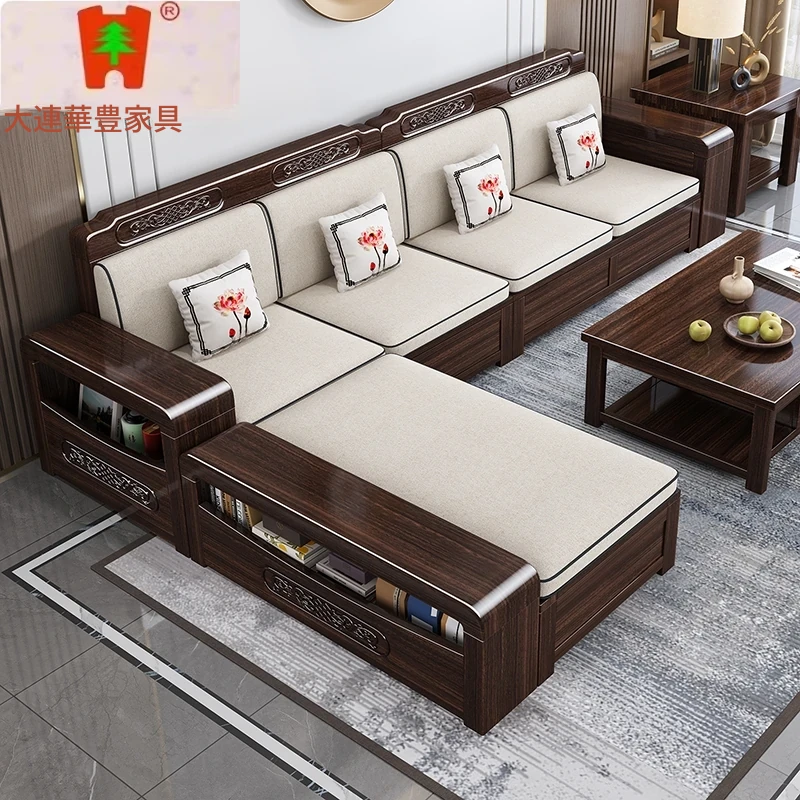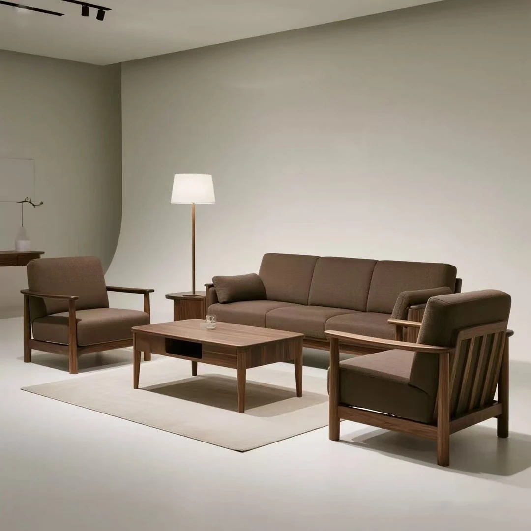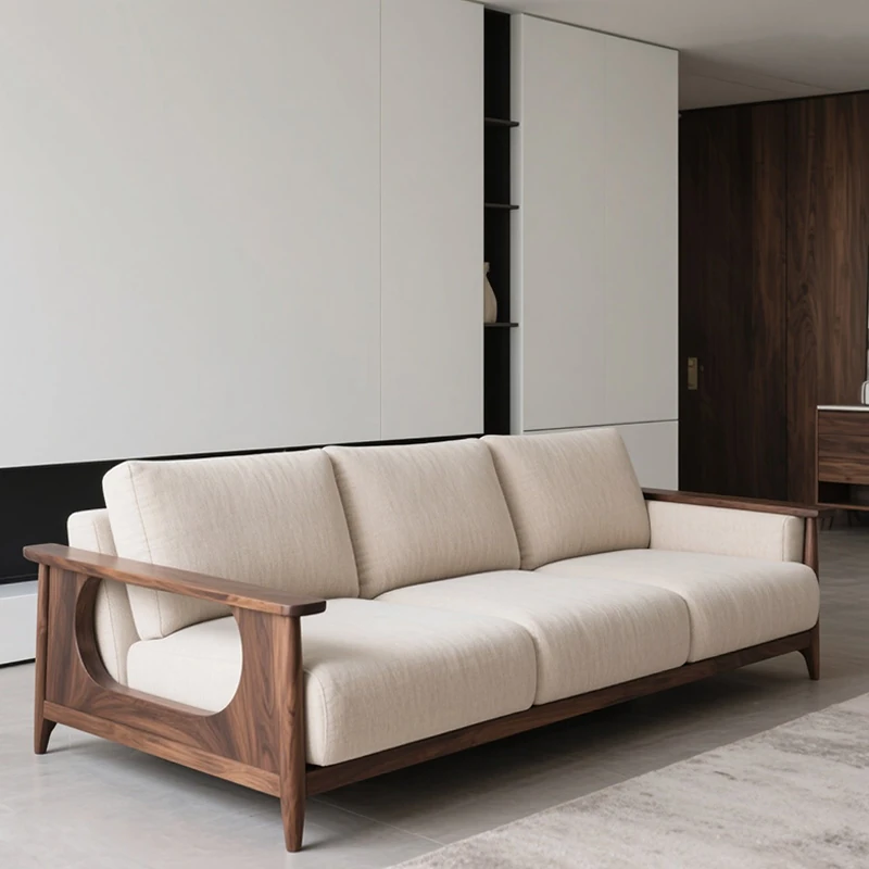 新中式高級実木ソファ2025年モデル|北米産ウォールナット材使用のラグジュアリーな別荘リビング用ストレートソファ|おしゃれで快適な空間を演出!