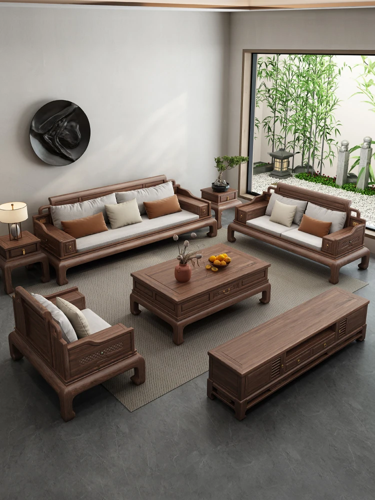 南米産ウォールナットの新中式無垢材ソファセット - 大型リビングルームに最適!冬も夏も快適に使える国潮風のアンティークスタイル家具。おしゃれで機能的な空間を演出します。
