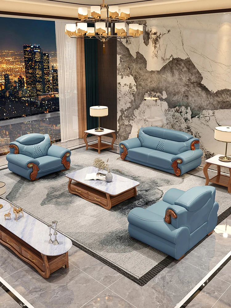 高級感溢れる欧式本革ソファー | 新中式スタイルの実木製リビングルーム用コンビネーション | 大型住宅に最適な豪華なセットで、居心地の良い空間を演出!