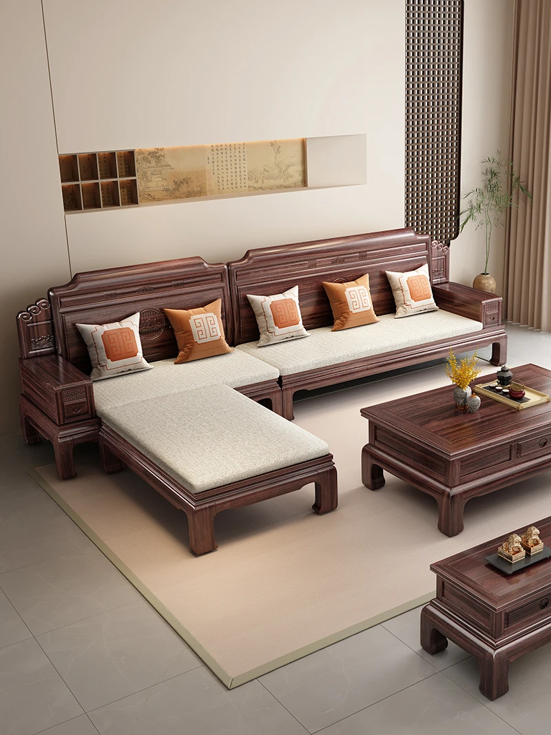 新しい中華スタイルの高級実木彫刻ソファー - エレガントな黒檀材使用、モデルハウスや別荘、民宿に最適なリビングルーム用コンビネーション家具!洗練されたデザインで、上質な空間を演出します。