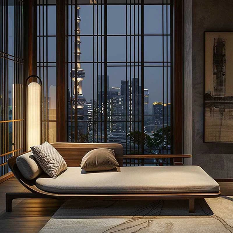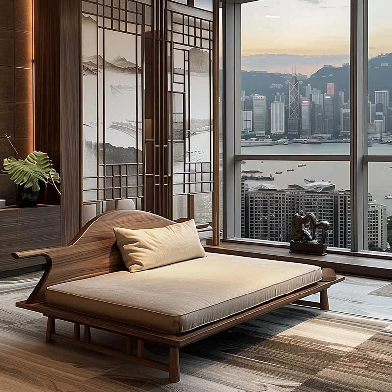 北米産ブラックウォールナット&ホワイトアッシュの高級ローベッド|リビング・ホテル・民宿に最適な新中式禅スタイルソファ|快適なひとときを提供します!
