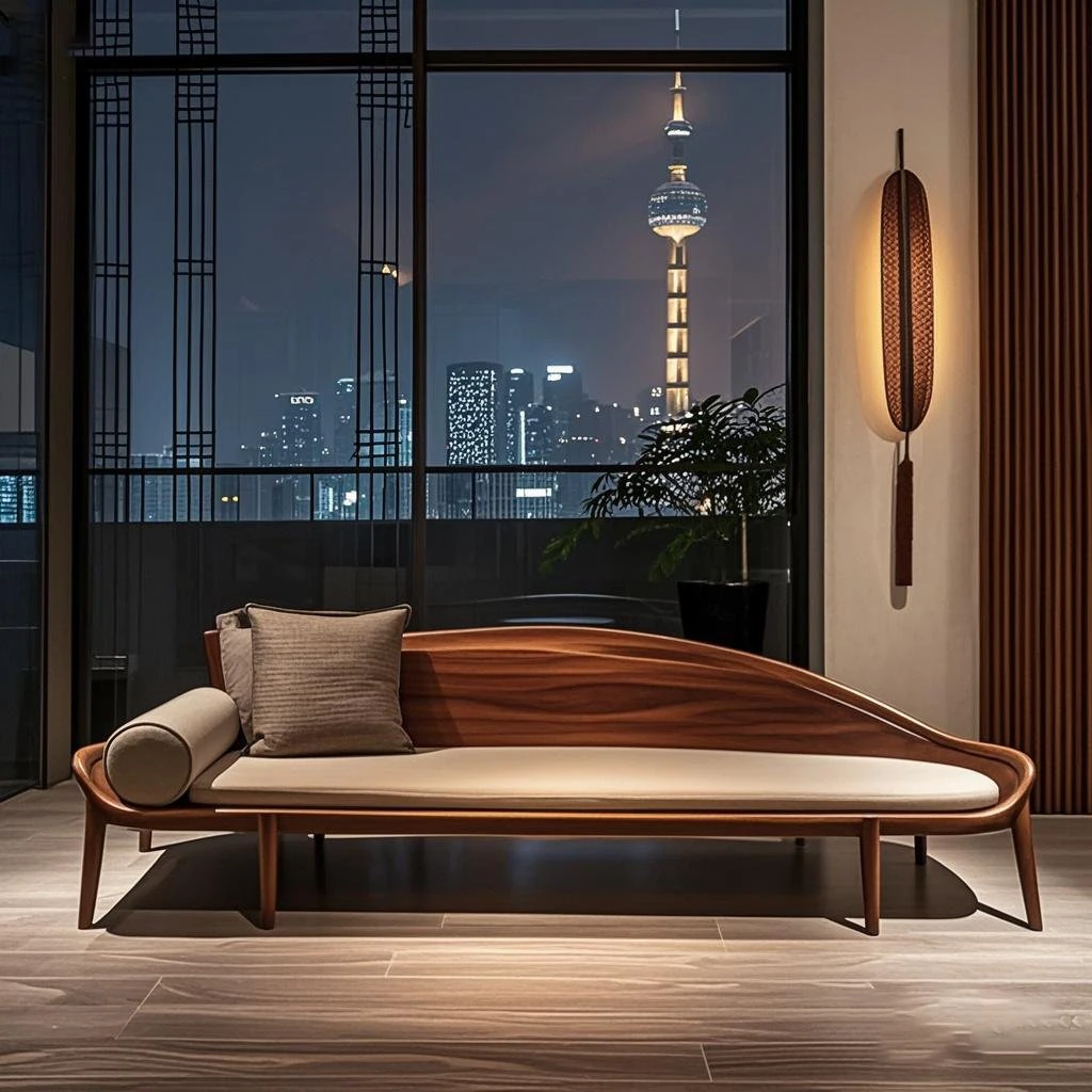 北米産ブラックウォールナット使用の新中式禅スタイル高級カウチ、モダンミニマリズムにぴったりな軽やかさを兼ね備えた贅沢なデザイン!リビングや寝室に最適な上質な貴妃椅子。