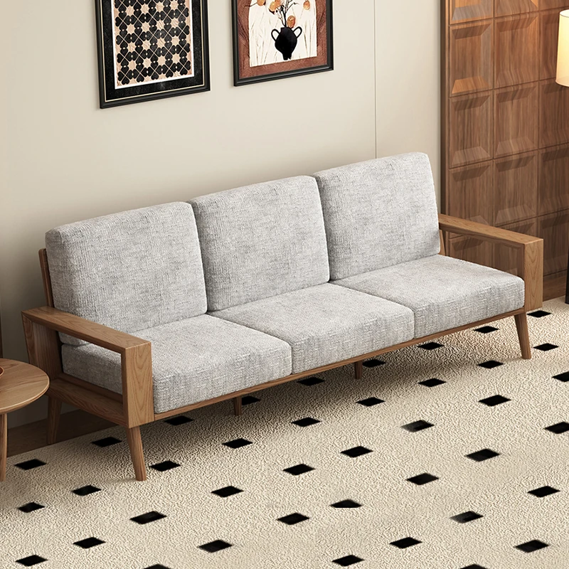 Modern Minimalist Chinese Solid Wood Sofa Set - Rubber Wood Fabric Three-Seater for Small Living Rooms, Perfect for Natural Decor and Cozy Spaces