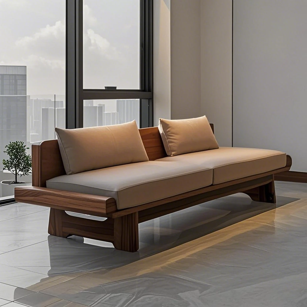 Zen-Inspired New Chinese Black Walnut Straight Sofa - Solid Wood Genuine Leather Luohan Bed in Wabi-Sabi Style for Hotels, Guesthouses, and Offices