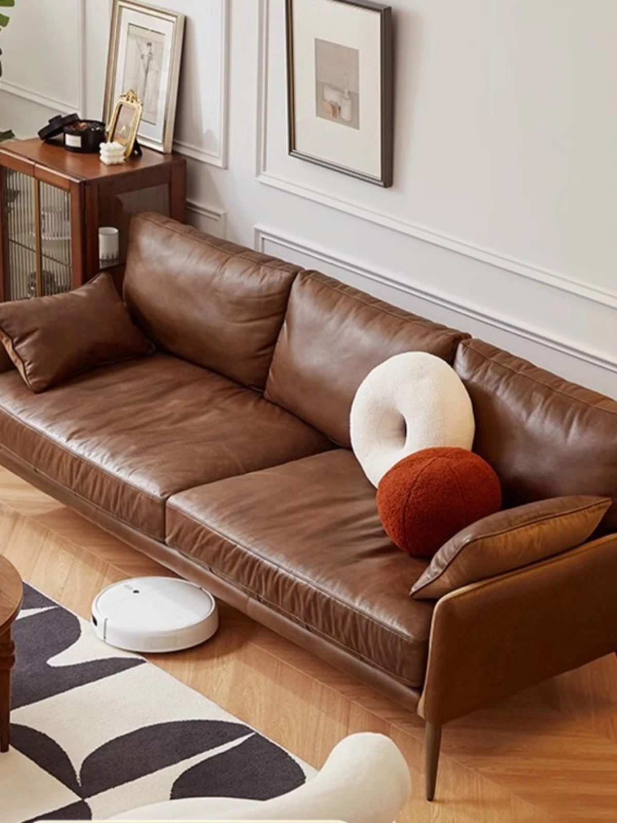 American Vintage Small Space Waxed Leather Sofa - Italian Minimalist Brown Three-Seater for Retro Living Room