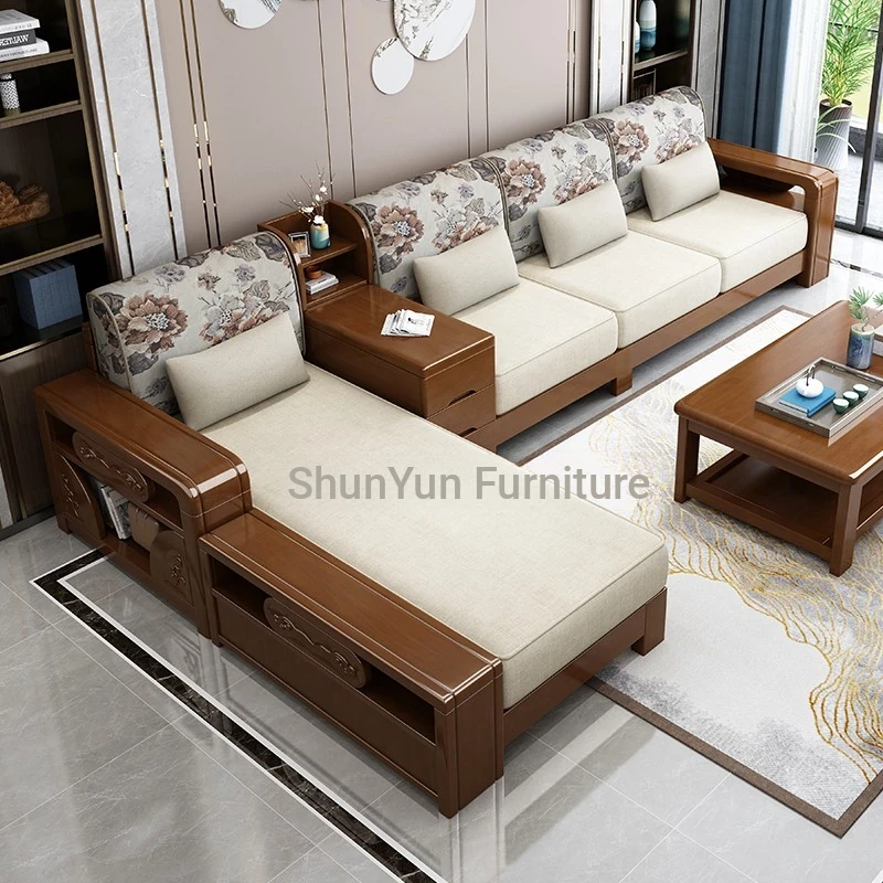 Elegant Song-style Aesthetic North American Walnut Luxury Solid Wood Sofa - High-End Corner Sofa for Living Room, Ideal for Villas, Featuring Plush Fabric Design