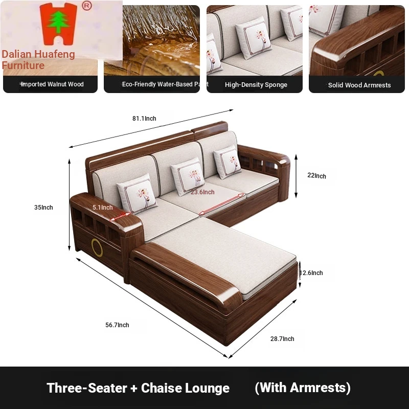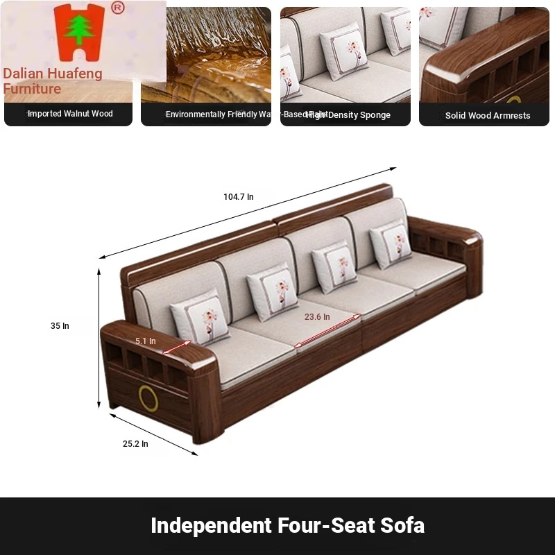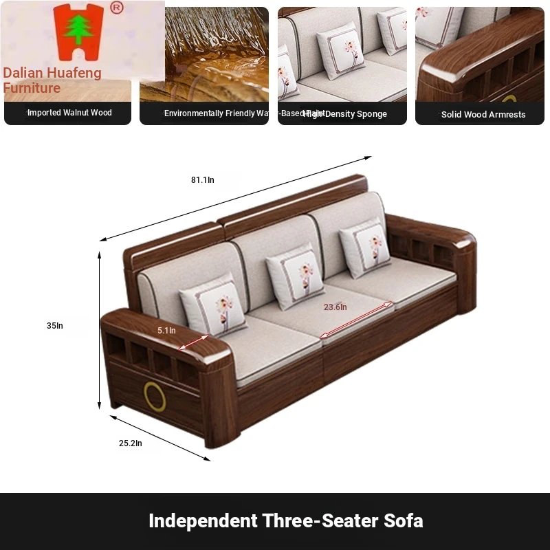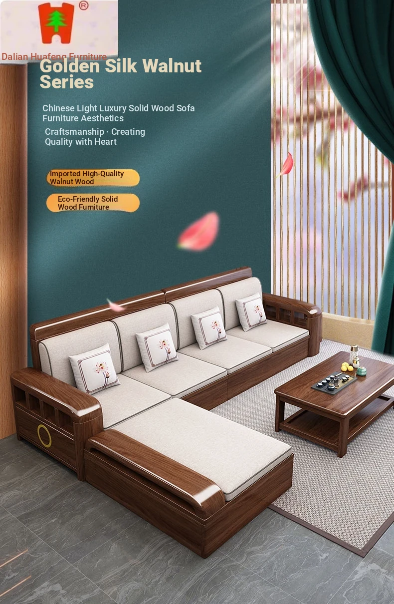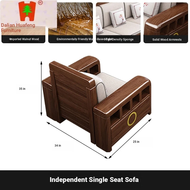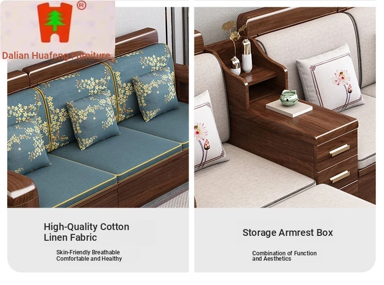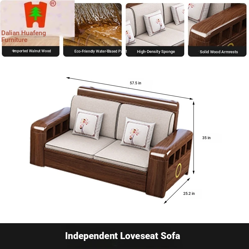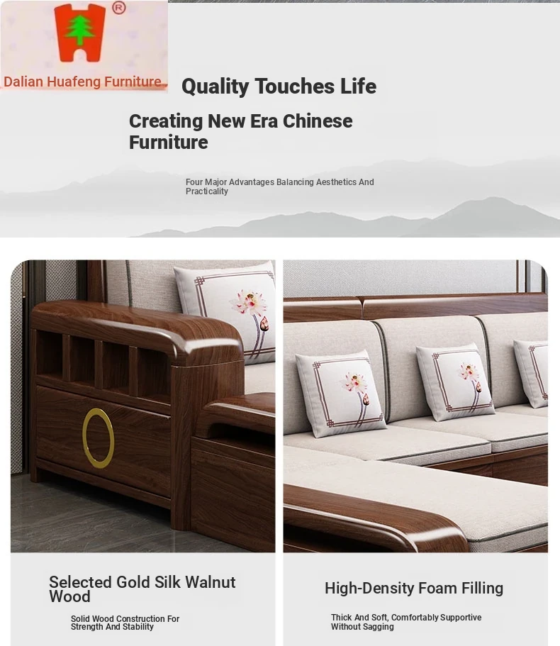 Dalian Huafeng Official Store - Elegant New Chinese Style Solid Wood Sofa Set in Golden Silk Walnut for Bedroom and Living Room - Versatile for All Seasons
