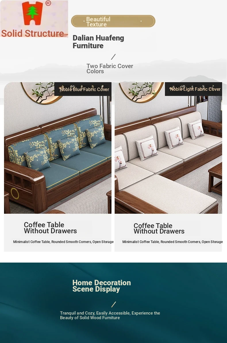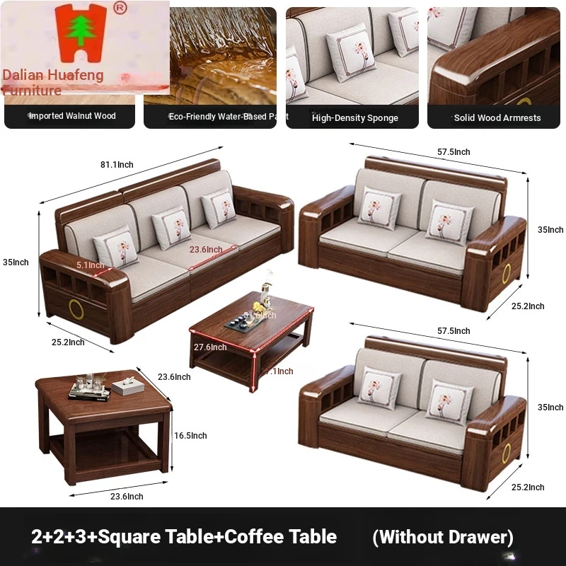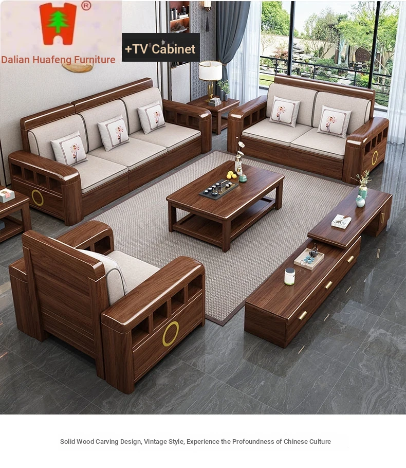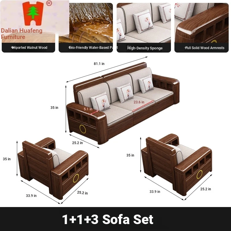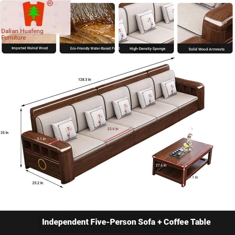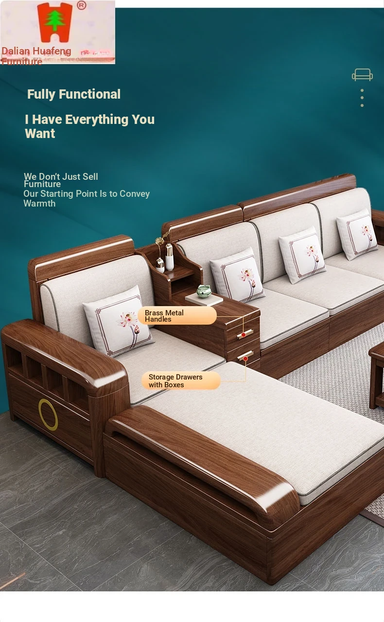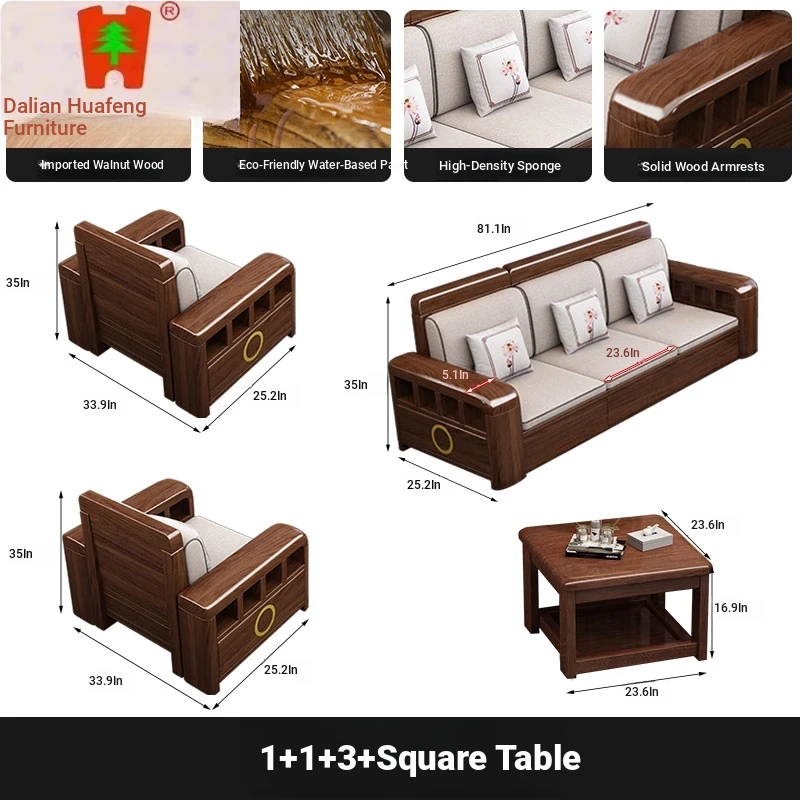 Dalian Huafeng Official Store - Elegant New Chinese Style Solid Wood Sofa Set in Golden Silk Walnut for Bedroom and Living Room - Versatile for All Seasons