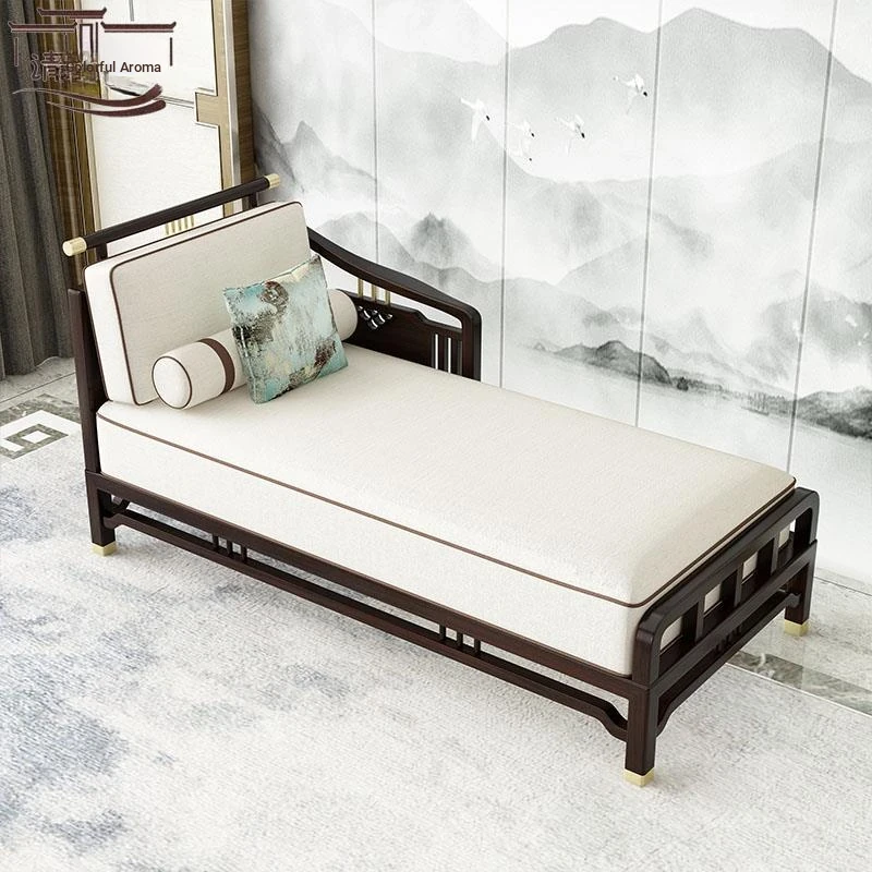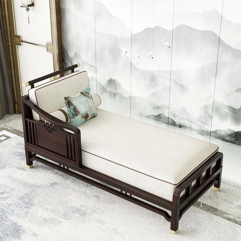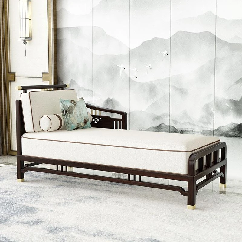 Elegant Chinese Style Solid Wood Chaise Lounge - Zen-Inspired Sofa with Ukin Wood, Perfect for Living Room Corner, Combining Comfort and Aesthetic Appeal in a Chic Fabric Design.