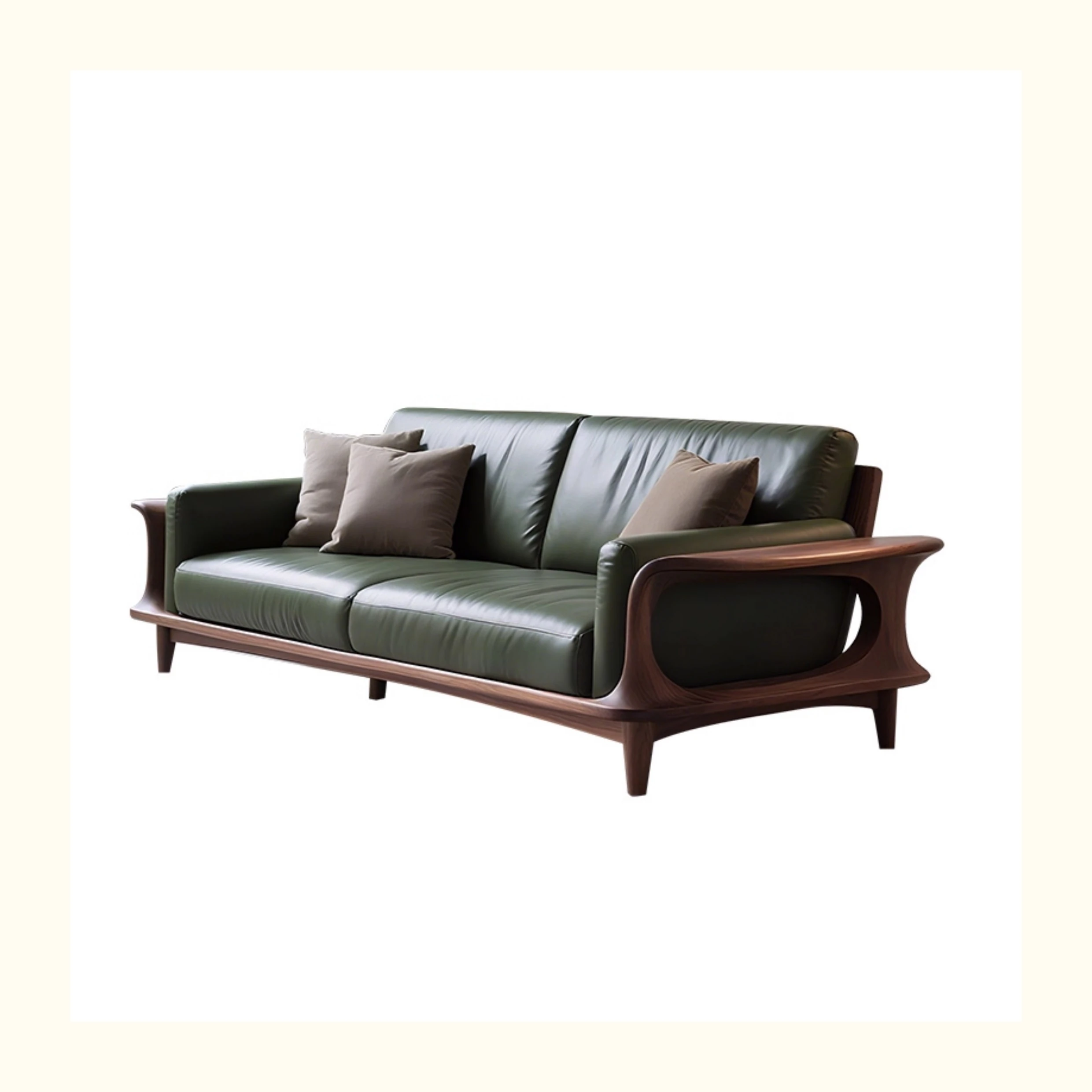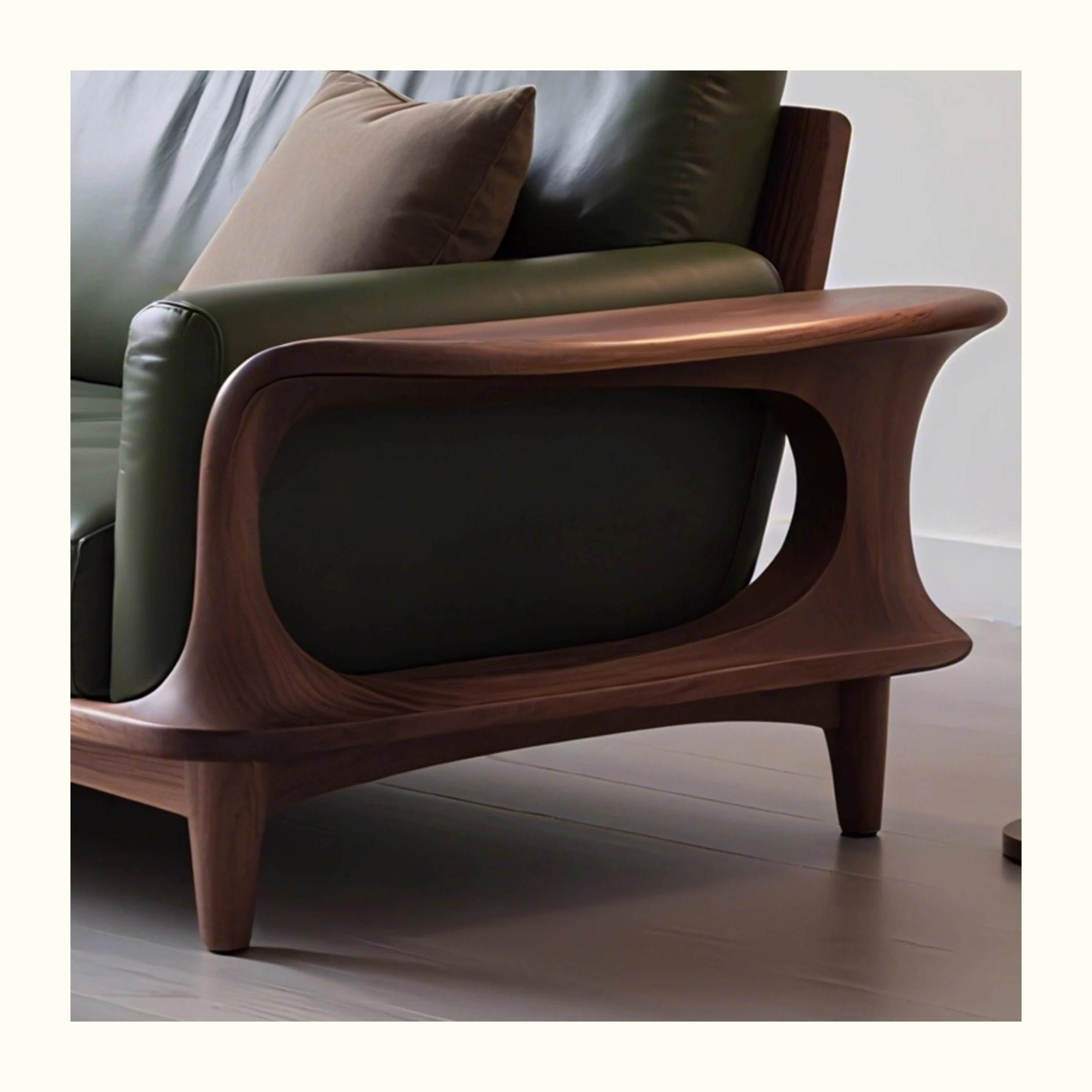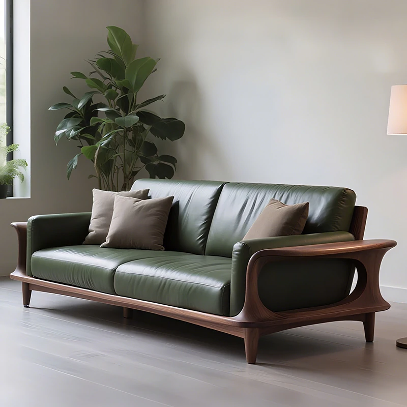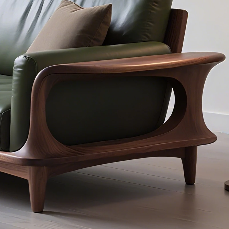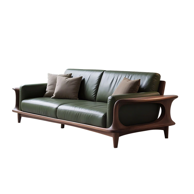 Elegant New Chinese Style Genuine Leather and Solid Wood Sofa - Premium North American Black Walnut Leather Sofa for High-End Villas and Living Rooms