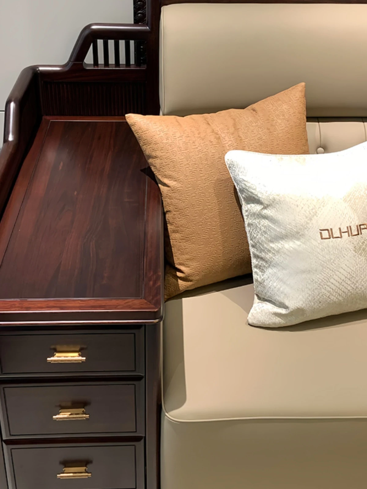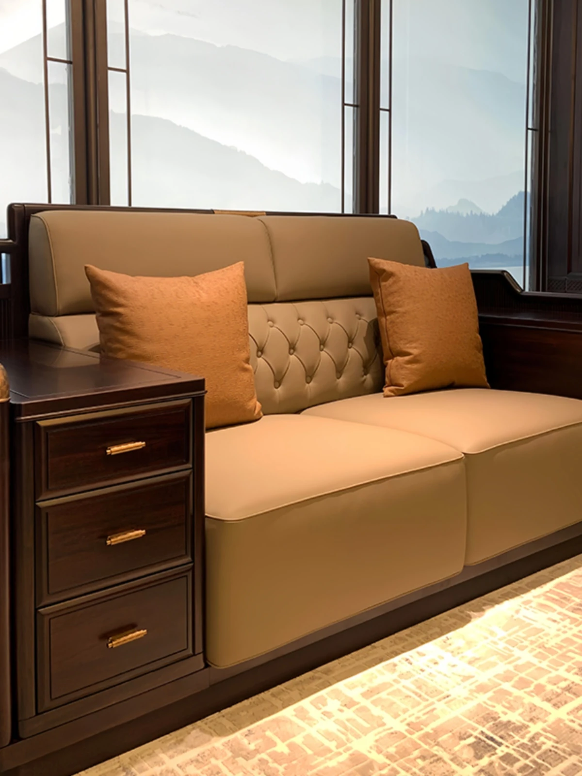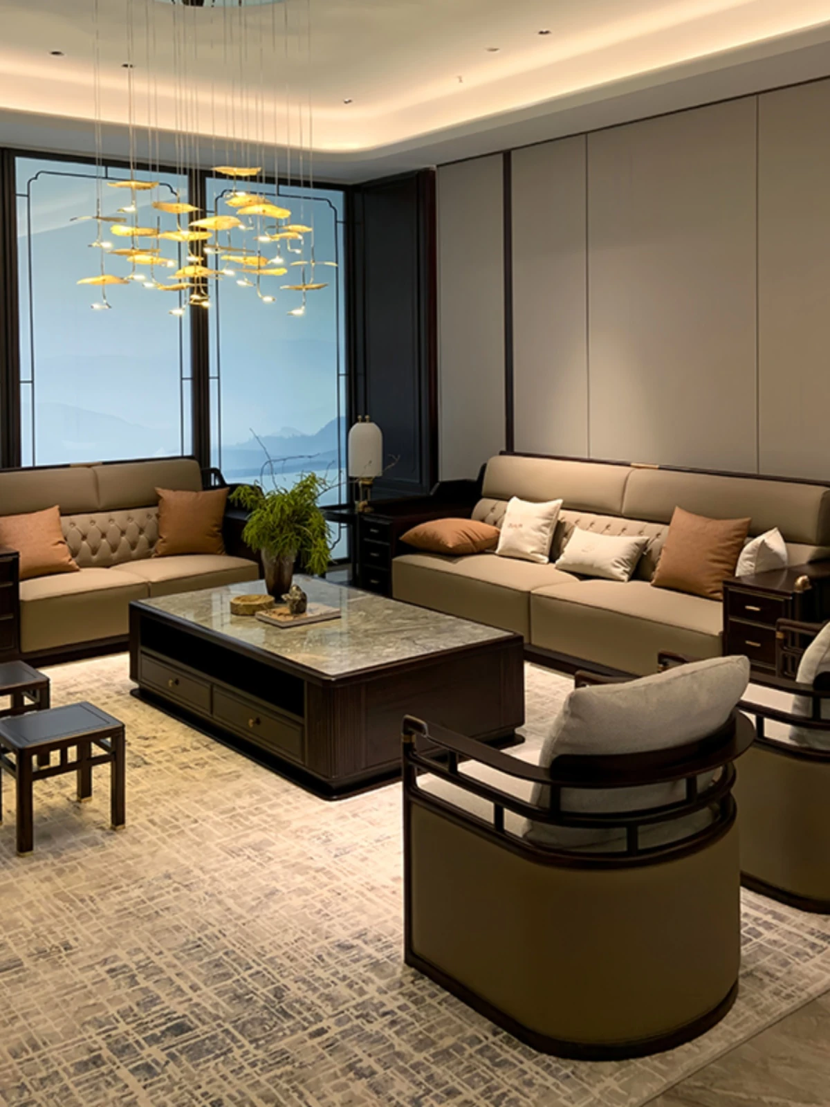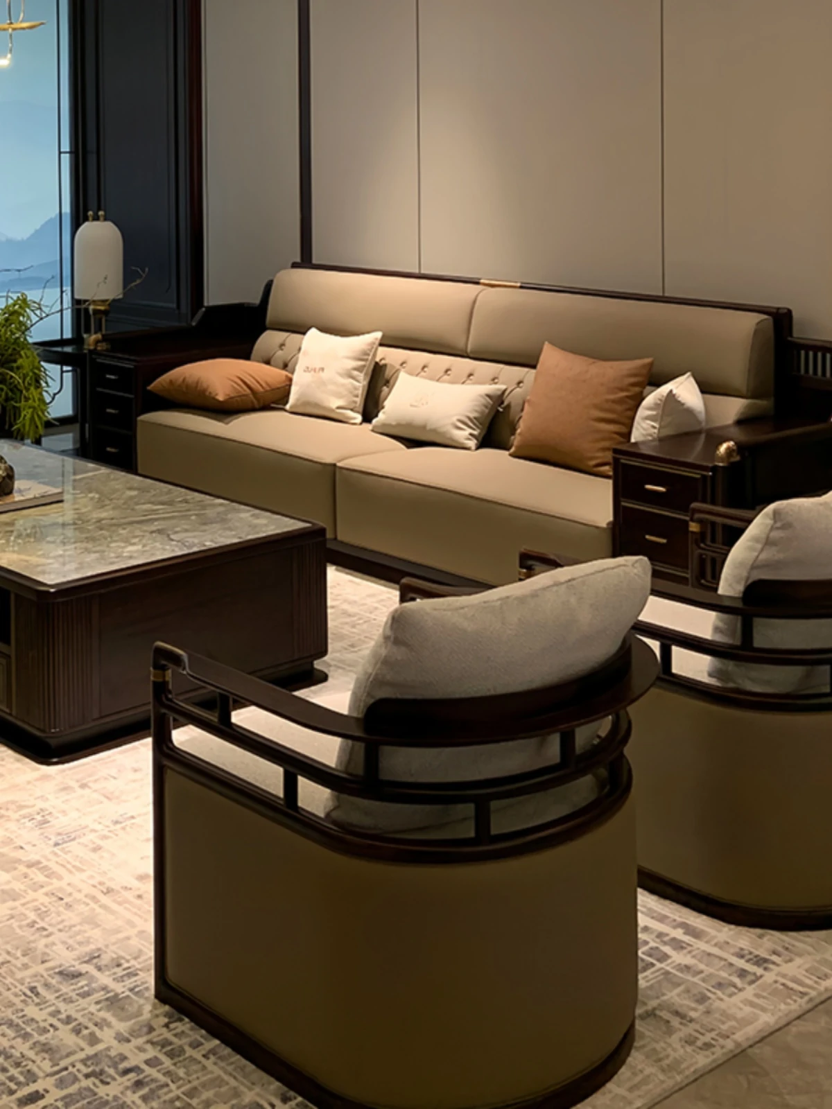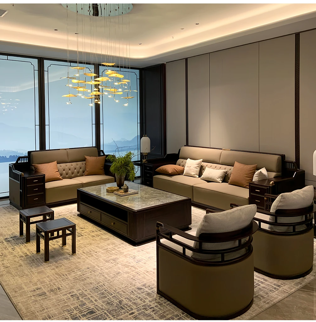 Elegant New Chinese Style Solid Wood Black Gold Sofa - Luxurious Modern Floor-Standing Design for High-End Villas and Spacious Living Rooms