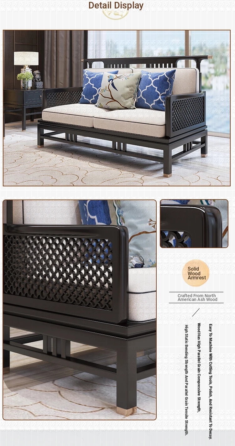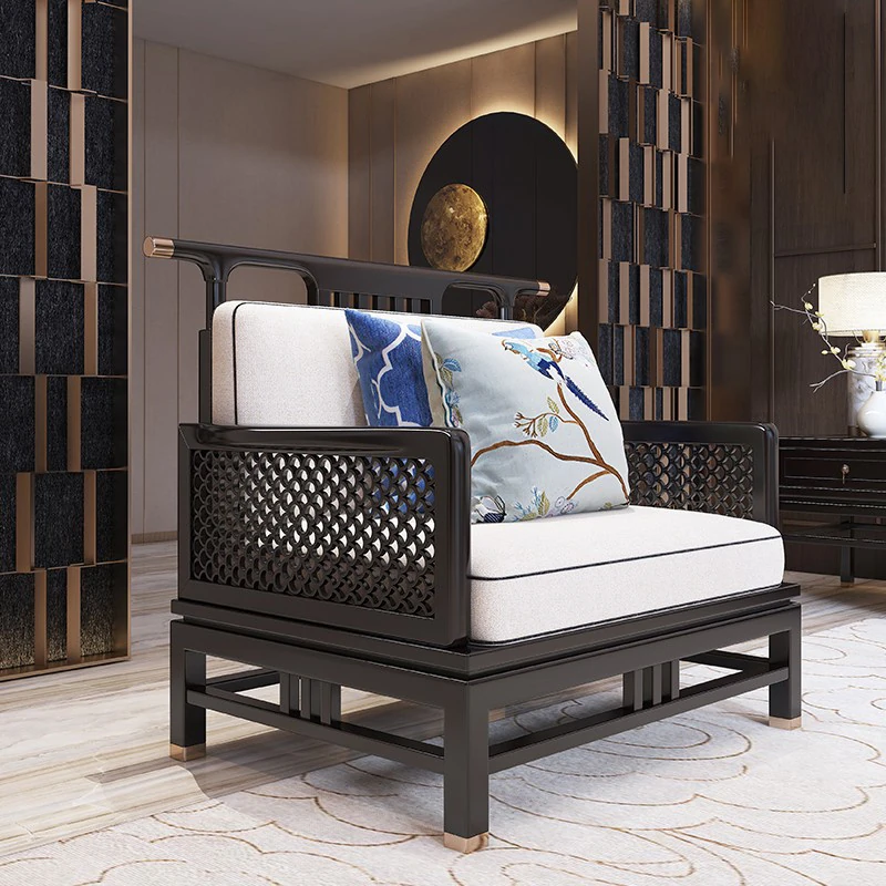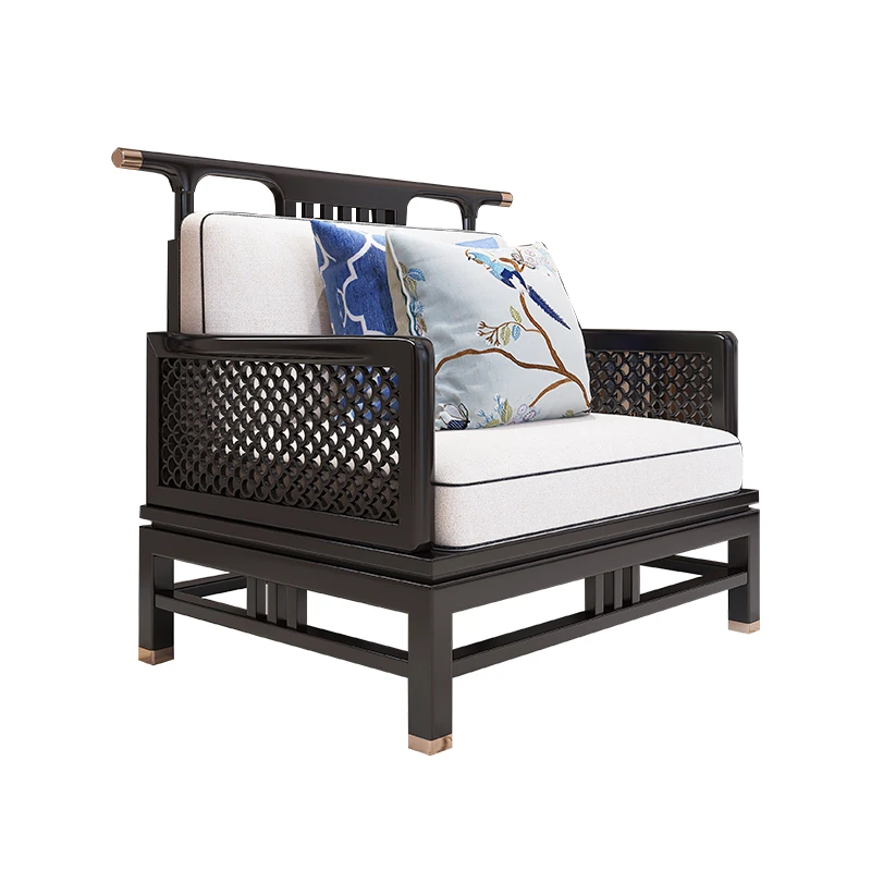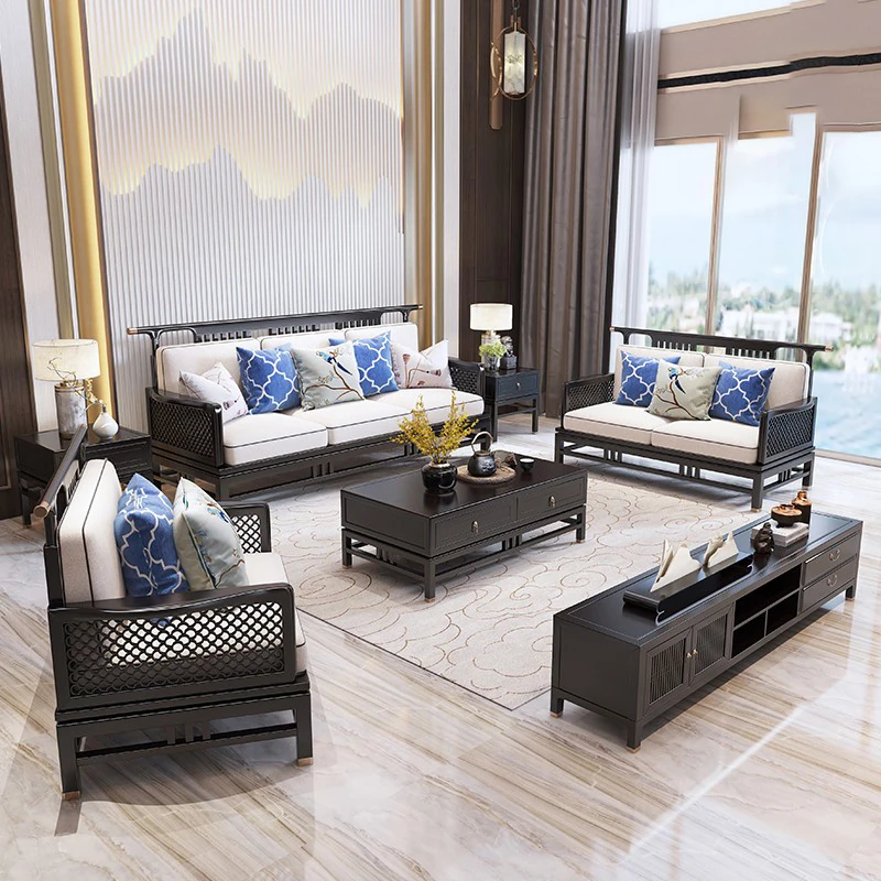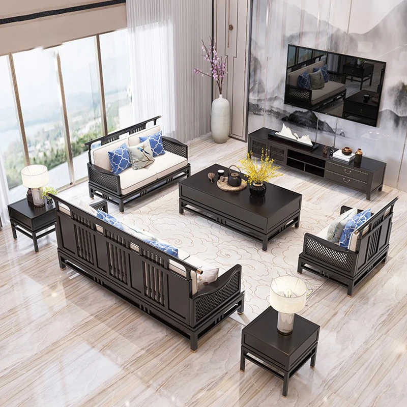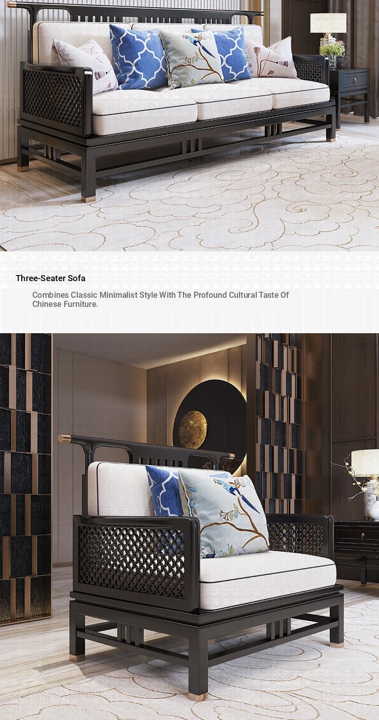 Elegant New Chinese Style Solid Wood Carved Sofa - High-End Ebony Furniture for Model Homes, Villas, and Guesthouses - Luxurious Living Room Set