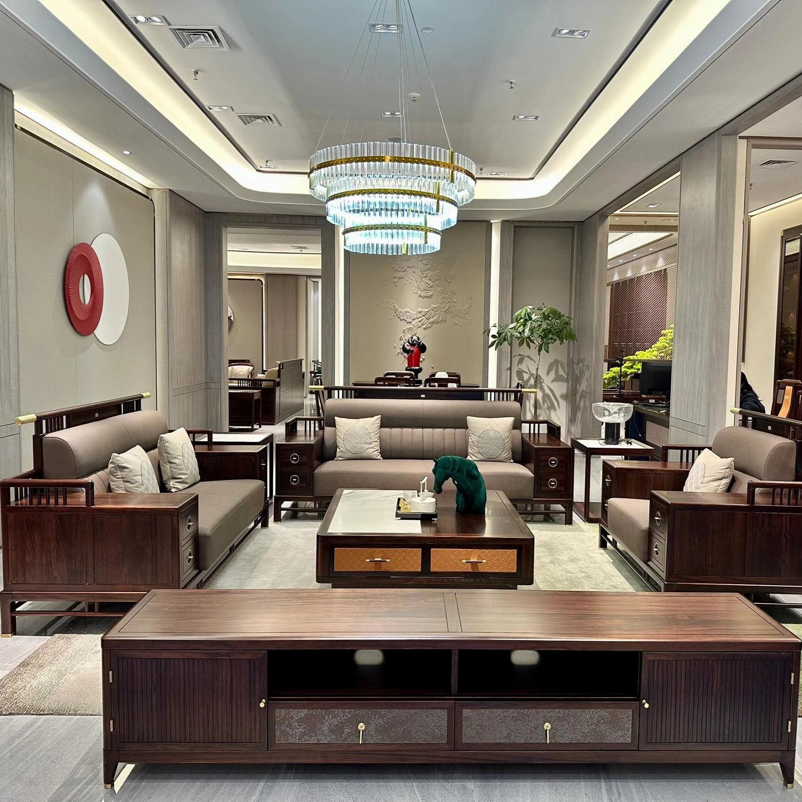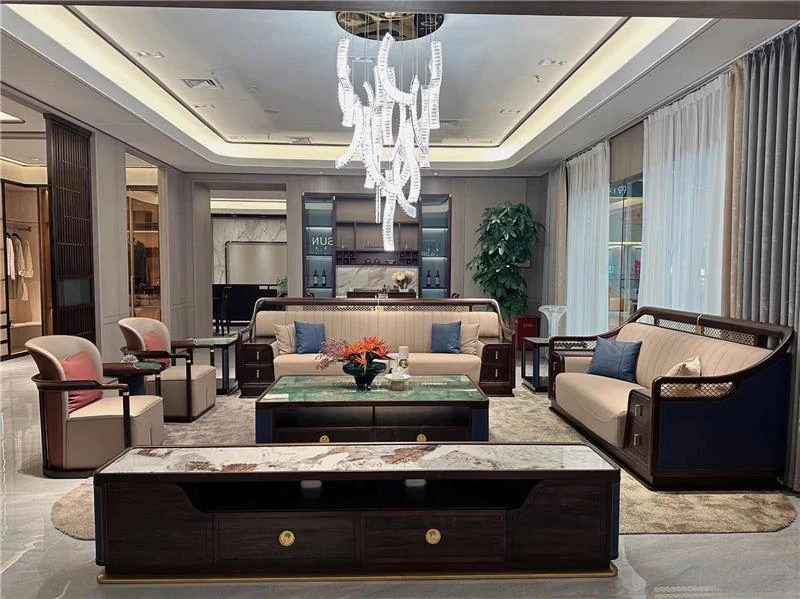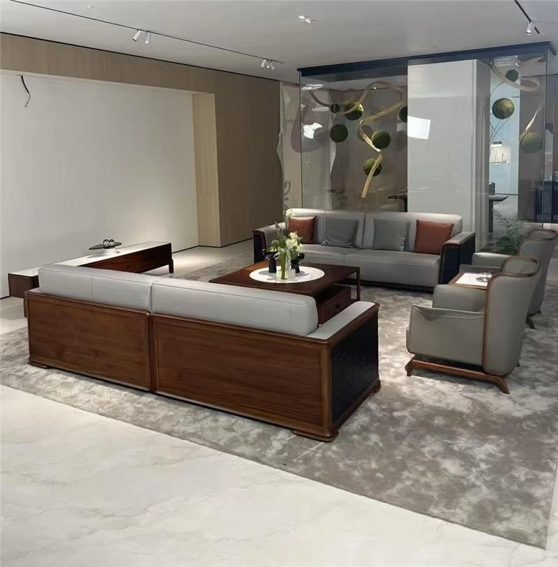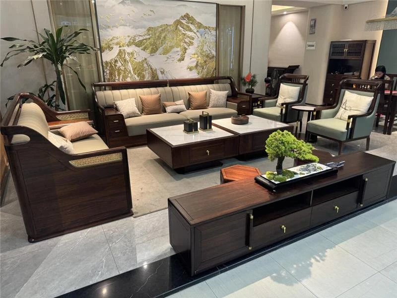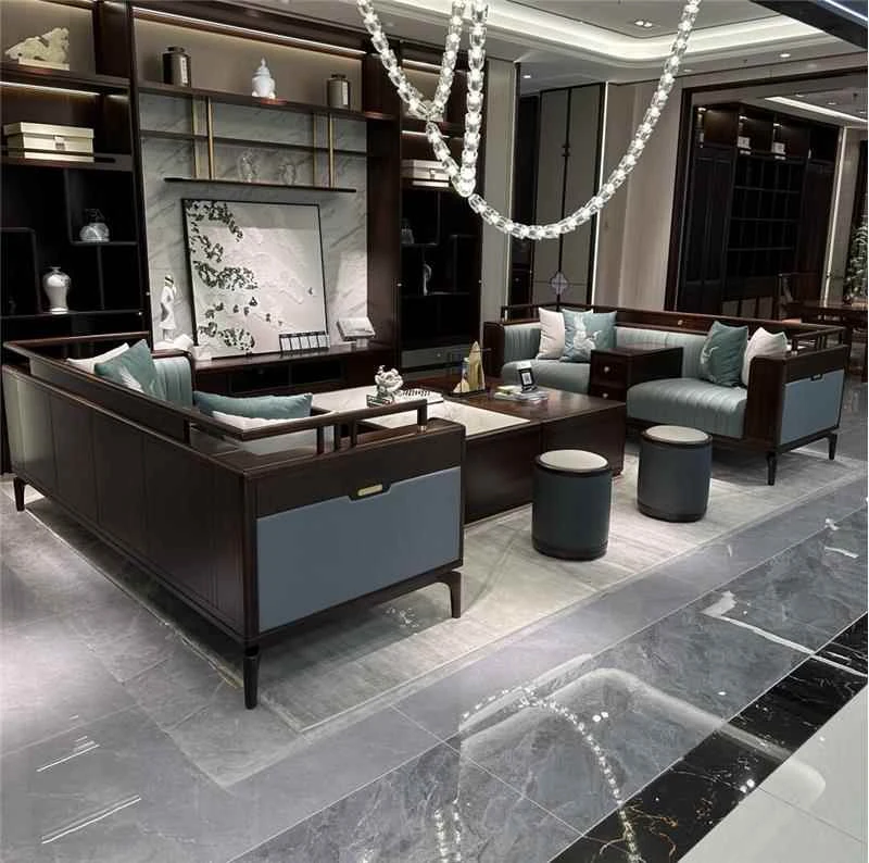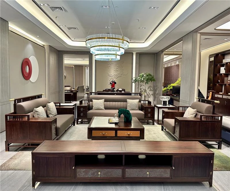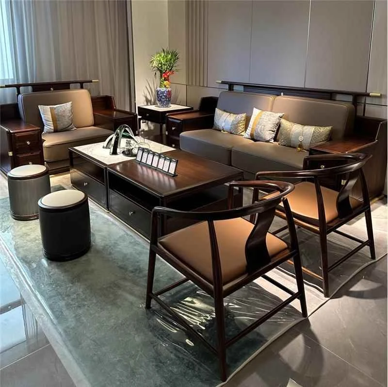Elegant New Chinese-Style Large Apartment with Black Walnut Wood Sofa - Modern Minimalist Clubhouse Luxury Flat Villa with Solid Wood Design