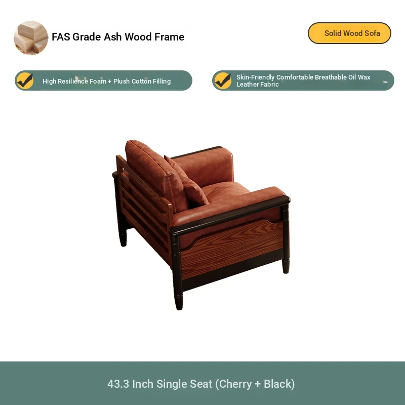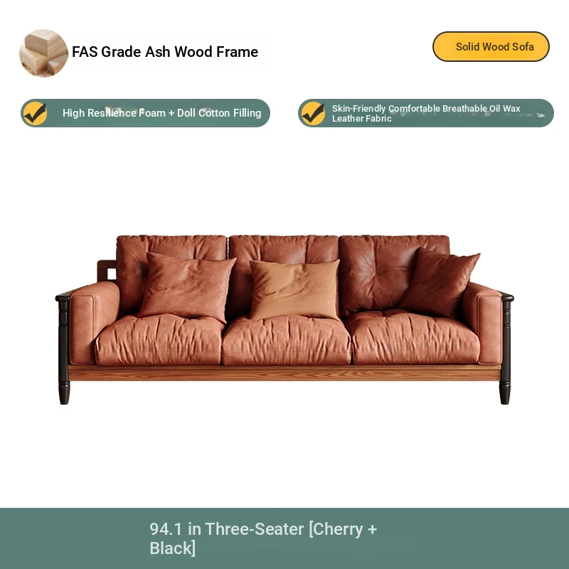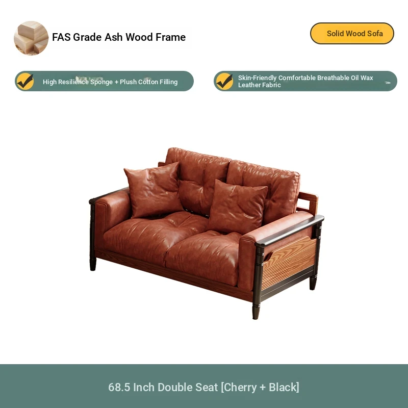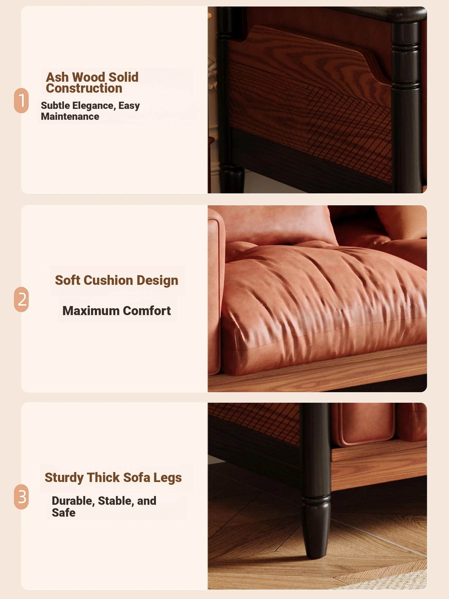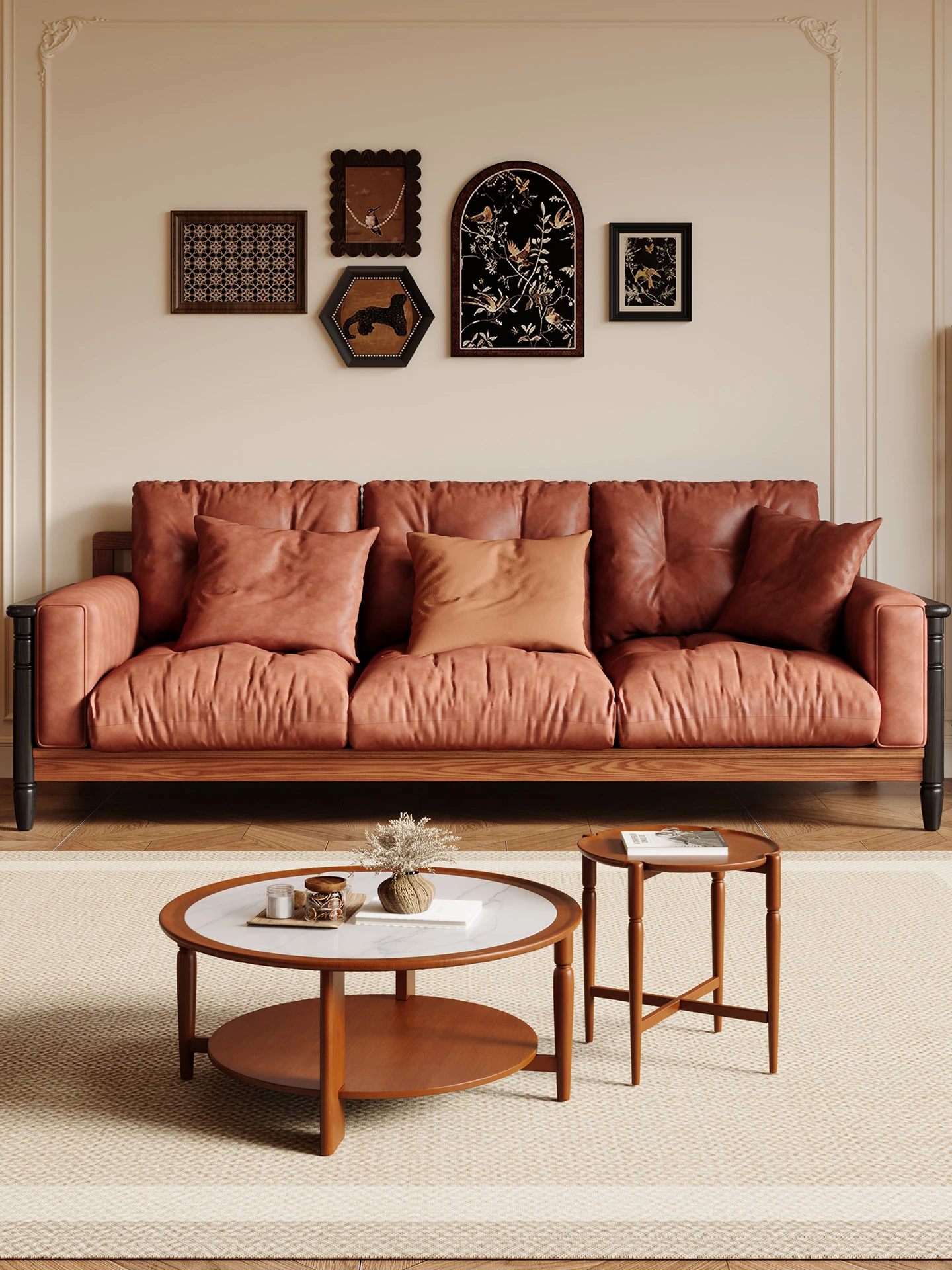 French Vintage Solid Wood Sofa Set - 3-Seater Retro Design for Small Living Rooms, Featuring Elegant Ash Wood Sofa and Coffee Table Combination