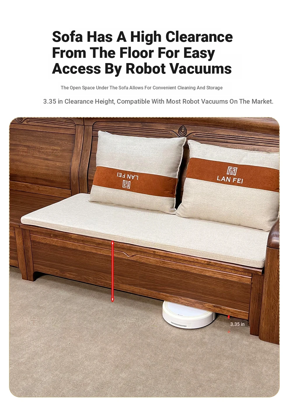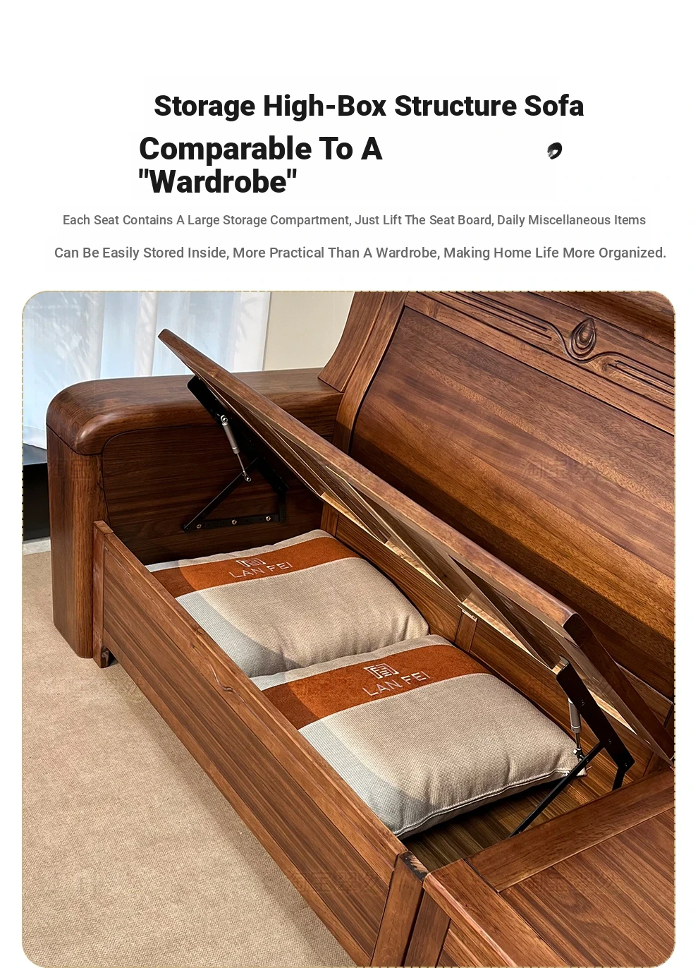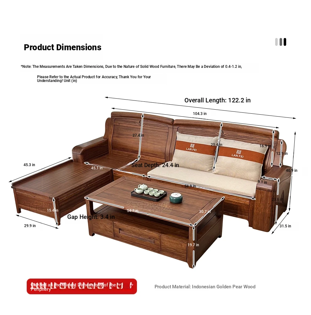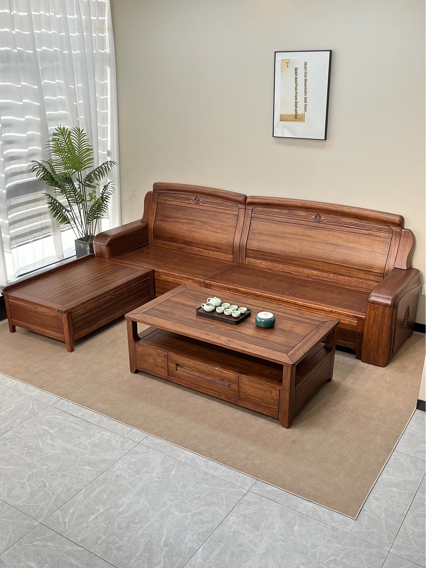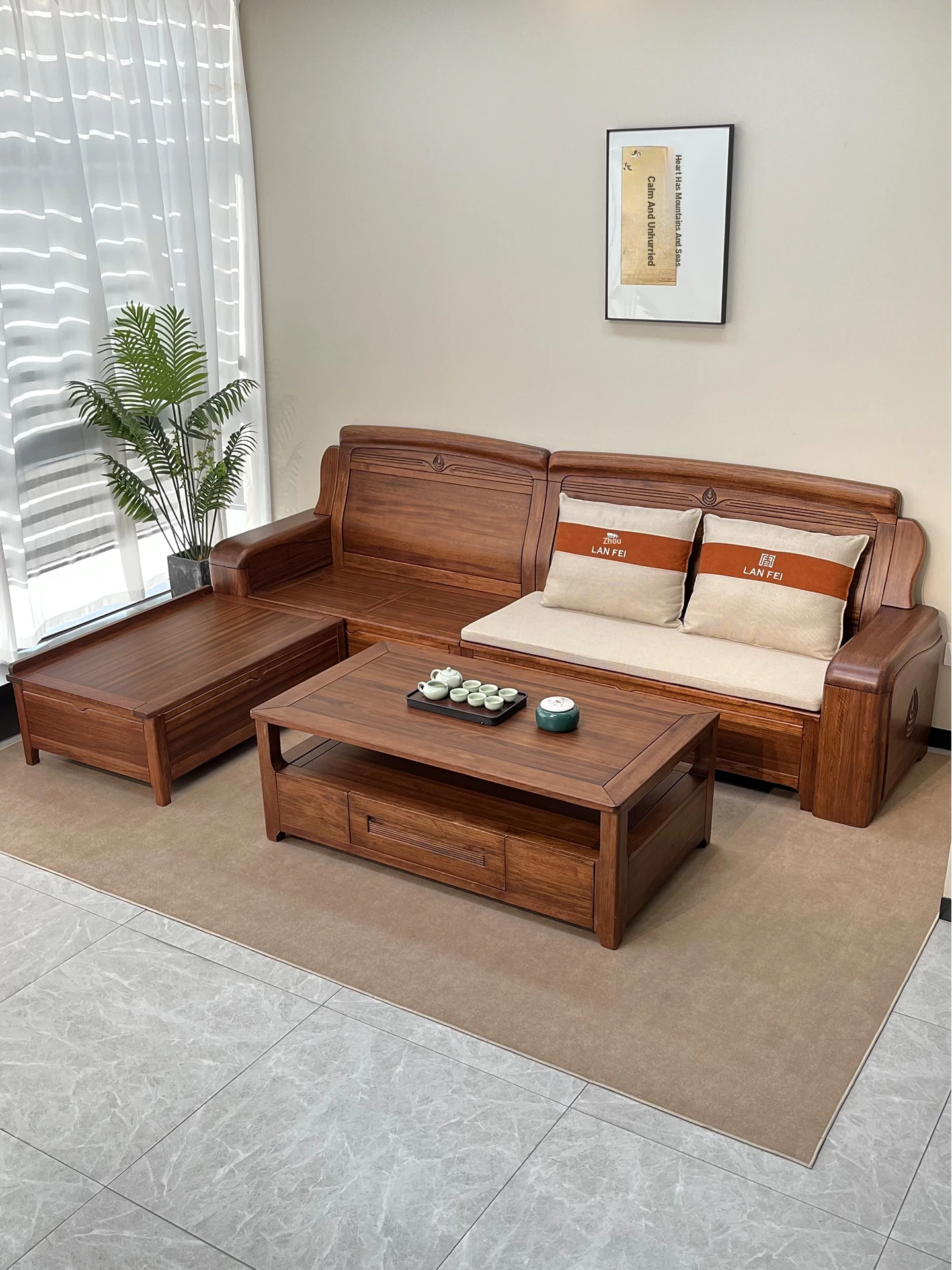 Golden Pear Wood Solid Wood Sofa Set for Small Living Rooms - 5-Seater, Dual-Season Use with Chaise Lounge and Storage, Elegant Chinese Furniture