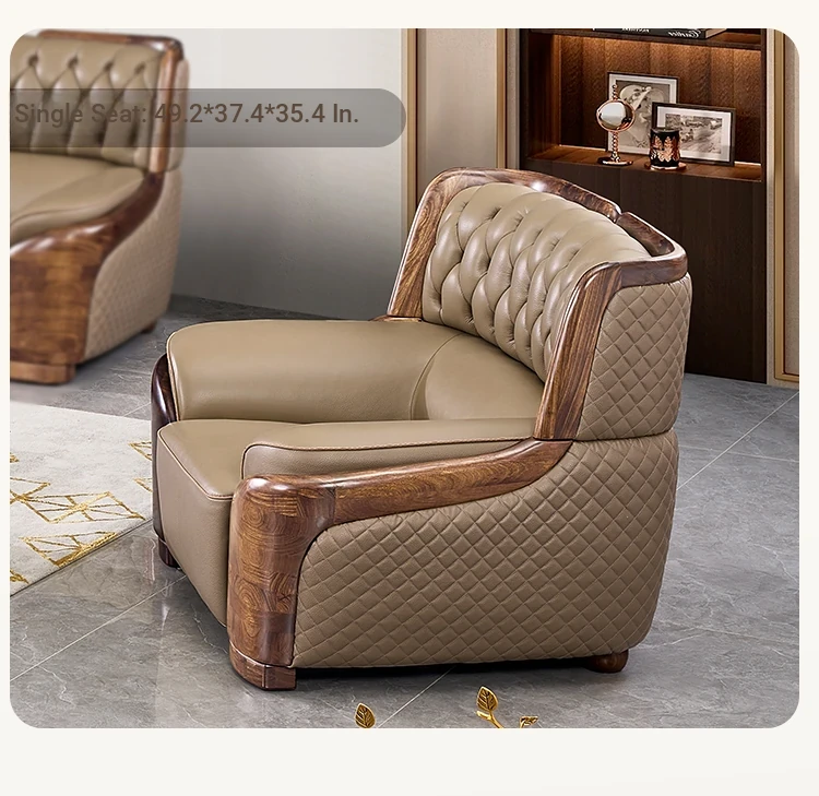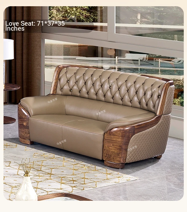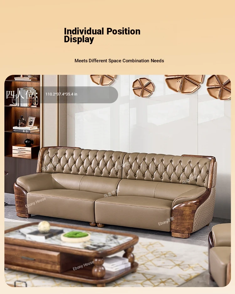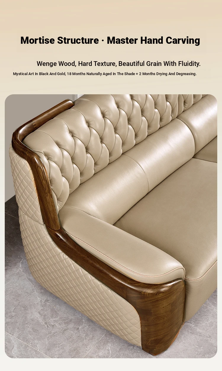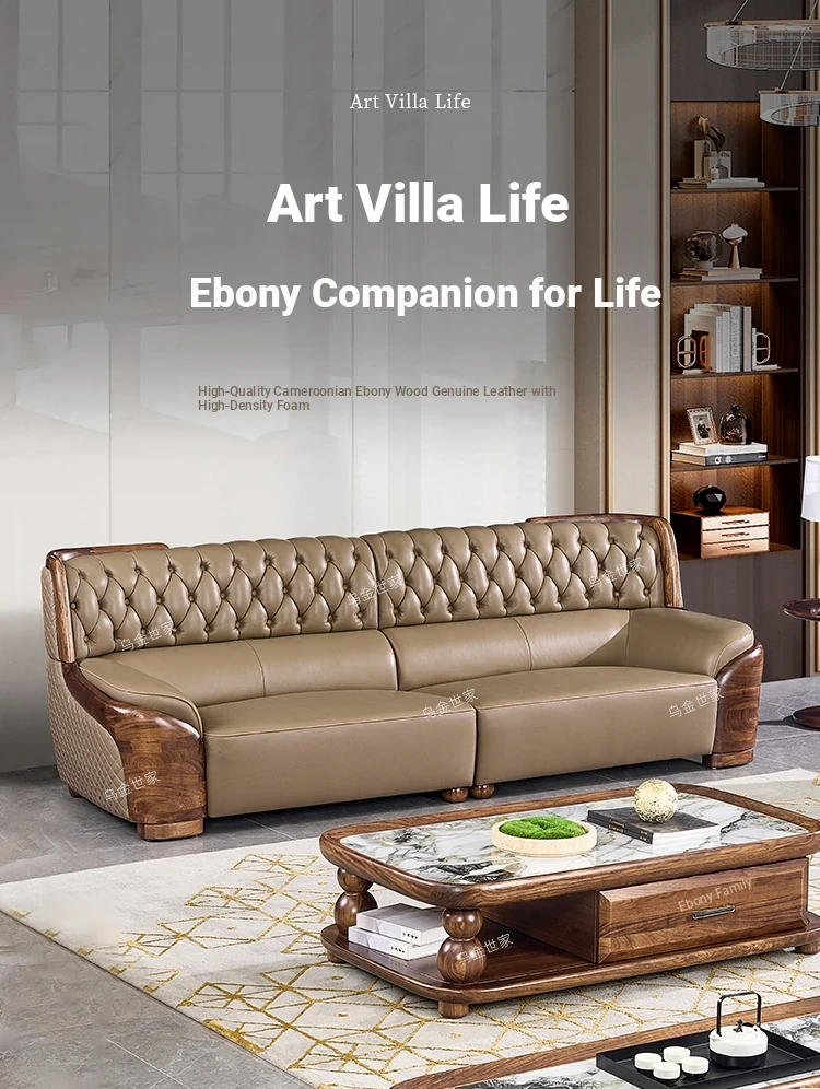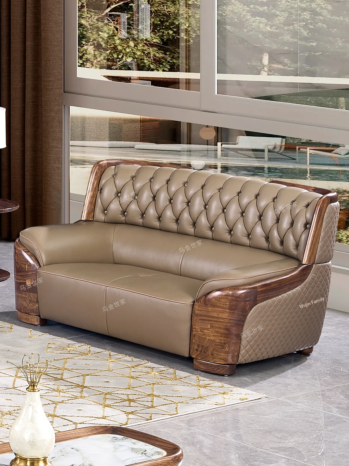 Luxury New Chinese Style Black Gold Wood Genuine Leather Sofa Set - Top Grain Cowhide, Elegant High-End Villa, European Modern Straight Sectional Design