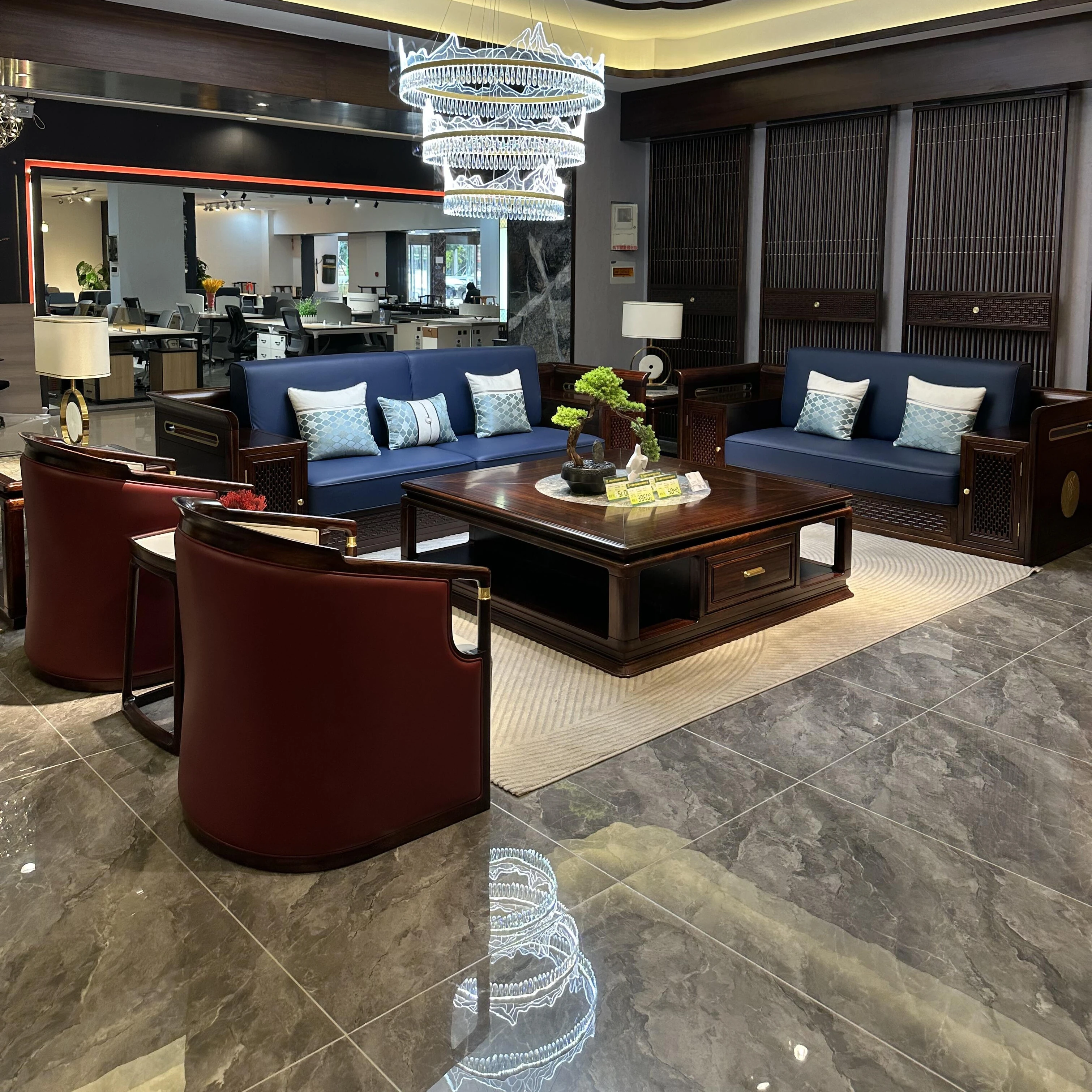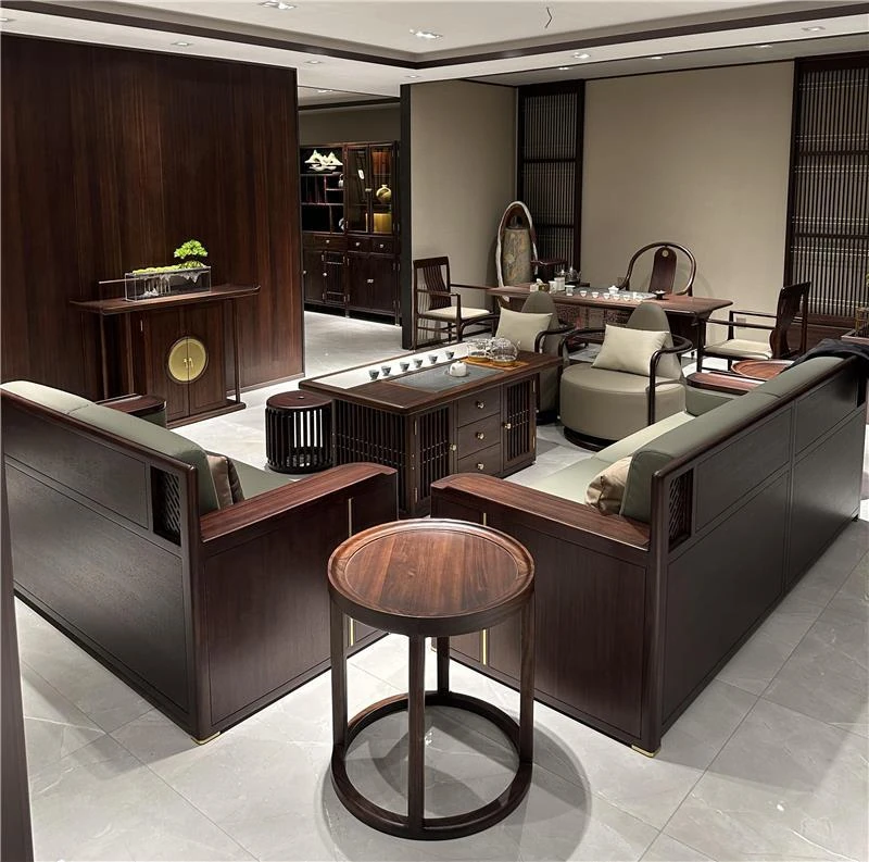 Luxury Villa Clubhouse Model Home - Modern Minimalist Bedroom with Solid Wood Sofa in New Chinese Style, Featuring Premium Black Wood Finish