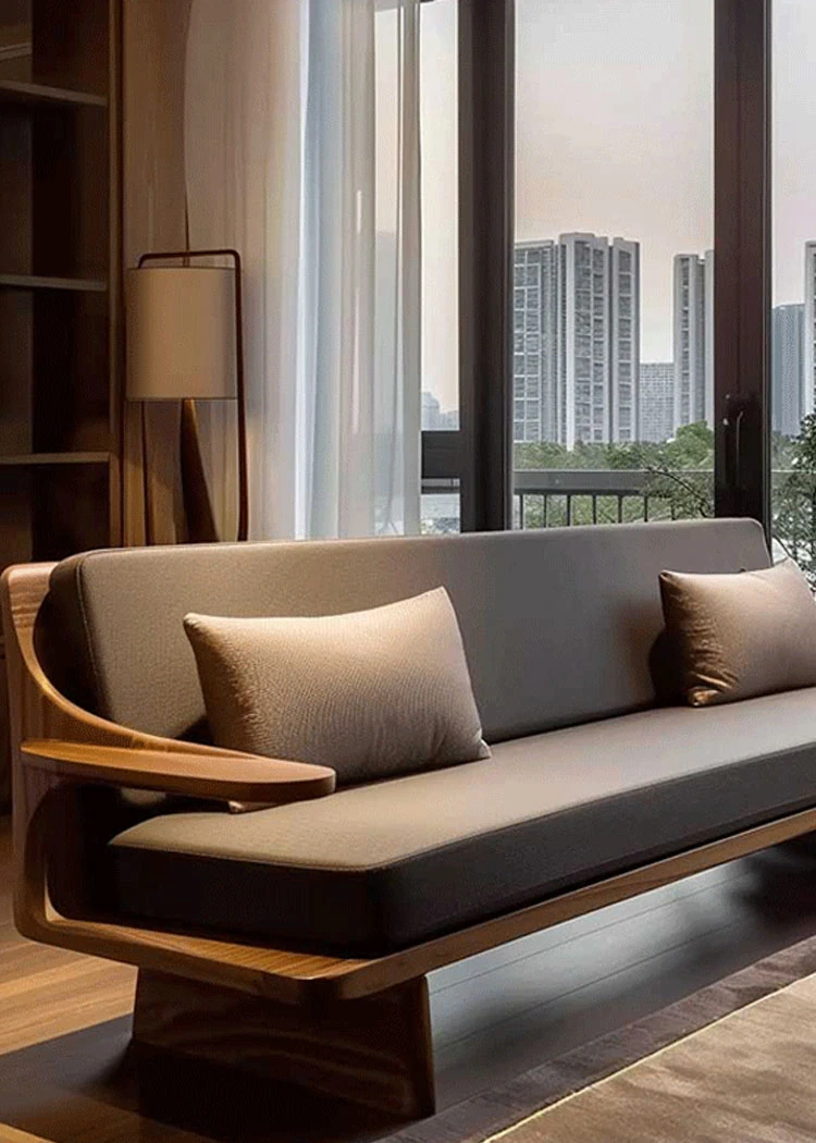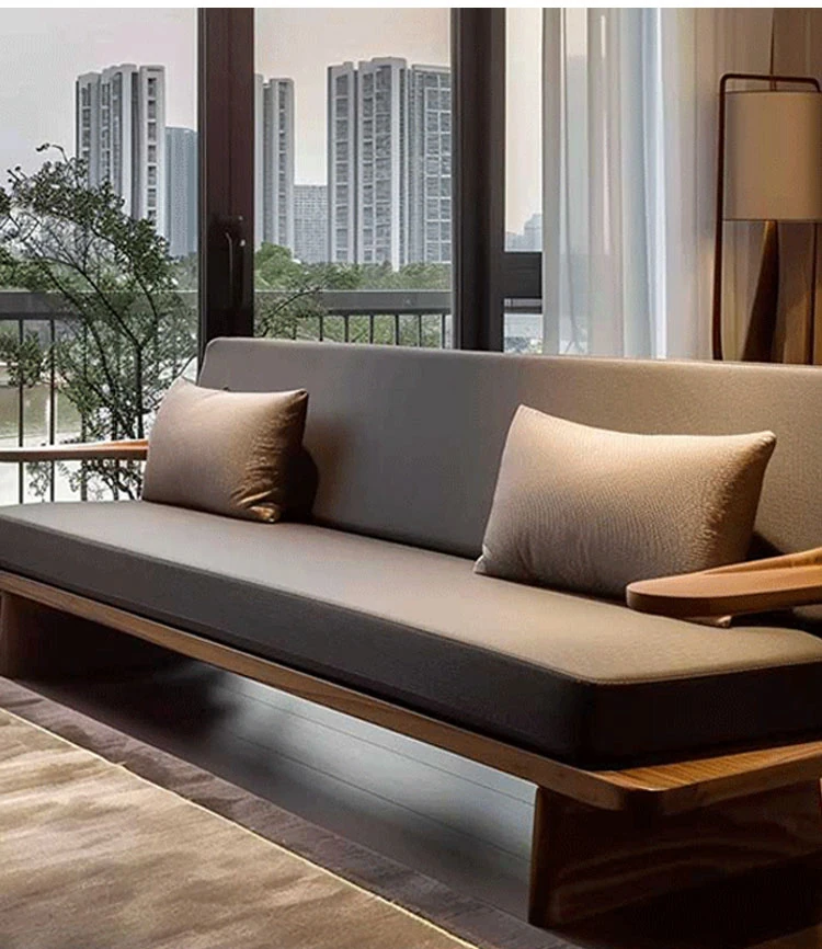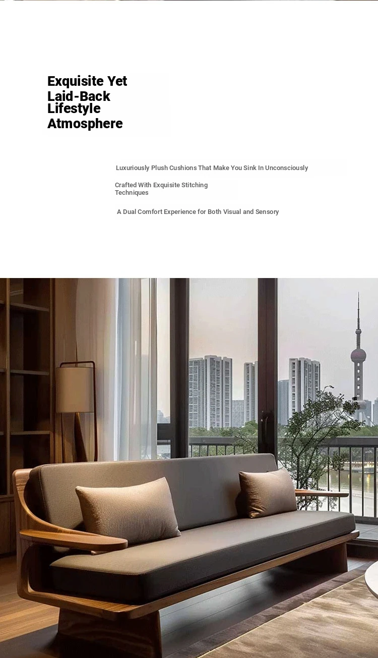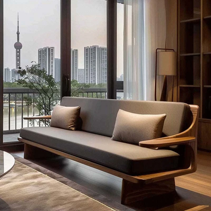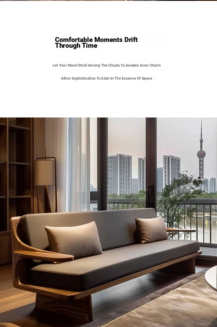 Modern Zen Style Solid Wood Sofa in North American Black Walnut – High-End Real Leather, Minimalist Design for Hotels and Homestays
