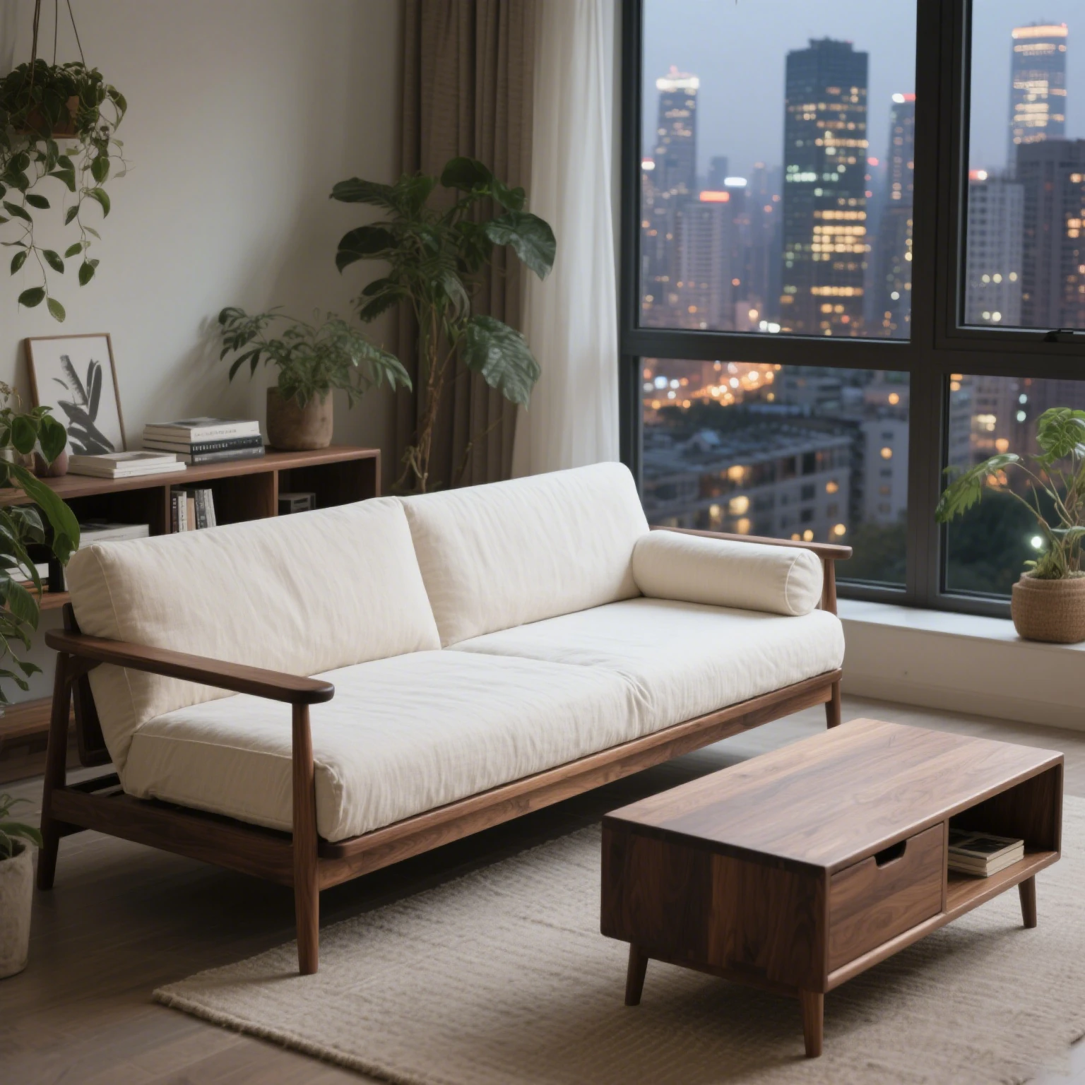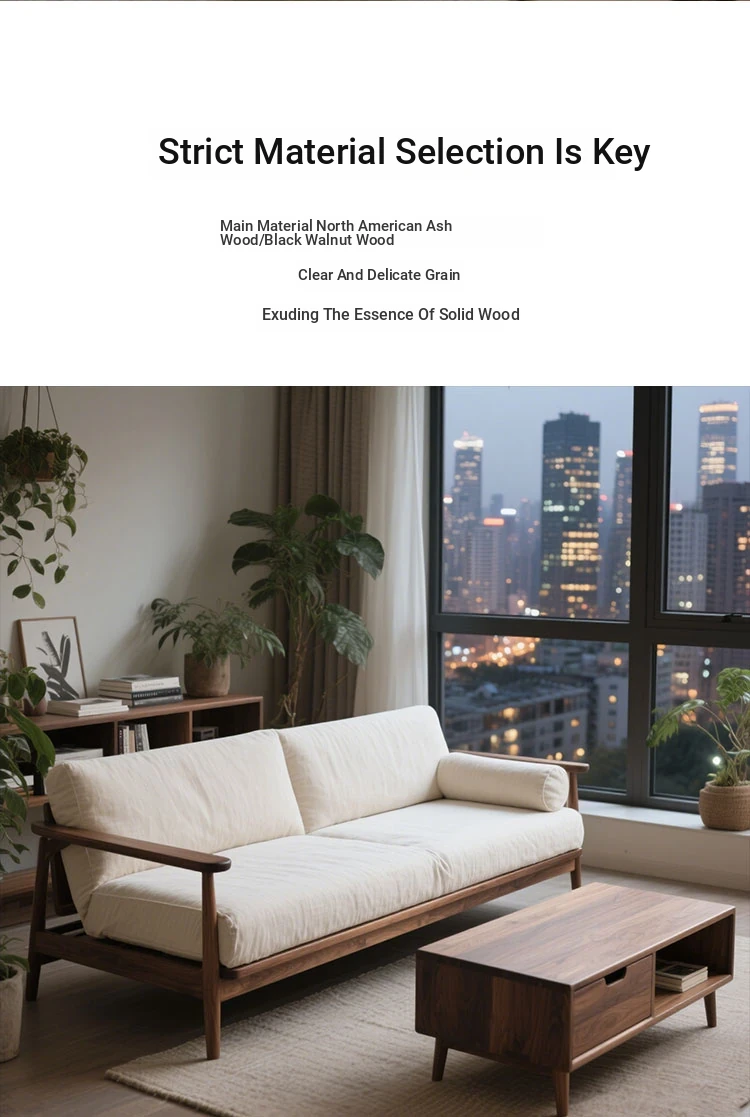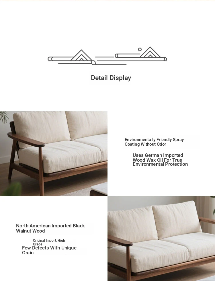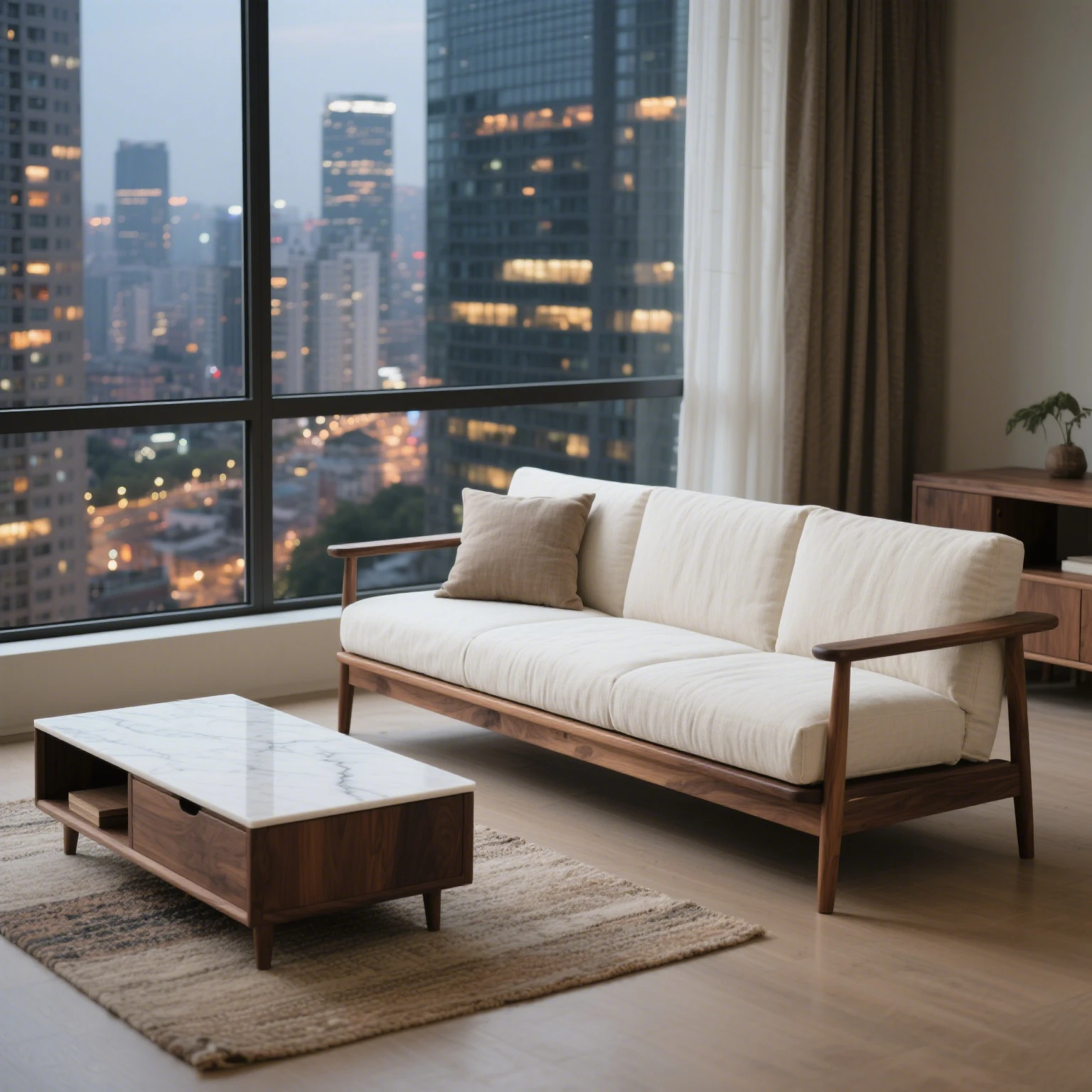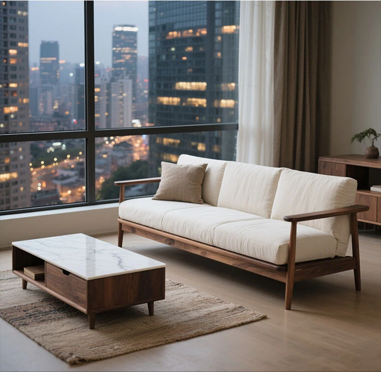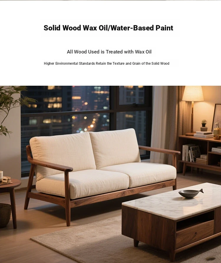 Sofa and Coffee Table Set in North American Black Walnut - Solid Wood, Japanese Wabi-Sabi Aesthetic, Perfect for Cozy Guesthouses and Elegant Living Rooms