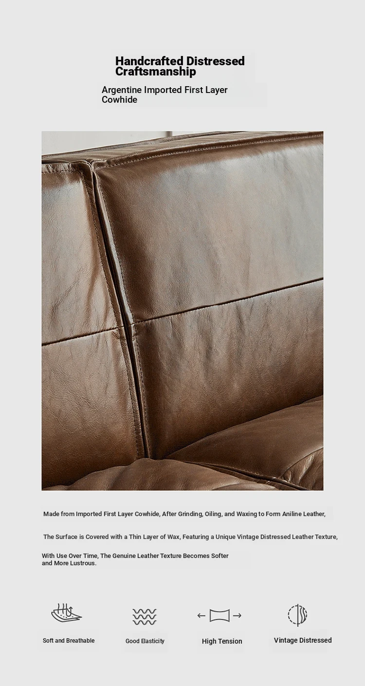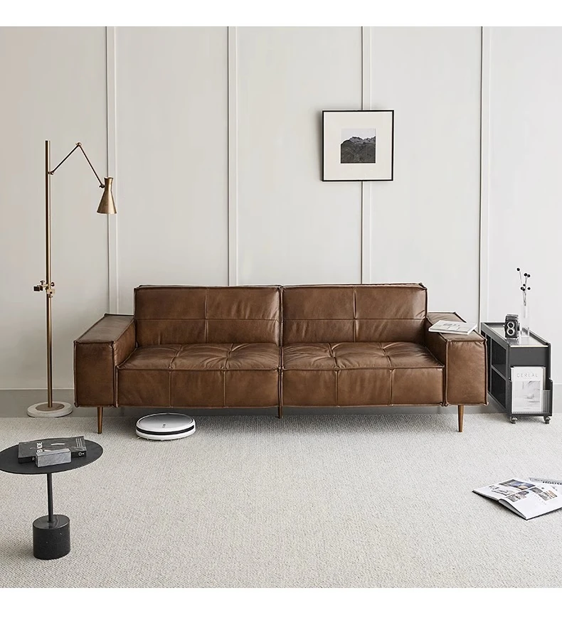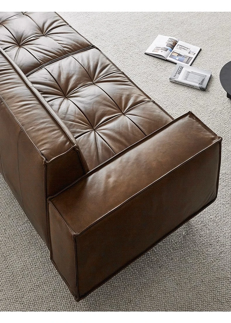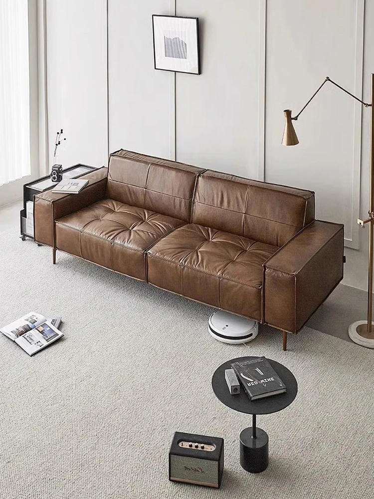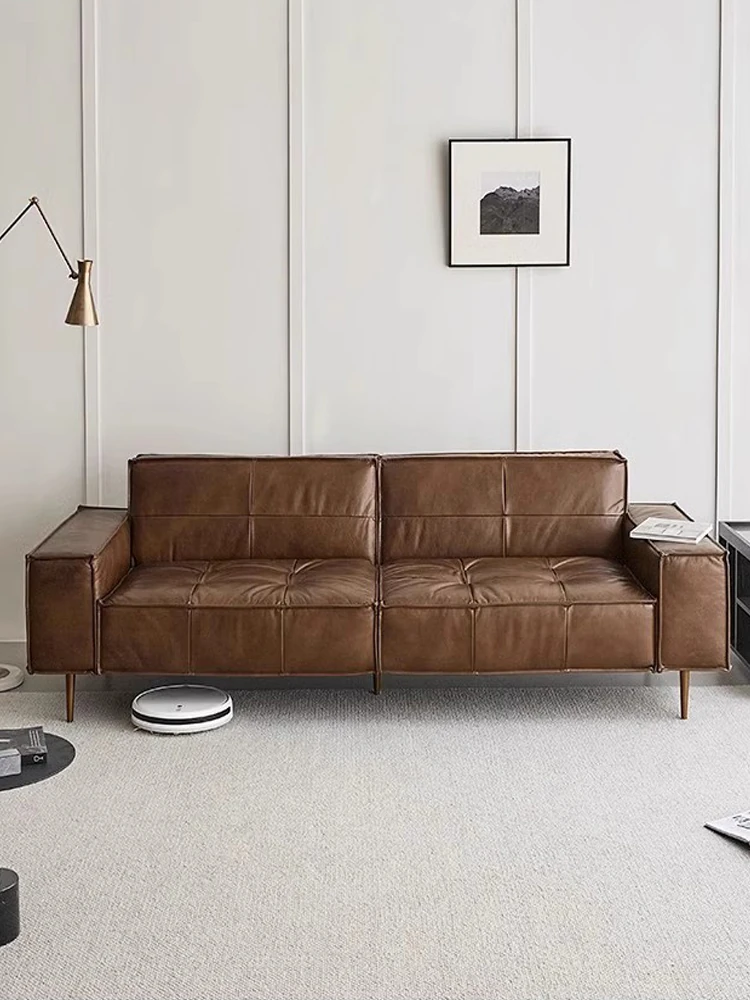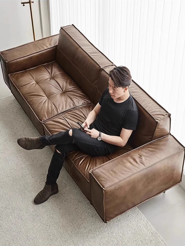 Vintage Retro Waxed Leather Sofa - Genuine Top-Grain Cowhide for Small Living Rooms - Stylish American-Style Block Design