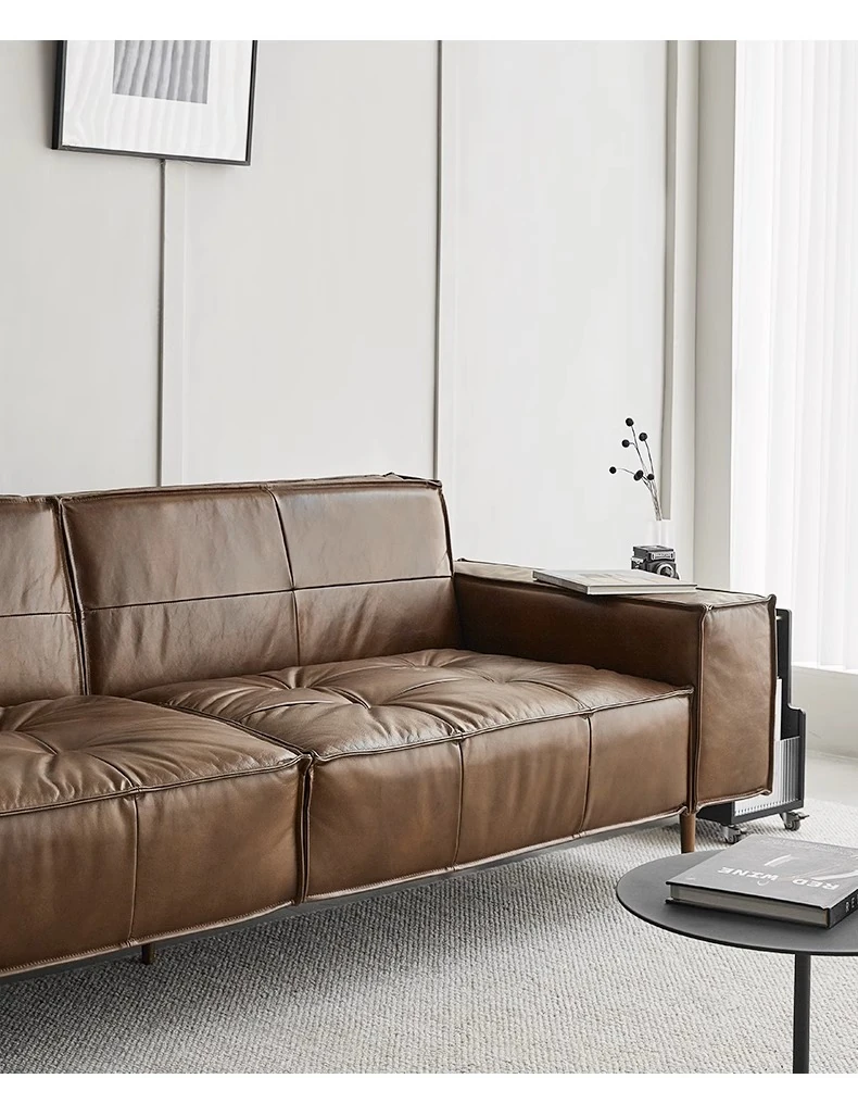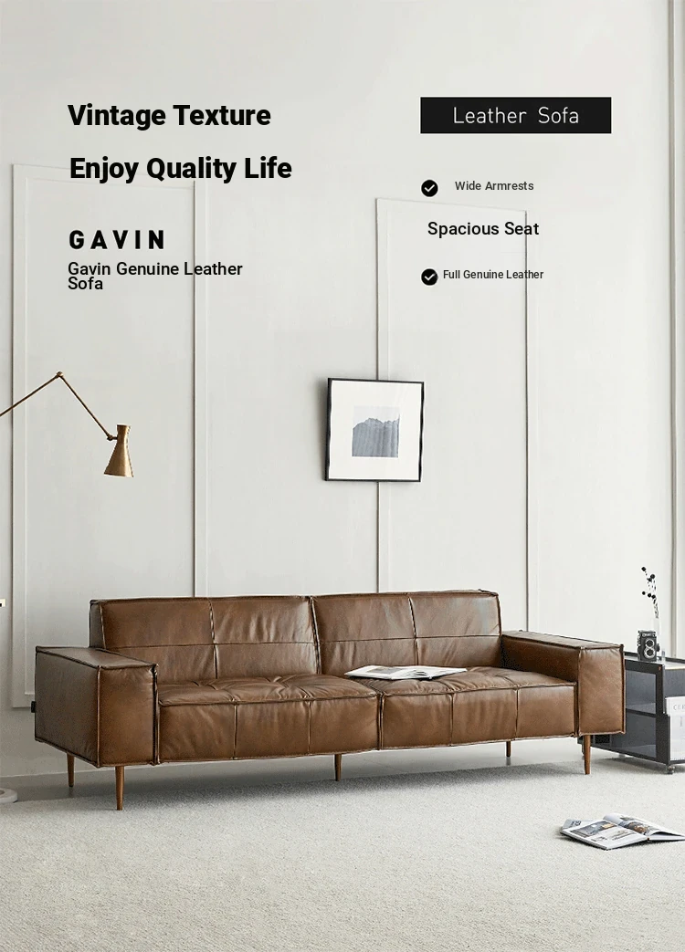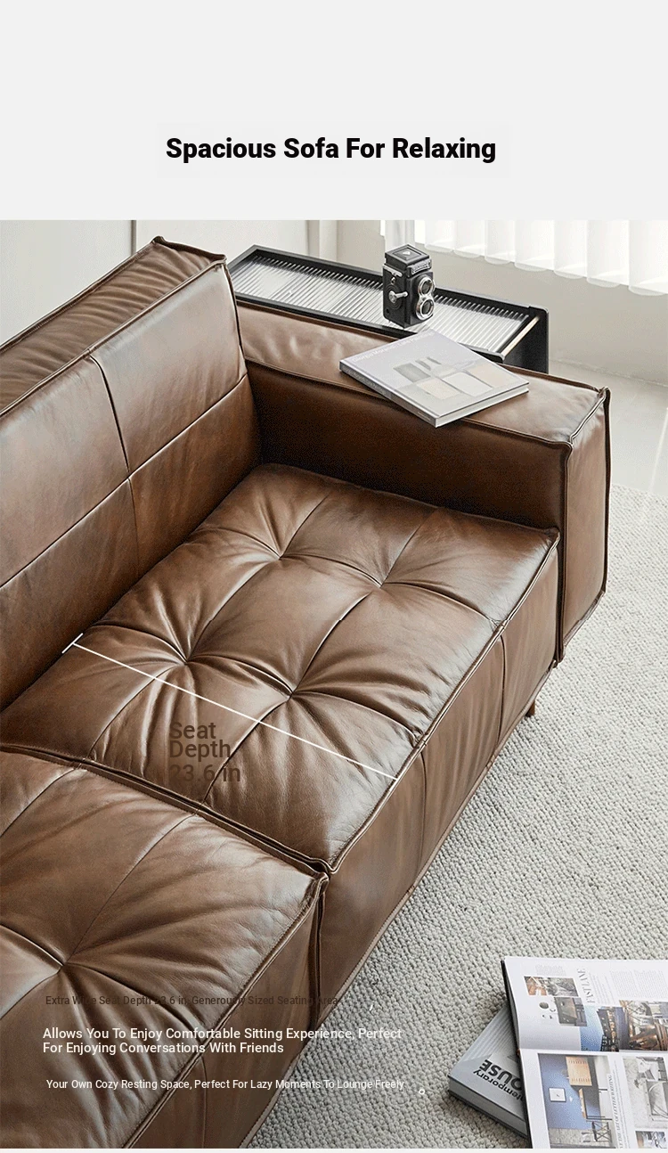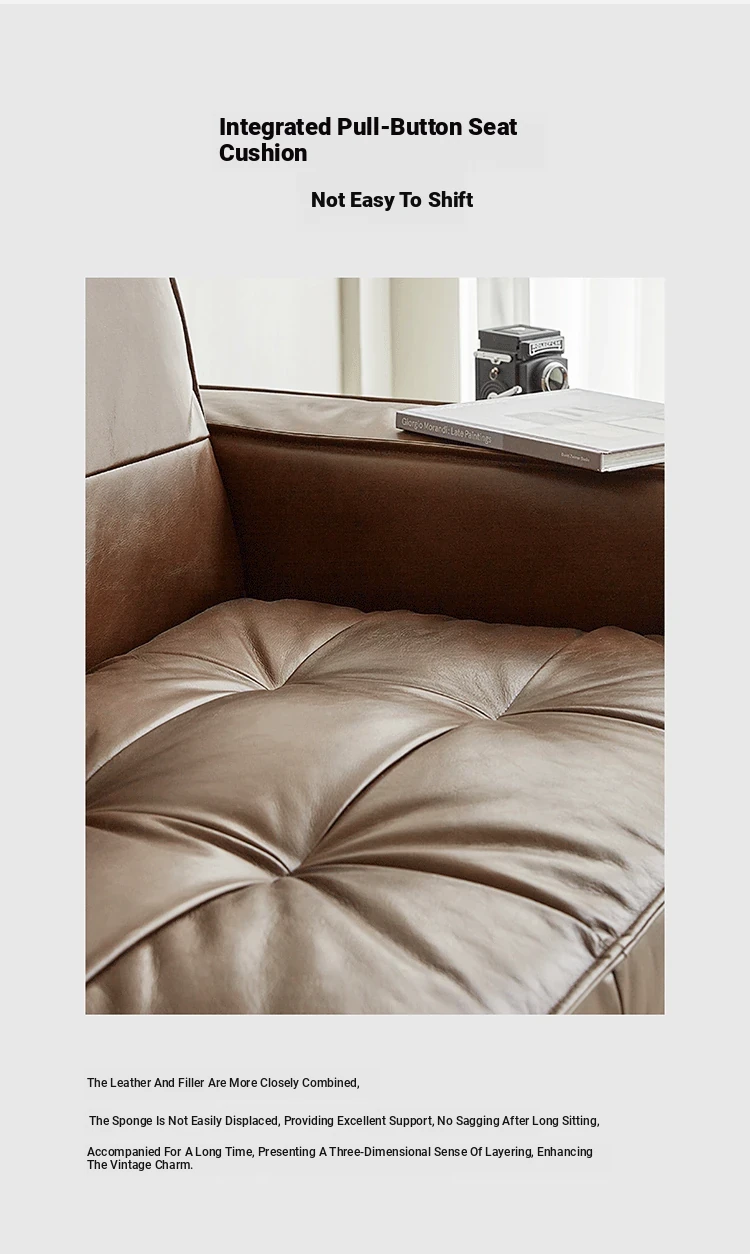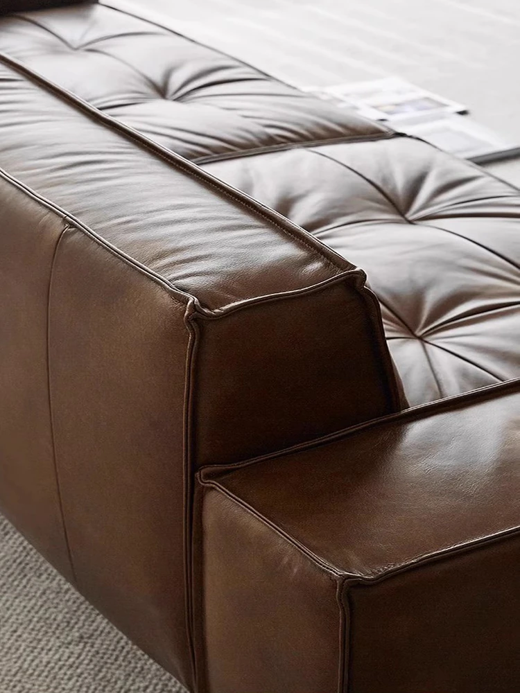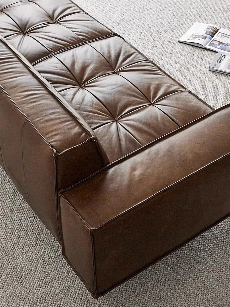 Vintage Retro Waxed Leather Sofa - Genuine Top-Grain Cowhide for Small Living Rooms - Stylish American-Style Block Design