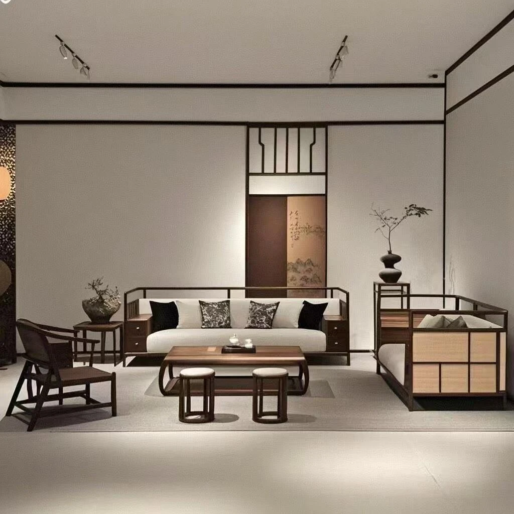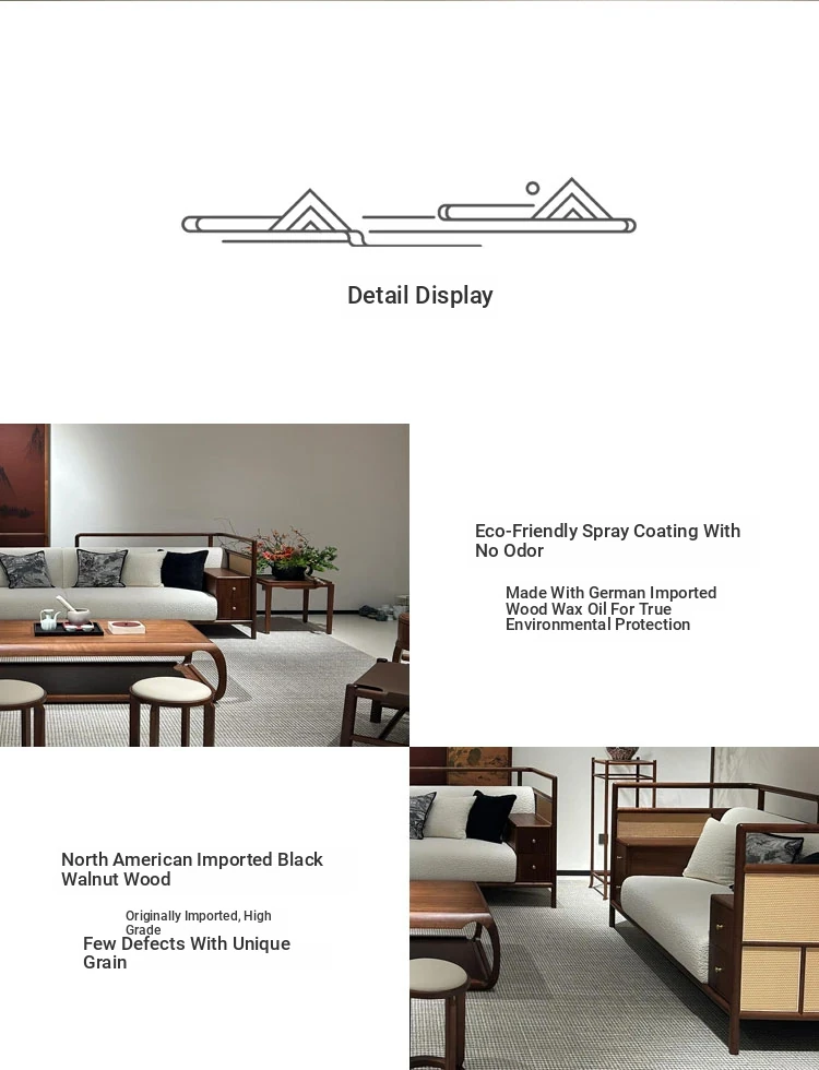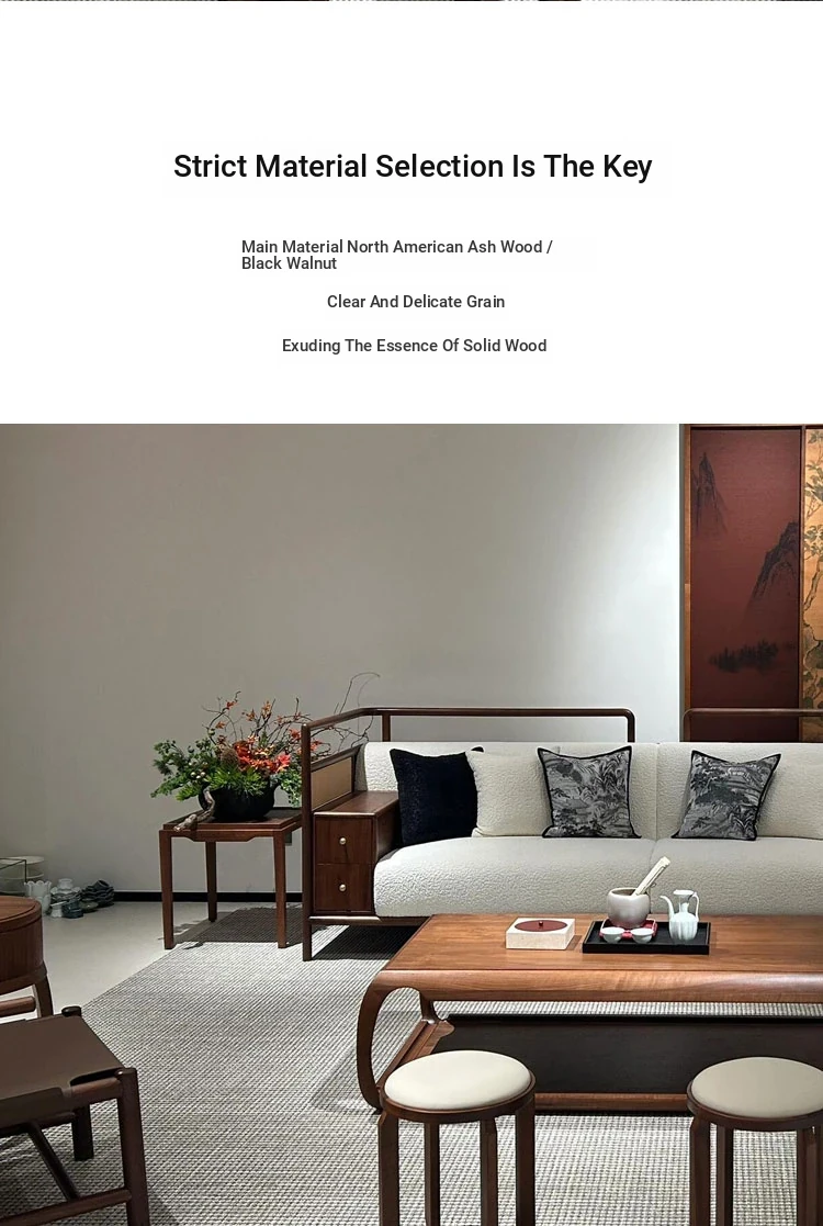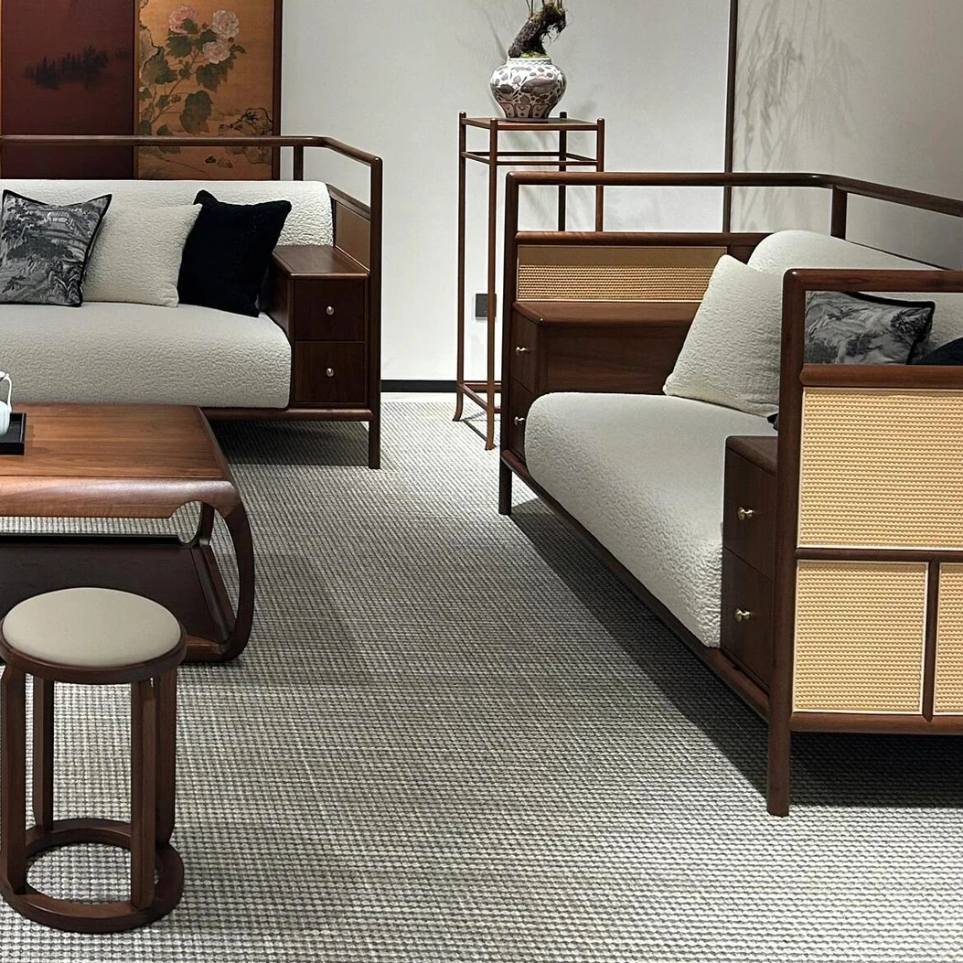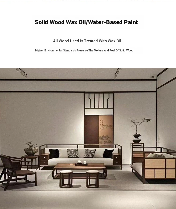 Zen-Inspired New Chinese Style Black Walnut Sofa and Tea Table Set with White Wax Wood and Genuine Leather - Perfect for Offices, Hotels, and Guesthouses