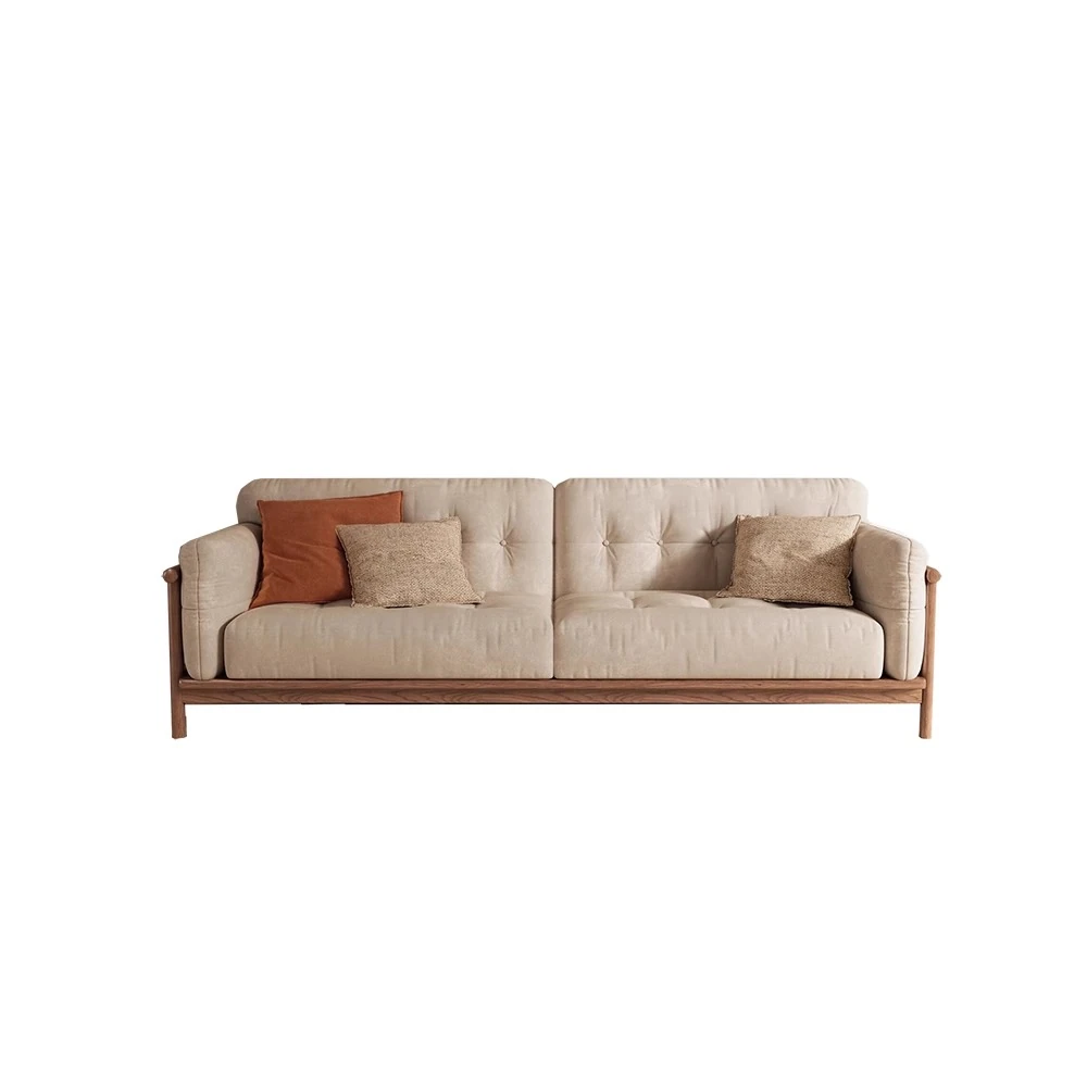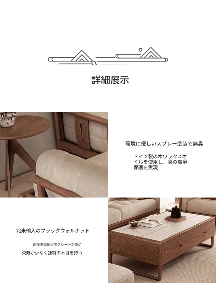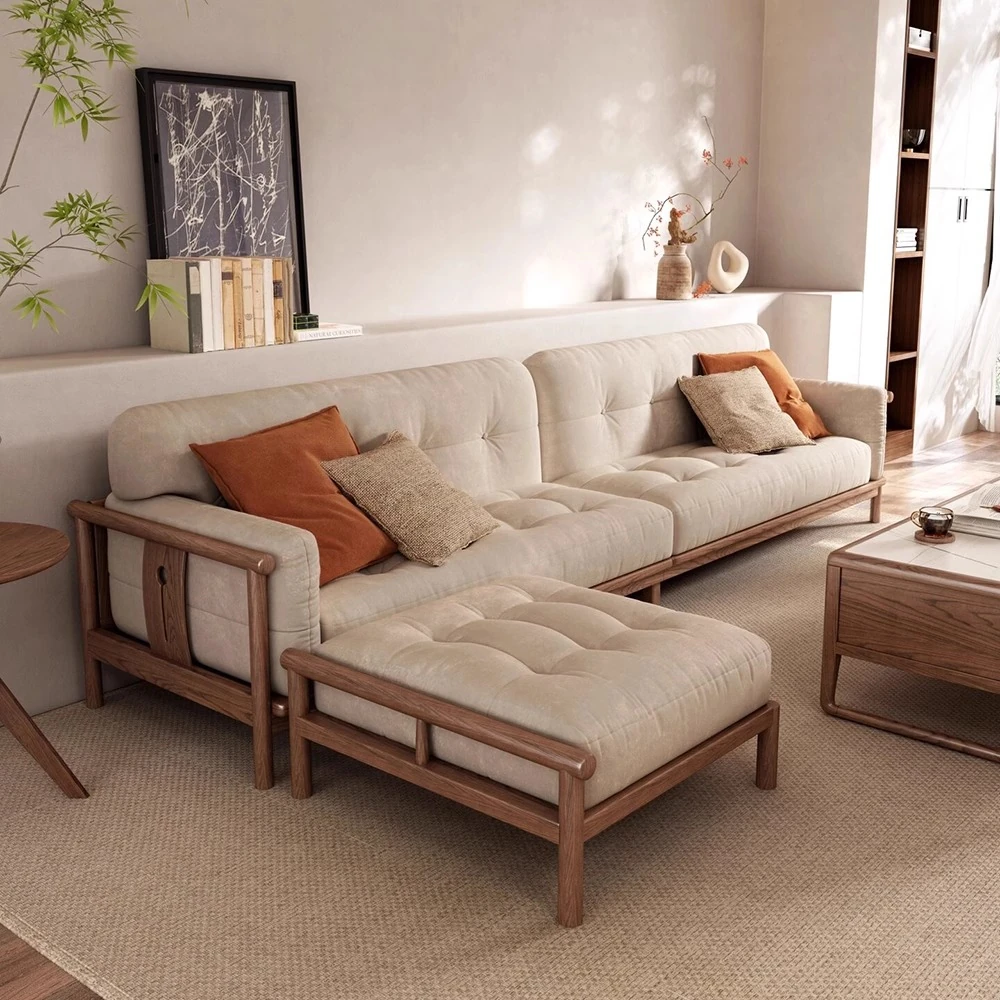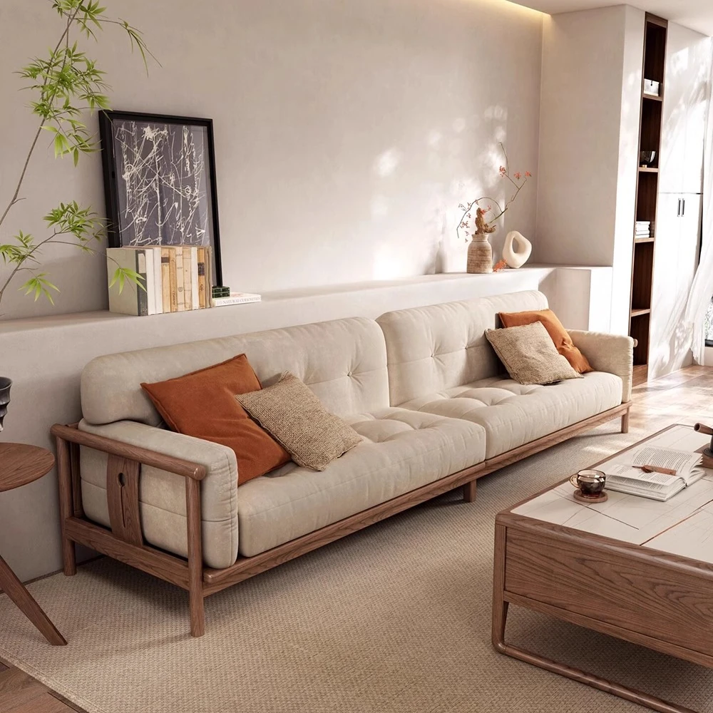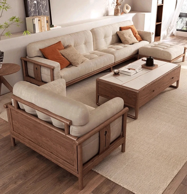 2024年新中式風格の無垢材ソファとテーブルの組み合わせ - 禅の心を感じる黒胡桃とホワイトアッシュの美しいデザイン、民宿やオフィス、ホテルに最適な家具!