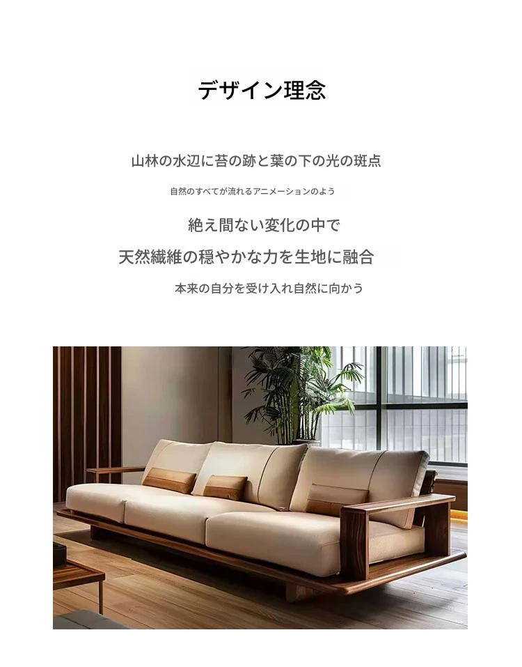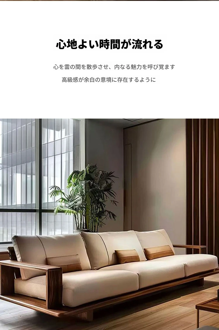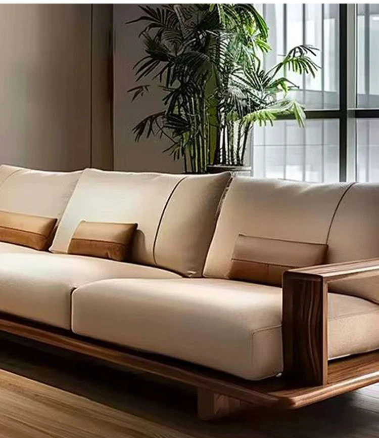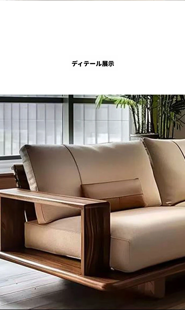 2025年新中式スタイルのブラックウォールナットとホワイトアッシュの直線デザインソファ - 禅の雰囲気を楽しむ高級本革使用、ホテルや民宿に最適なモダンなインテリアアイテム!