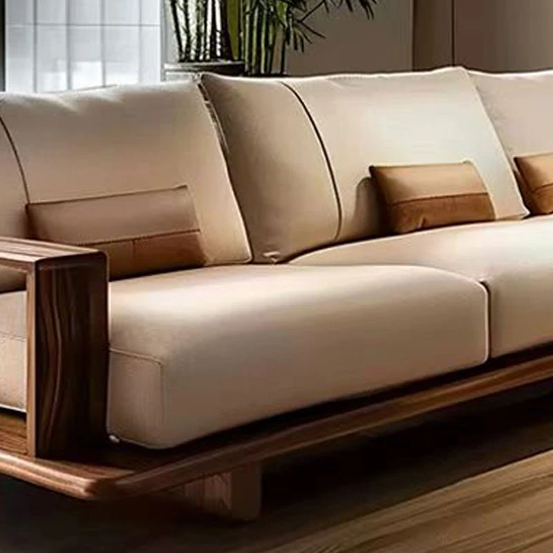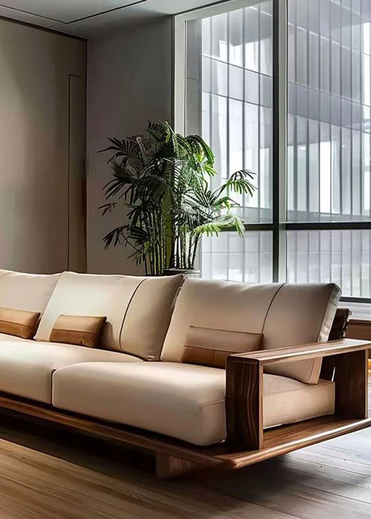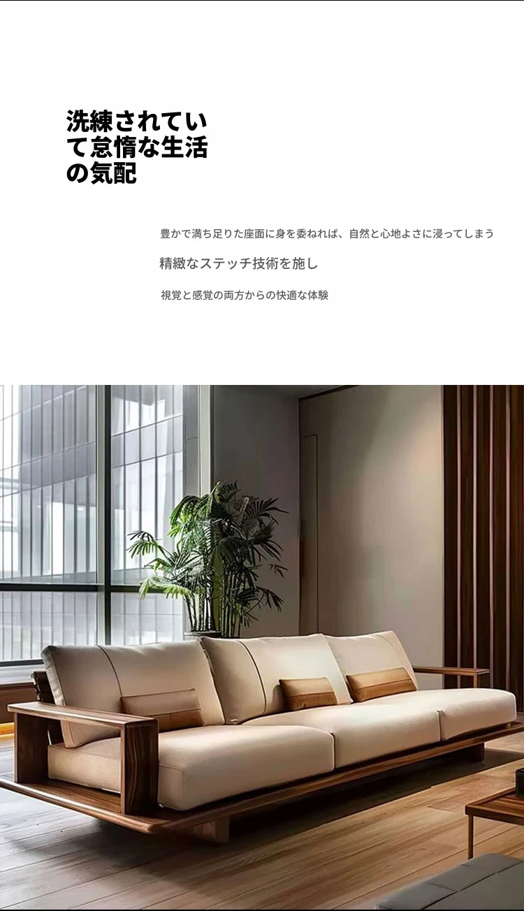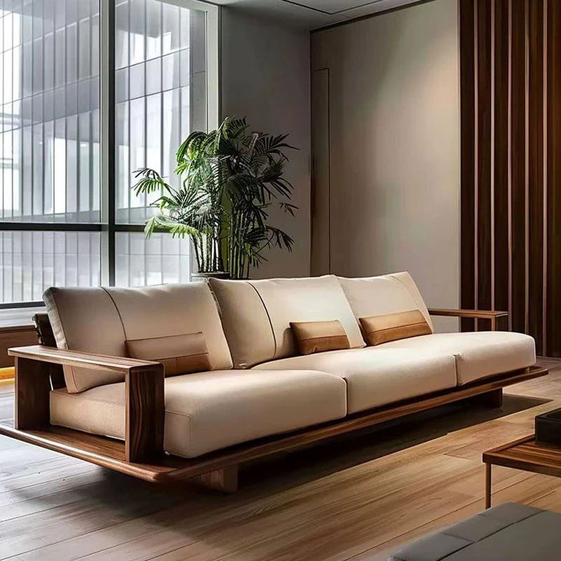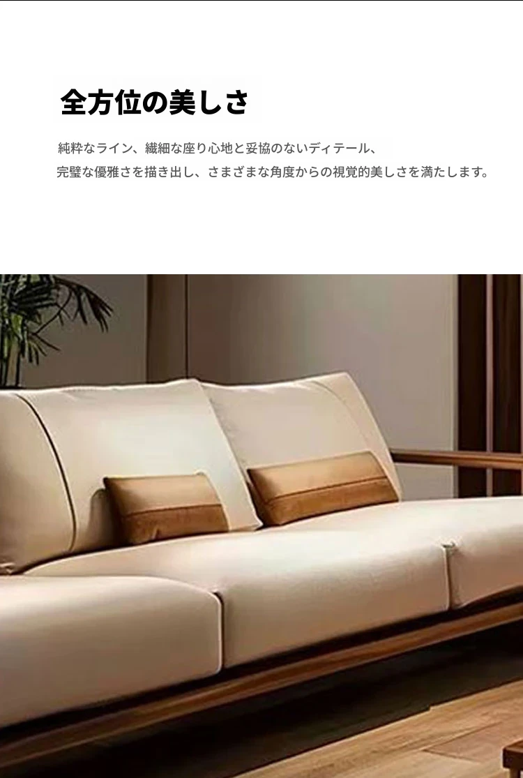 2025年新中式スタイルのブラックウォールナットとホワイトアッシュの直線デザインソファ - 禅の雰囲気を楽しむ高級本革使用、ホテルや民宿に最適なモダンなインテリアアイテム!