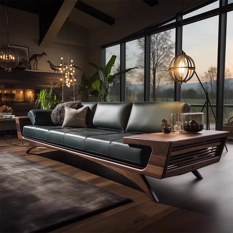 2025年新作!宋式美学ソファ - 高級ウォールナット材&本革使用の新中式デザイン。リビングルームを格上げする贅沢な直排スタイルのソファで、居心地の良さとスタイルを両立!