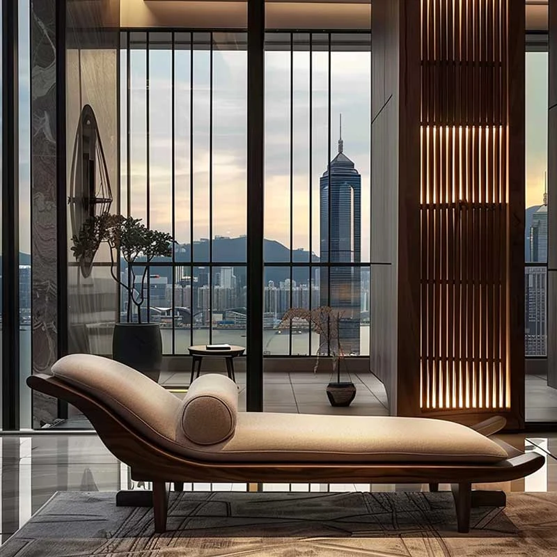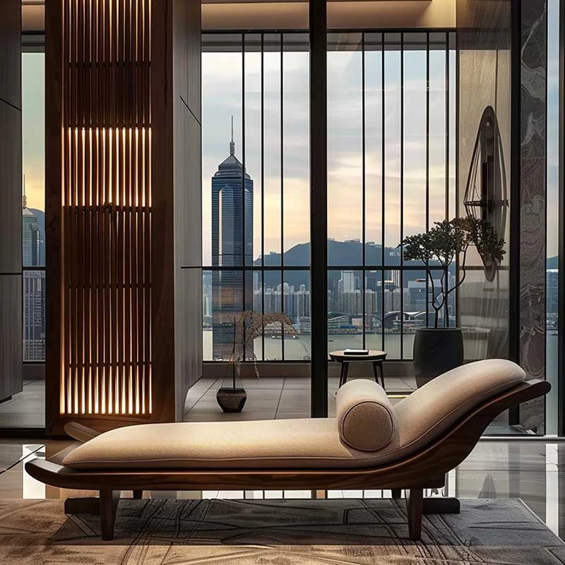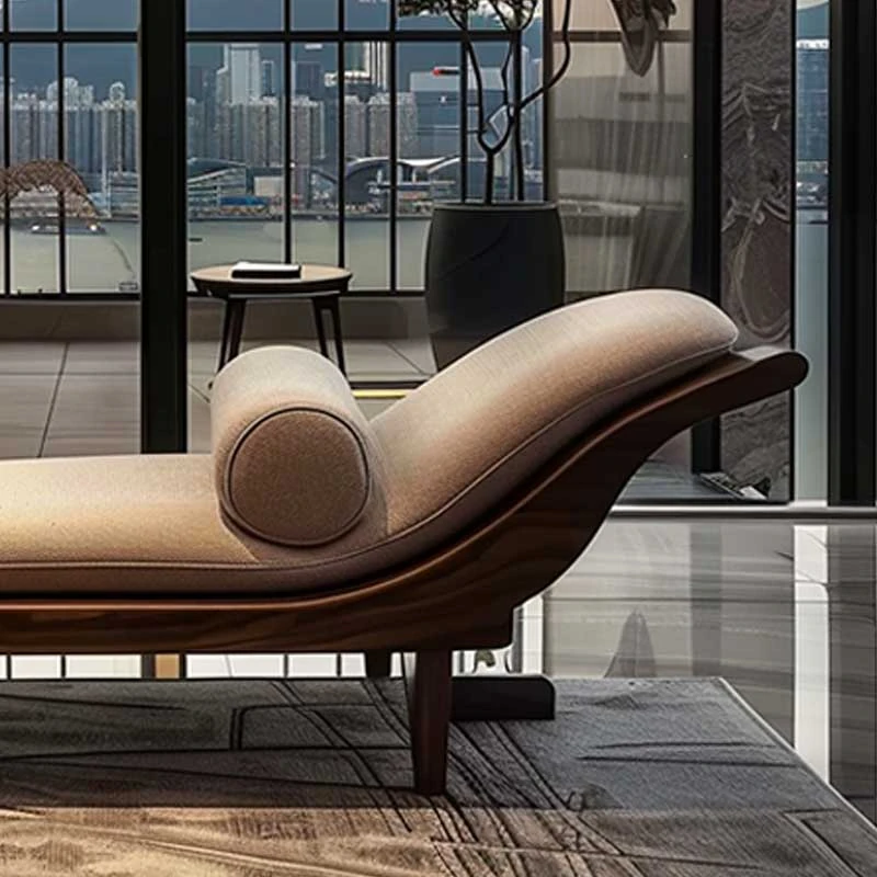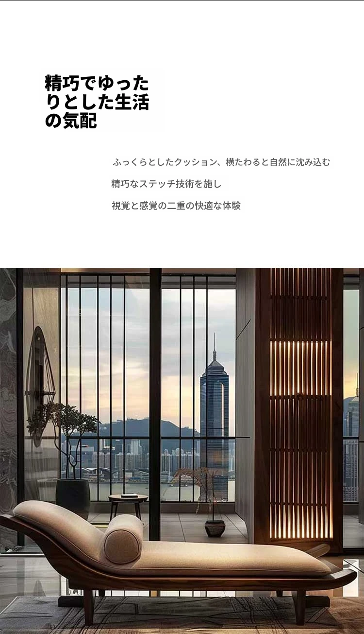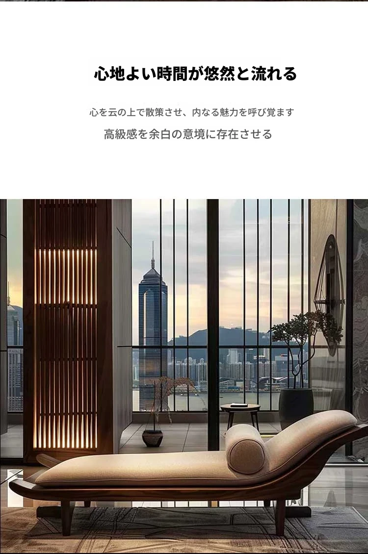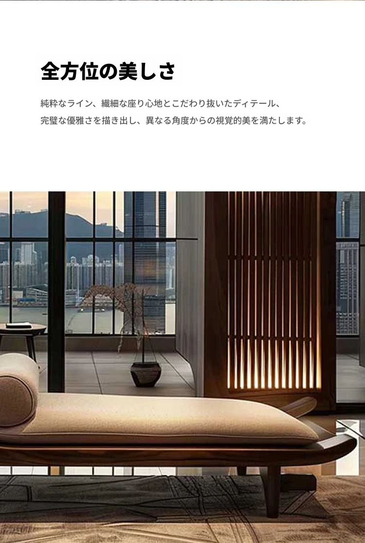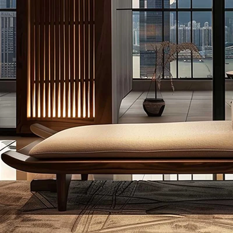 新中式2025禅スタイルの無垢材クイーンベッドソファ、ブラックウォールナットとホワイトアッシュの古風なデザインで、リラックス空間を演出。民宿に最適な美しい美人ソファ!