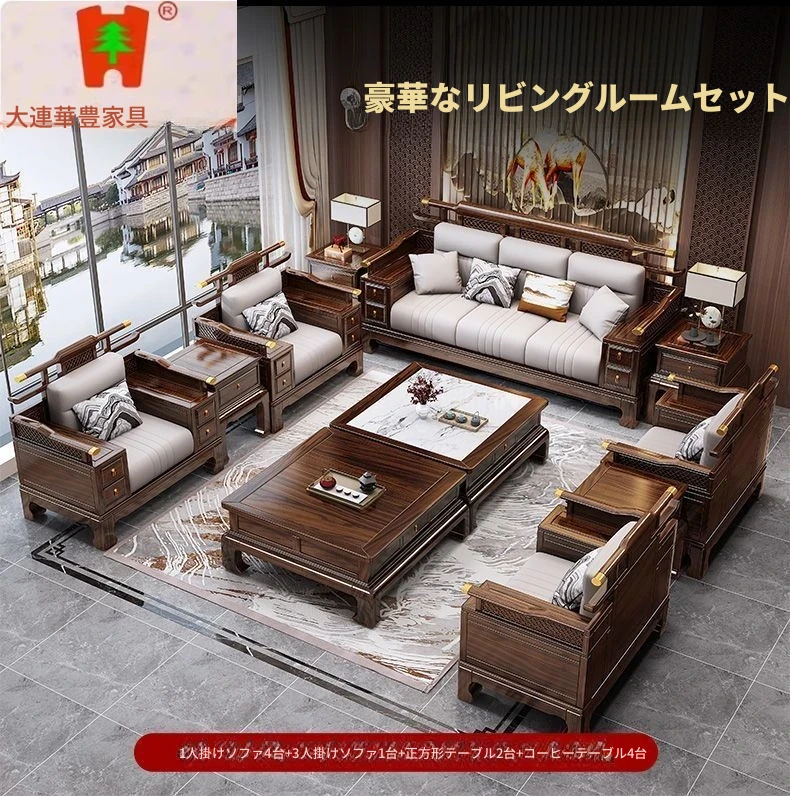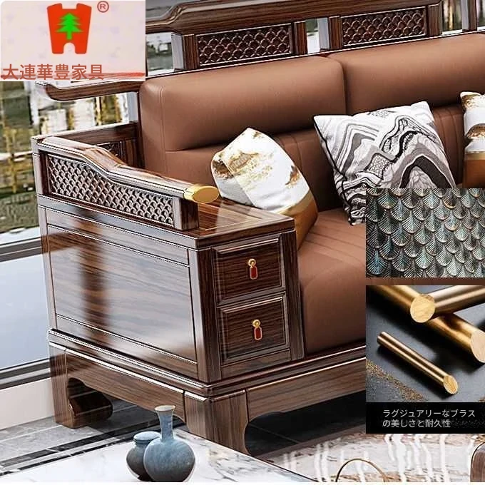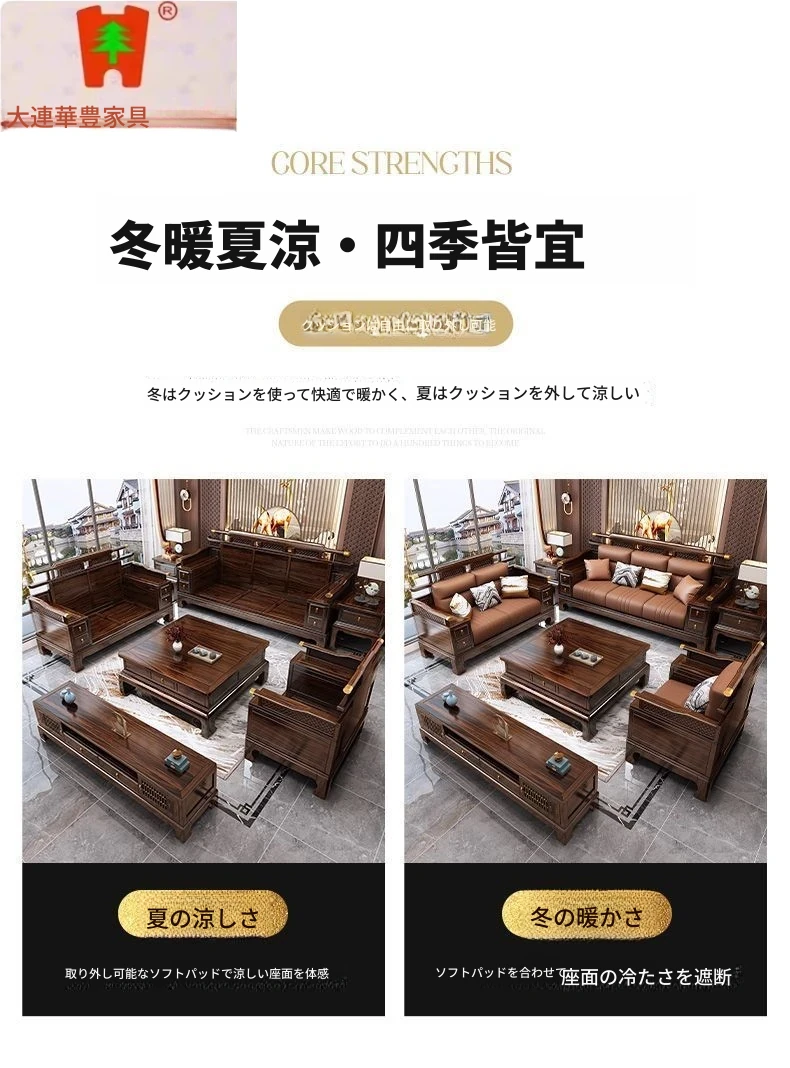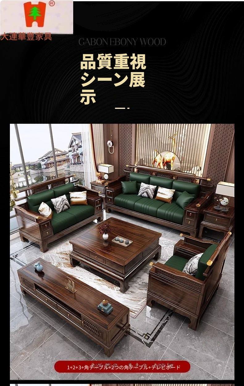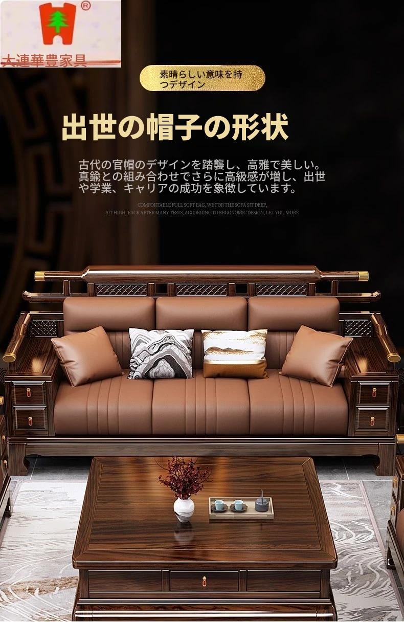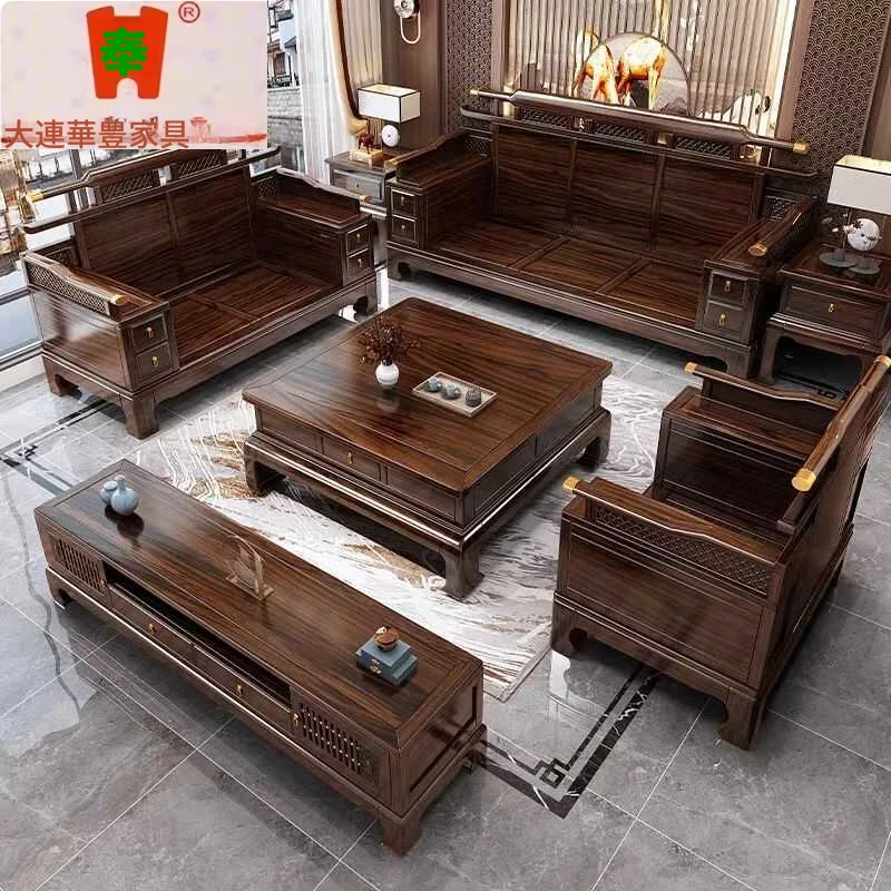 大連華豊公式フラッグシップストア新中式ウッドブラックソファセット|冬夏両用の贅沢リビングルーム家具で、ヴィラにもぴったり!