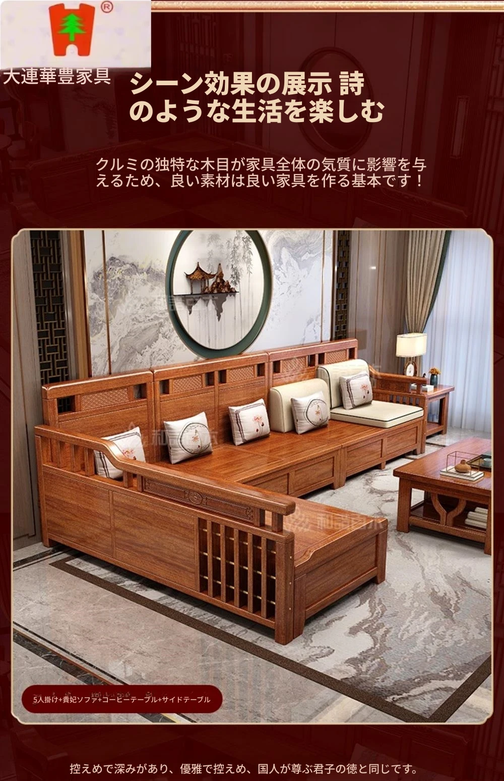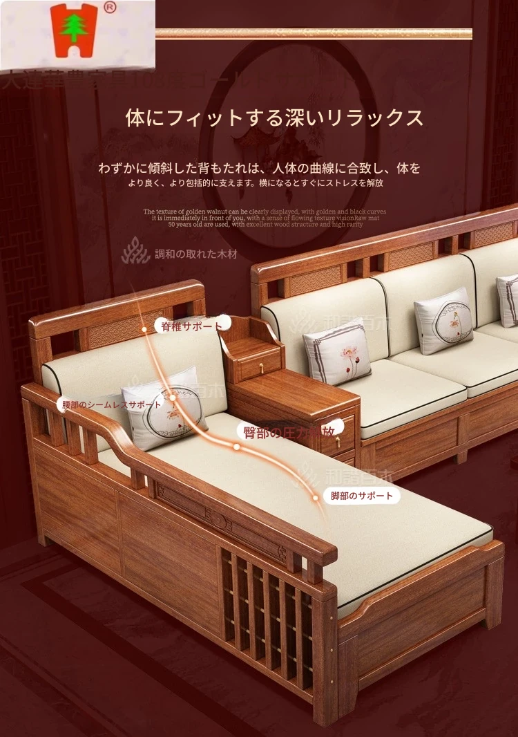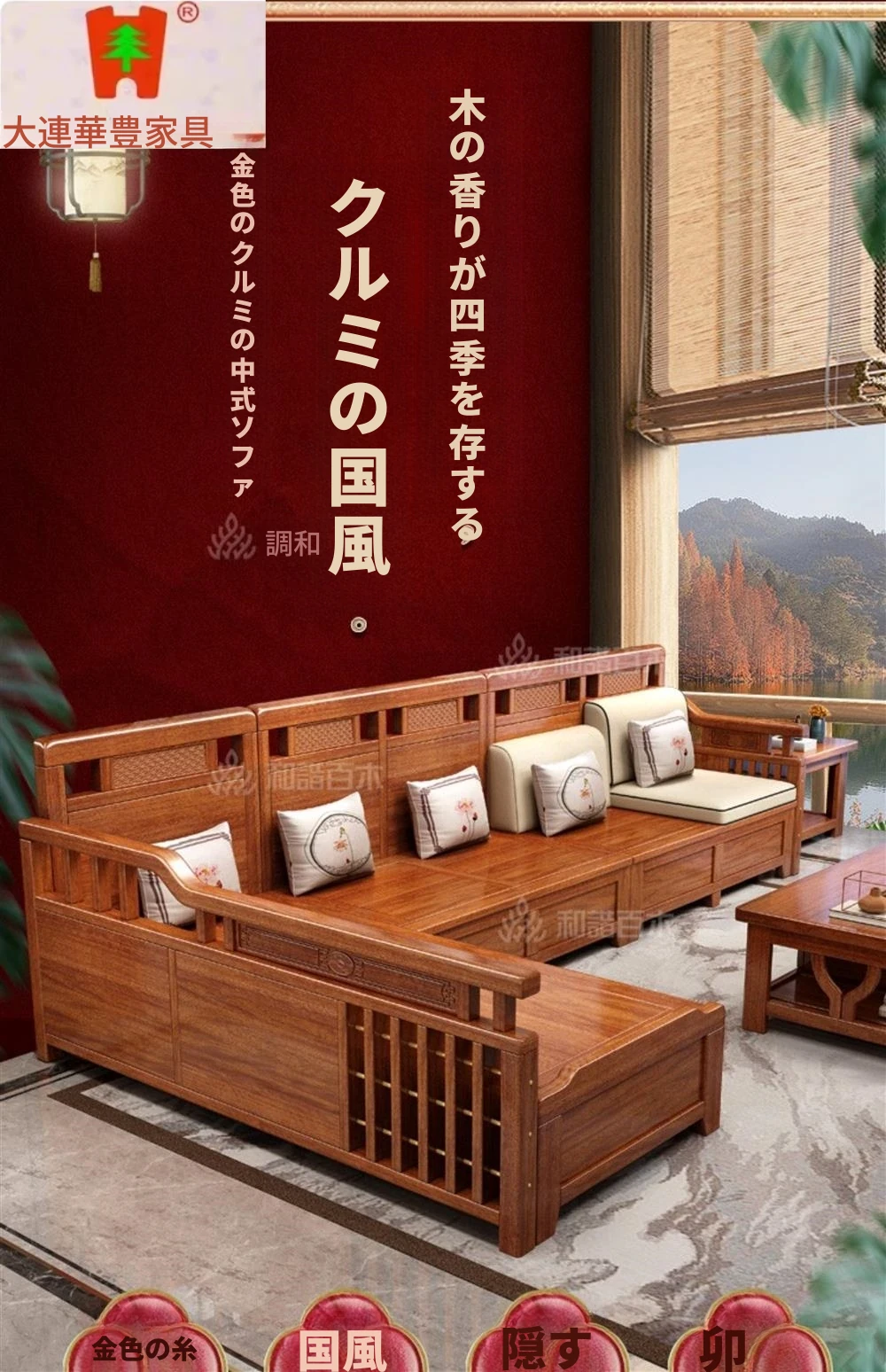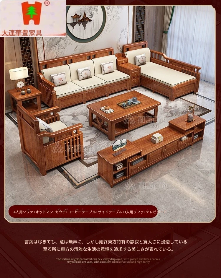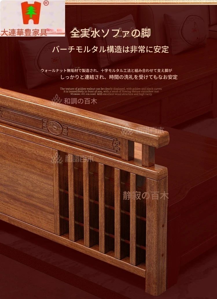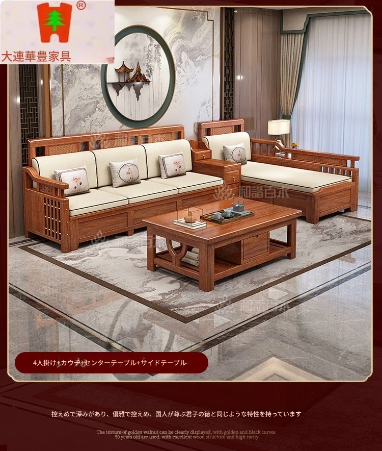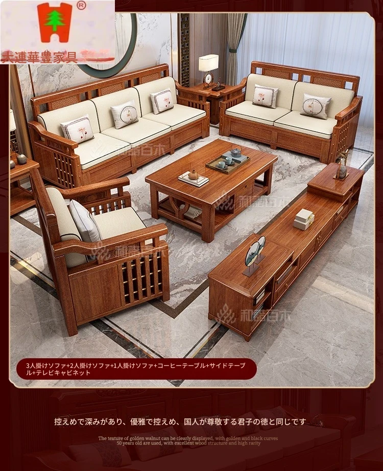 大連華豊公式フラッグシップ店のウォールナット無垢材ソファセット - モダンなリビングに最適!小型住宅にもフィットするシンプルでスタイリッシュな木製ソファ。快適さとデザインの両立を実現!