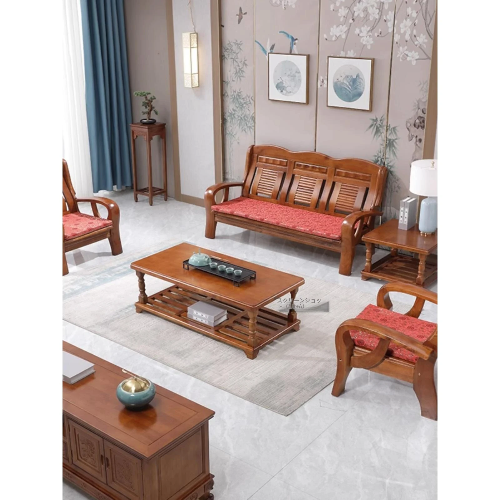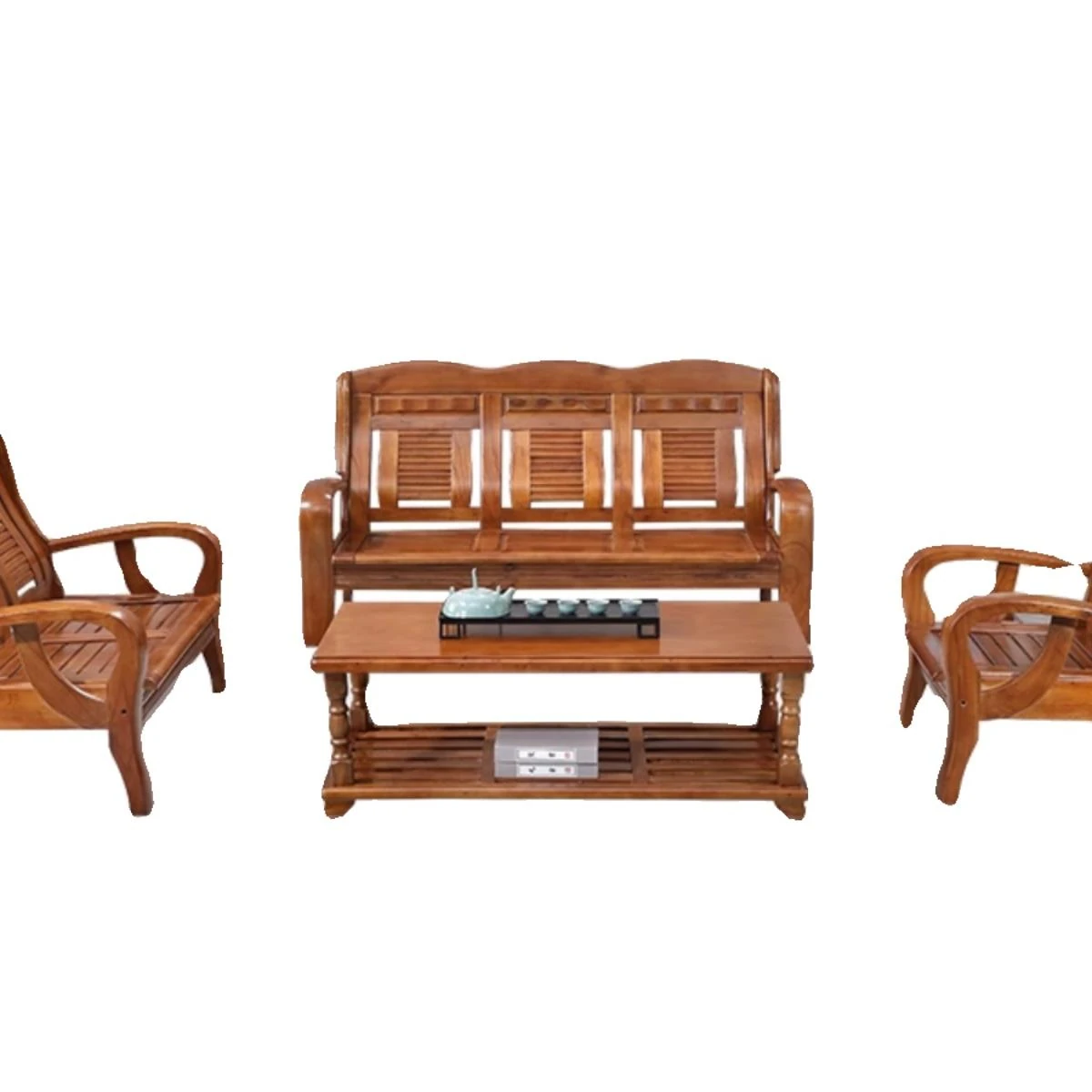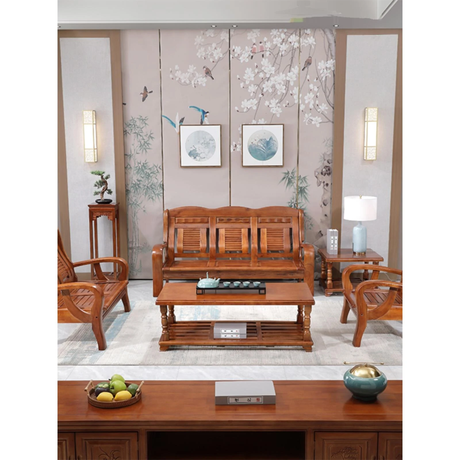 全実木製の中華スタイル三人掛けソファ - コンパクトで経済的!冬でも夏でも使える快適な木製ソファで、狭いリビングにもぴったり。自然の温もりを感じる一品で、あなたの家に素敵なアクセントを加えます。