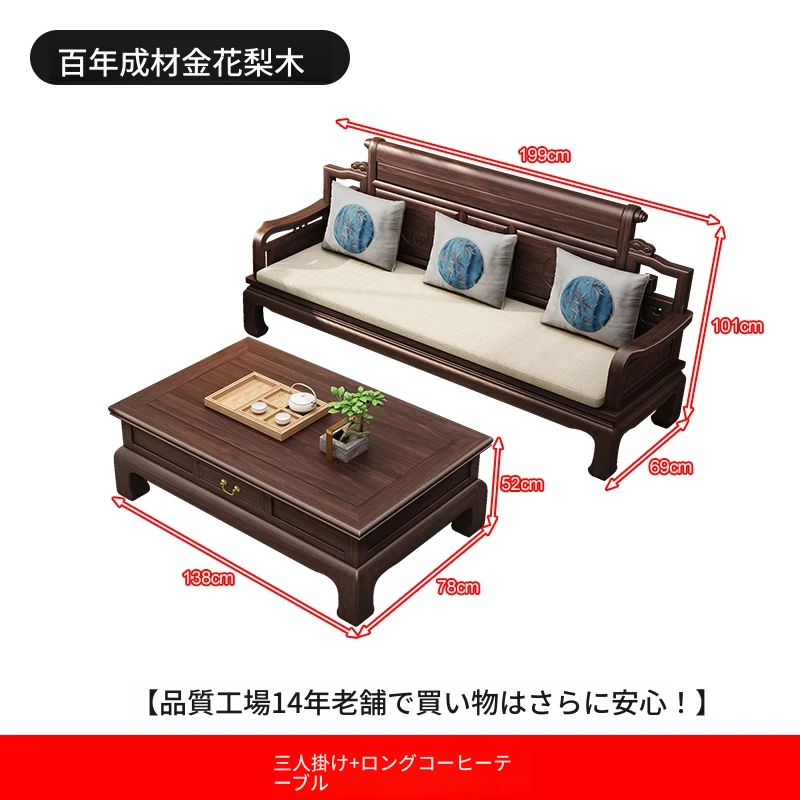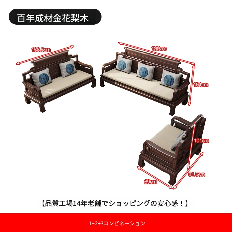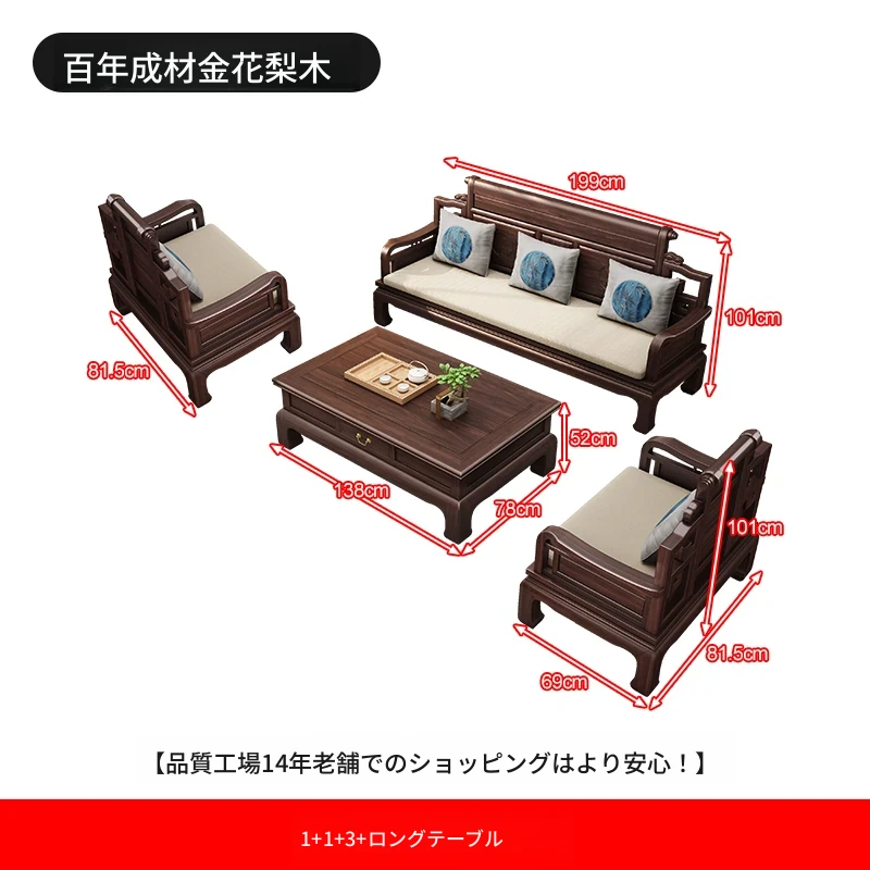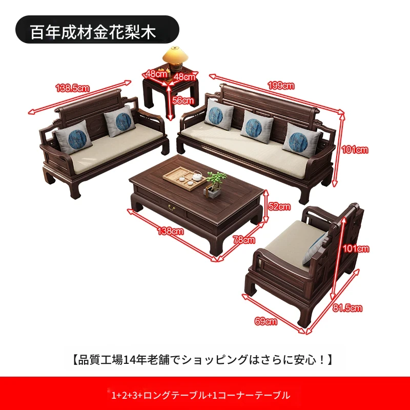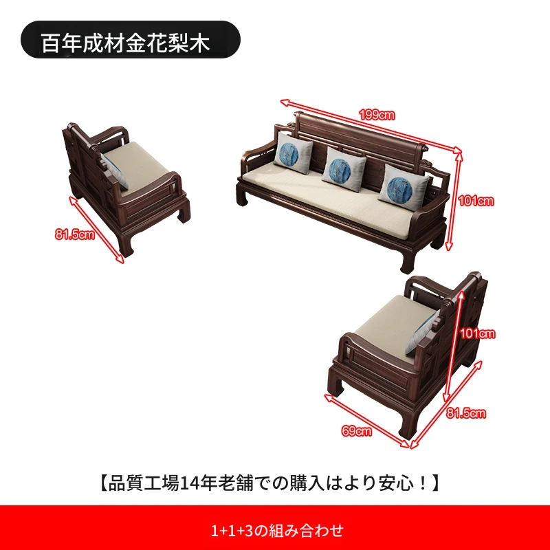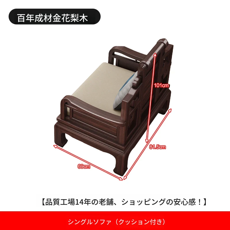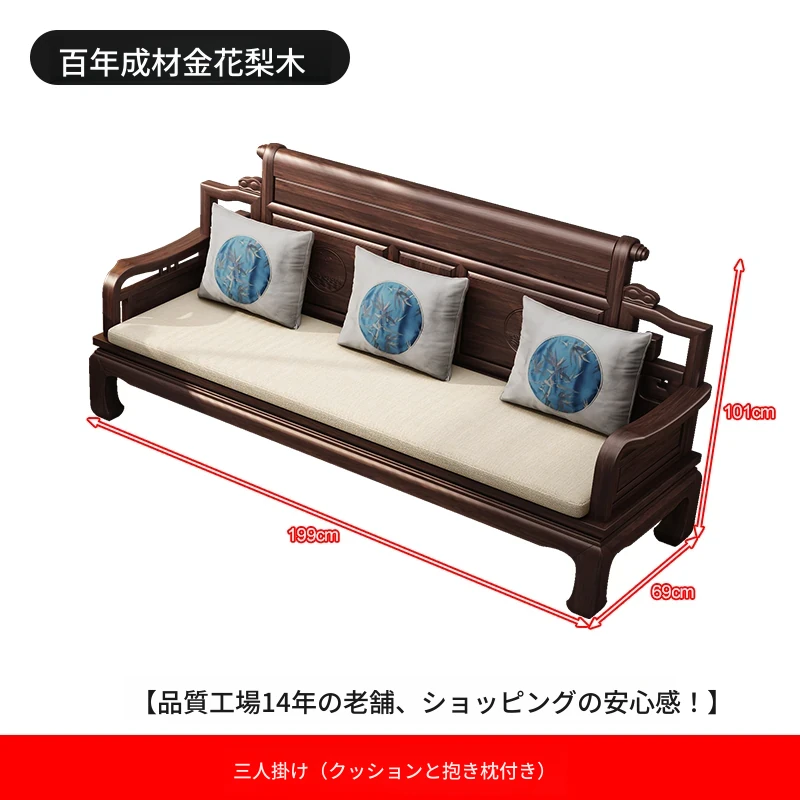 新中式スタイルの金花梨木製豪華実木ソファセット - 小型リビングにぴったり!冬も夏も使える快適デザイン、古典的な格子模様が魅力の高品質家具。