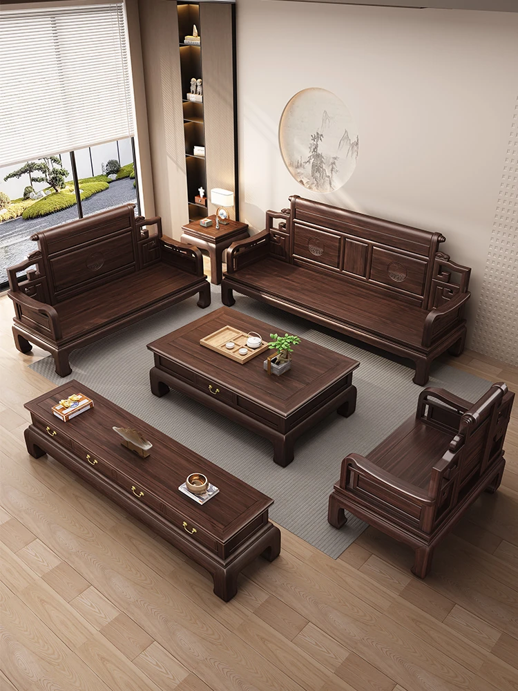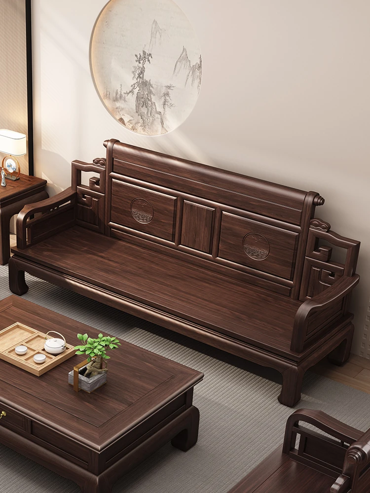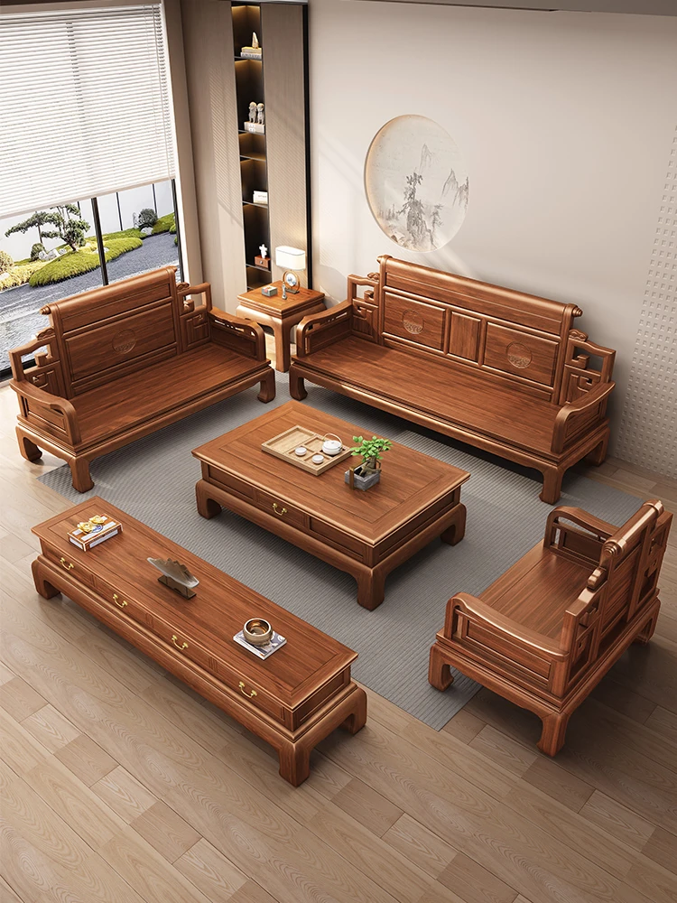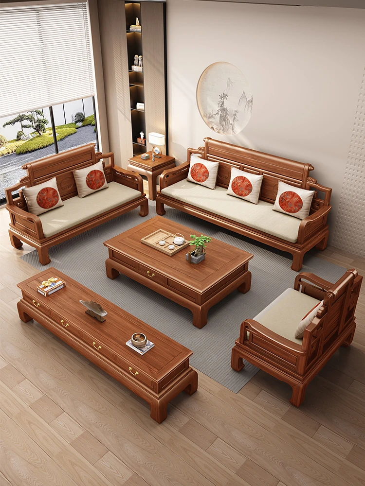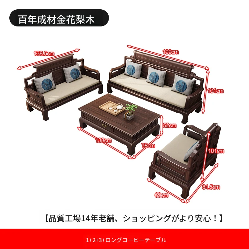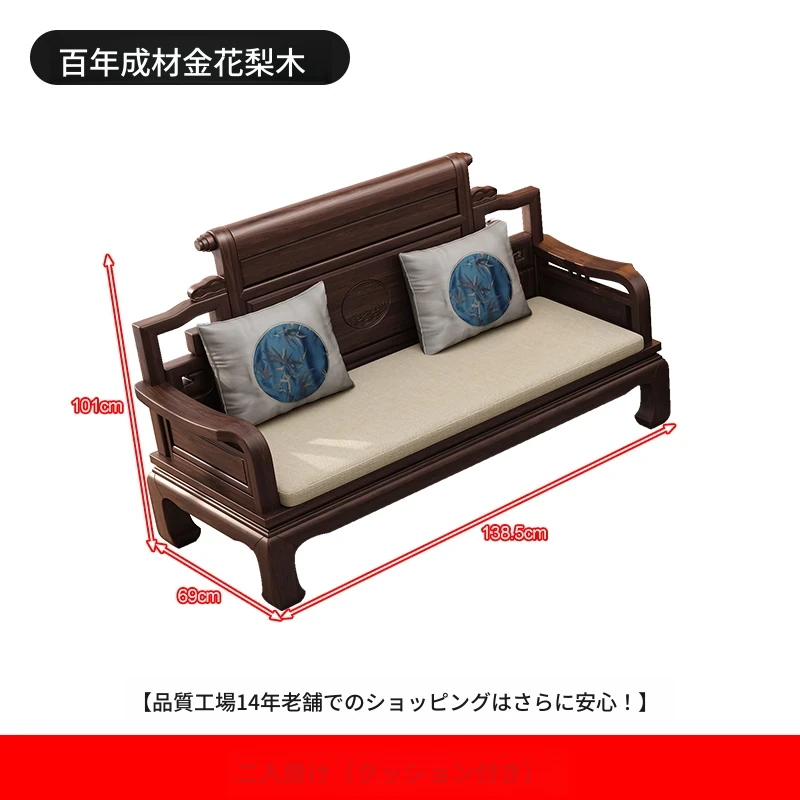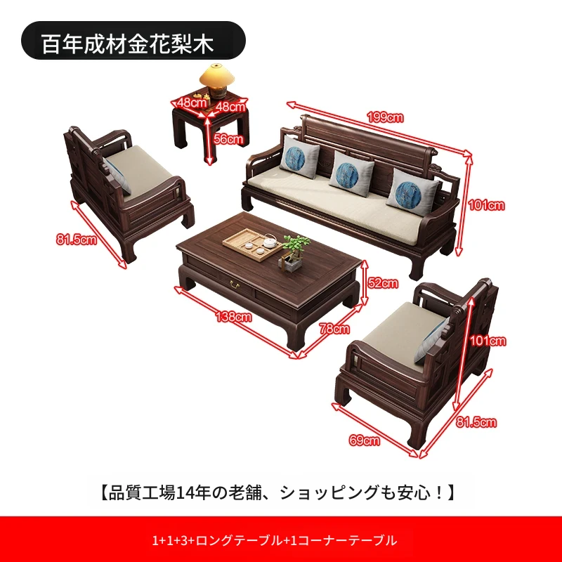 新中式スタイルの金花梨木製豪華実木ソファセット - 小型リビングにぴったり!冬も夏も使える快適デザイン、古典的な格子模様が魅力の高品質家具。