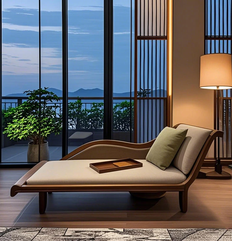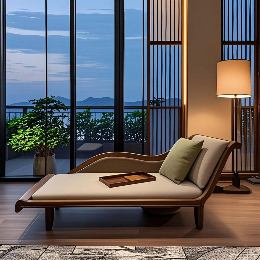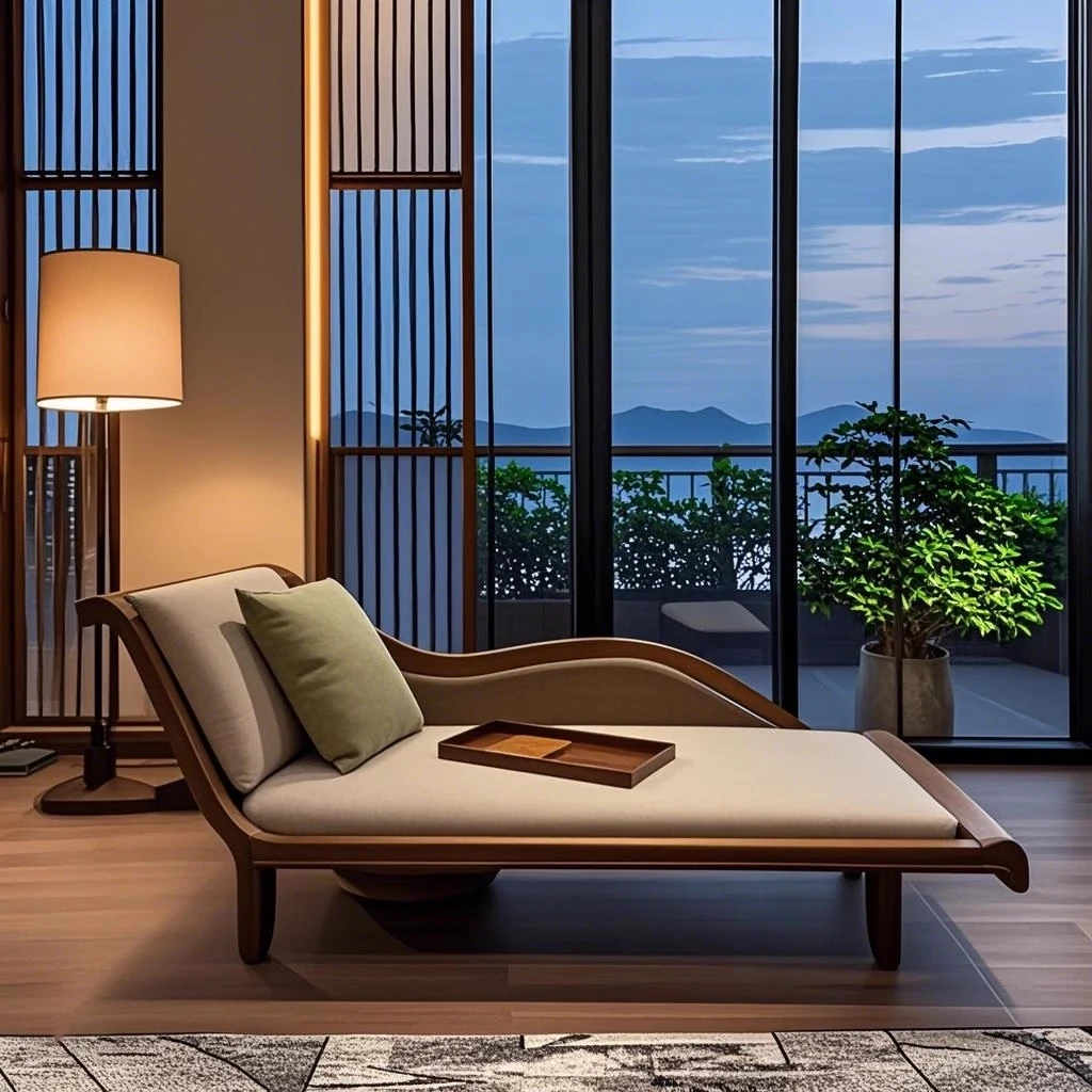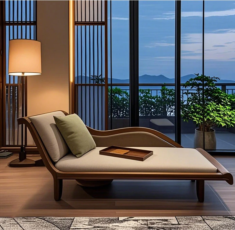 新中式の黒胡桃とホワイトアッシュの禅スタイル実木製貴妃椅子、リビングにぴったりの軽奢華な高級現代的ミニマリズム、ホテルや民宿にも最適!
