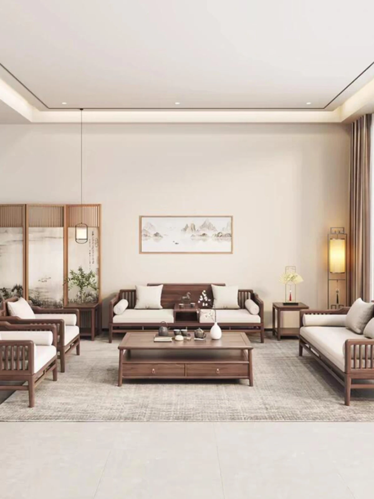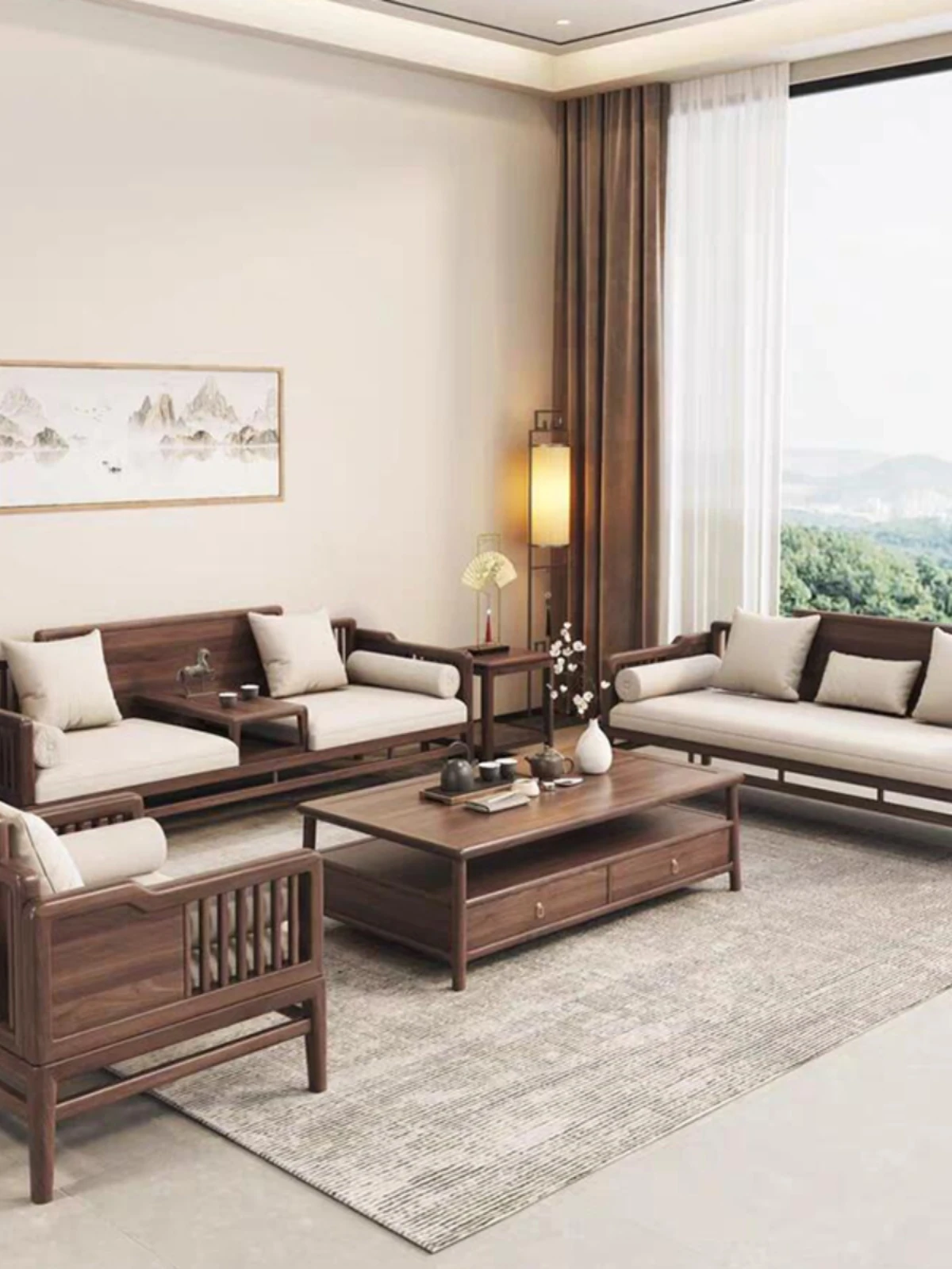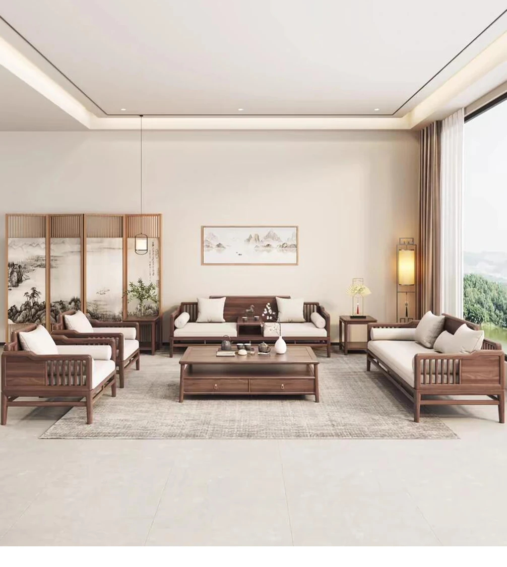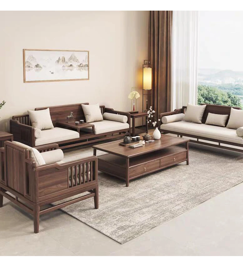 新中式のブラックウォールナット無垢材ソファ - 宋代の美学を取り入れた洗練されたデザイン。小さなリビングにも最適な高級家具セット。心地よい空間を演出し、上質なひとときを提供します。