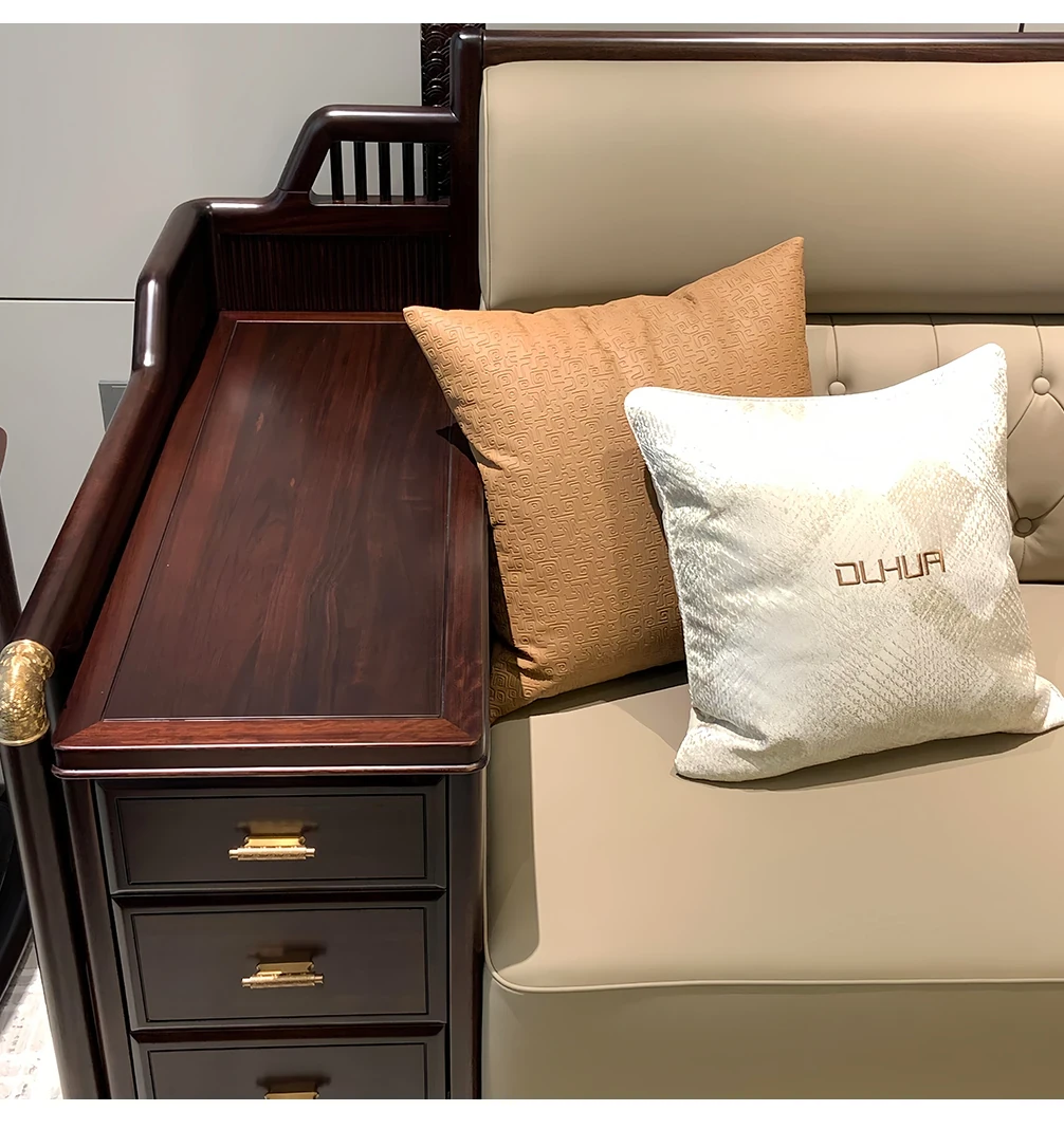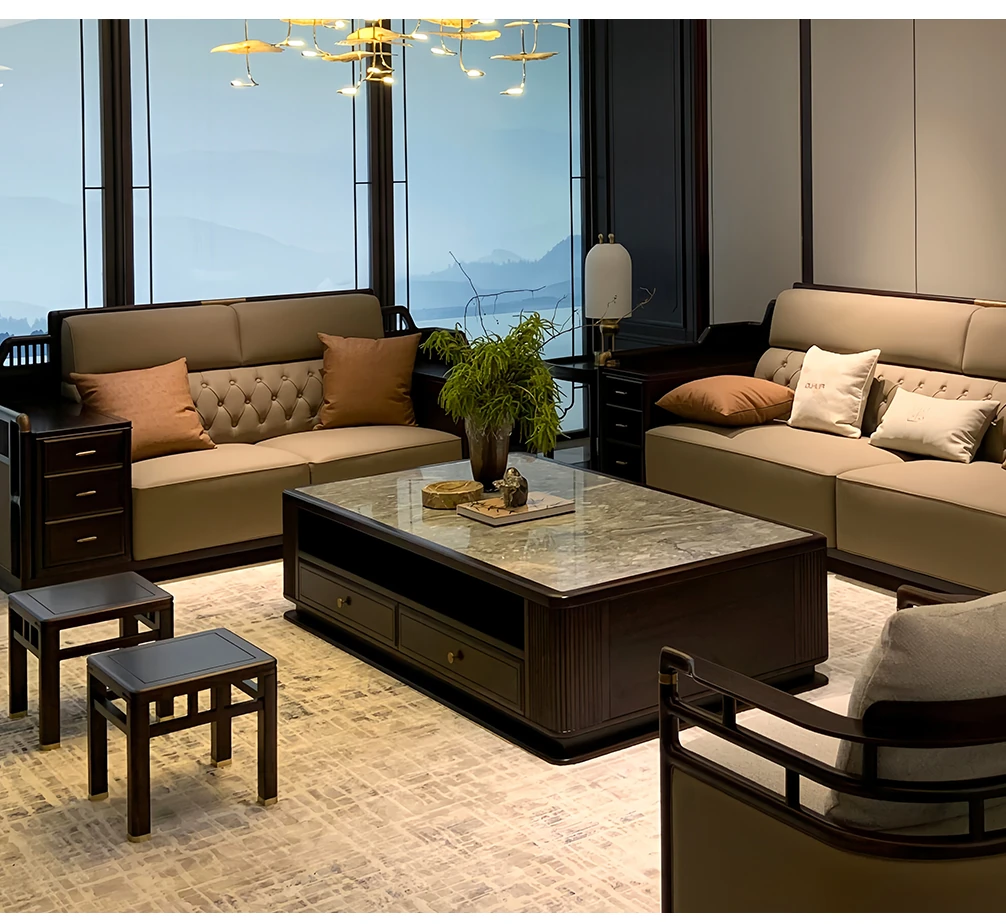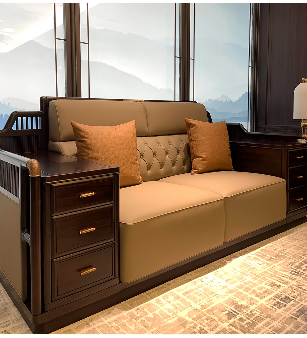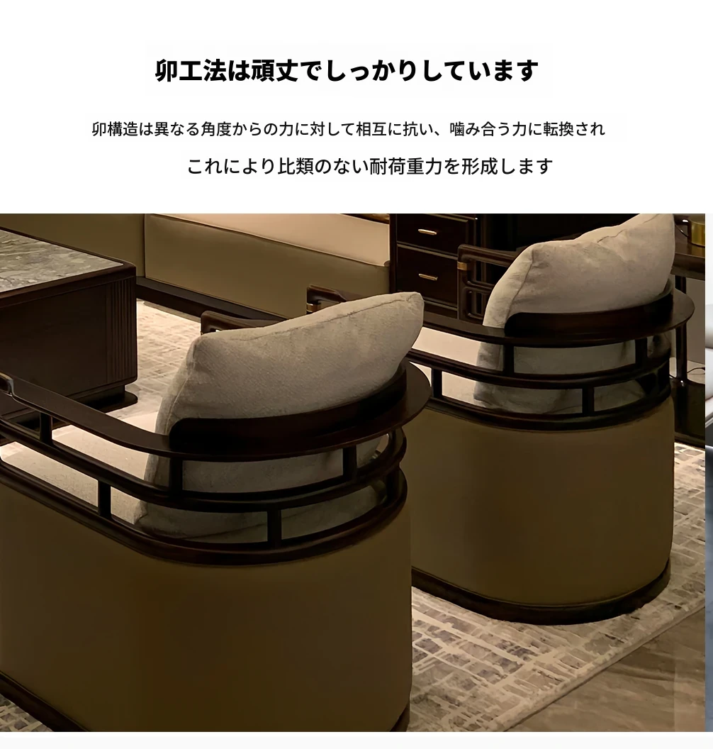 新中式ウッドウルキンソファー - スタイリッシュで高級感あふれるリビング用、広々としたヴィラに最適なフロアタイプの実木製ソファ。モダンなデザインで、あなたの客間を華やかに演出します!