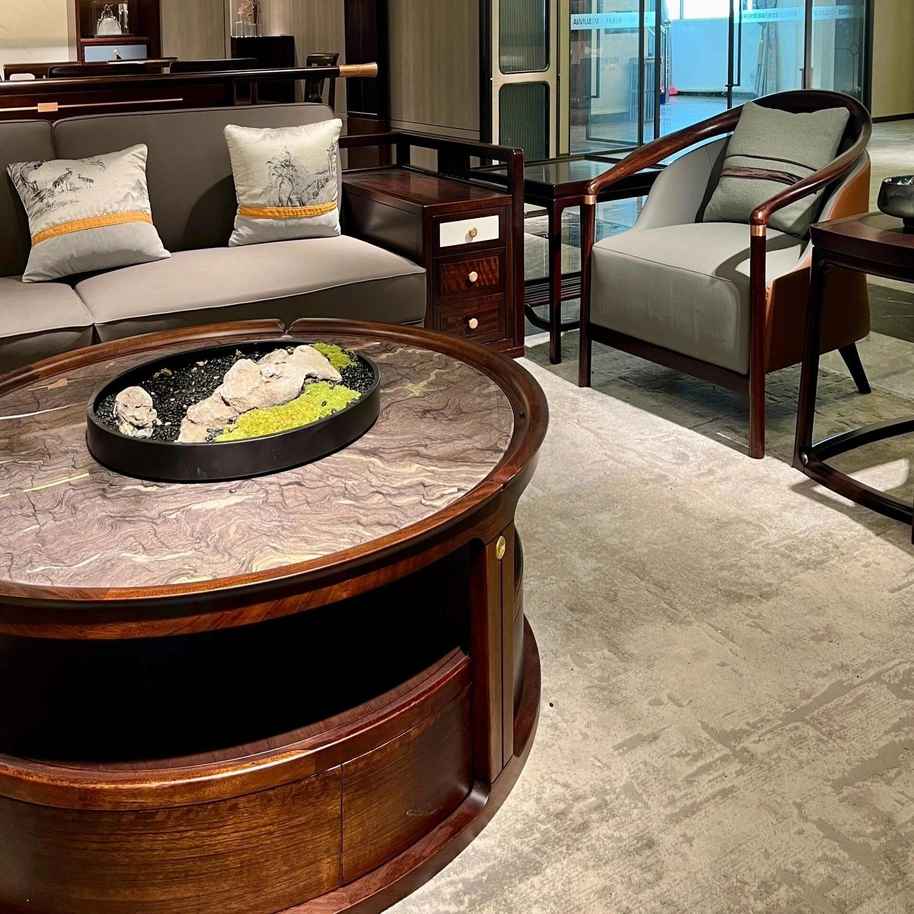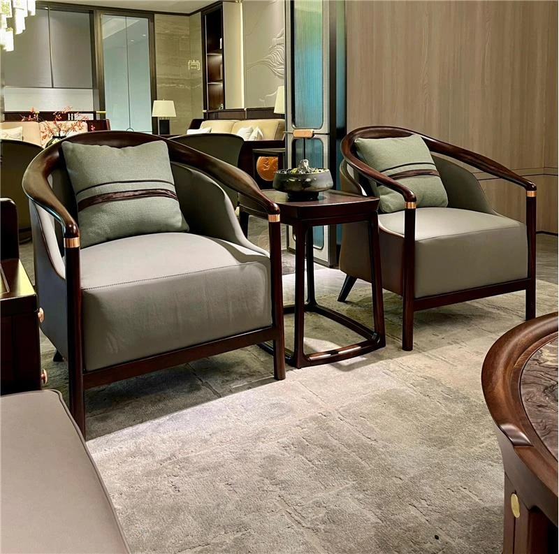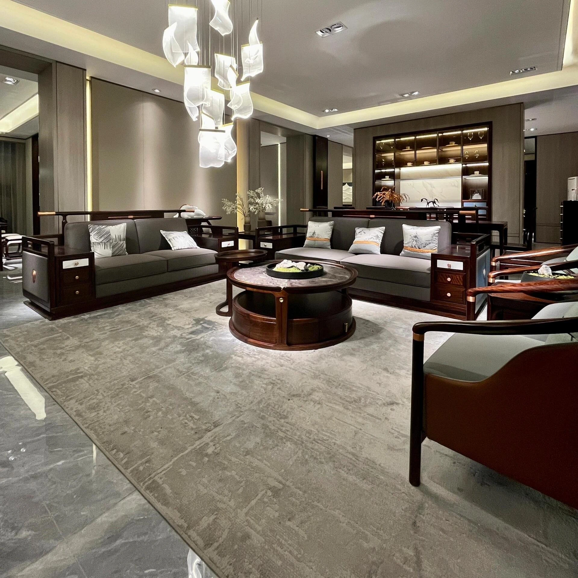 高級新中式ソファー ウーキン材の無垢材使用!リビングにぴったりな広々としたデザインで、別荘や豪邸、クラブハウスにも最適。モダンでシンプルなスタイルが魅力の大空間向けソファーです。