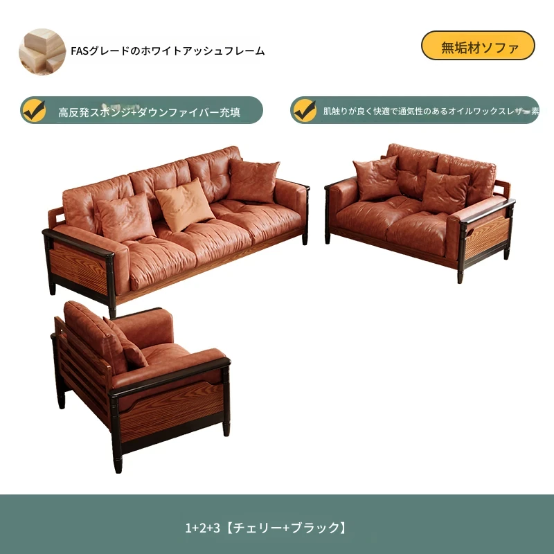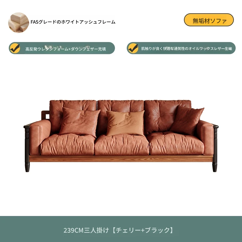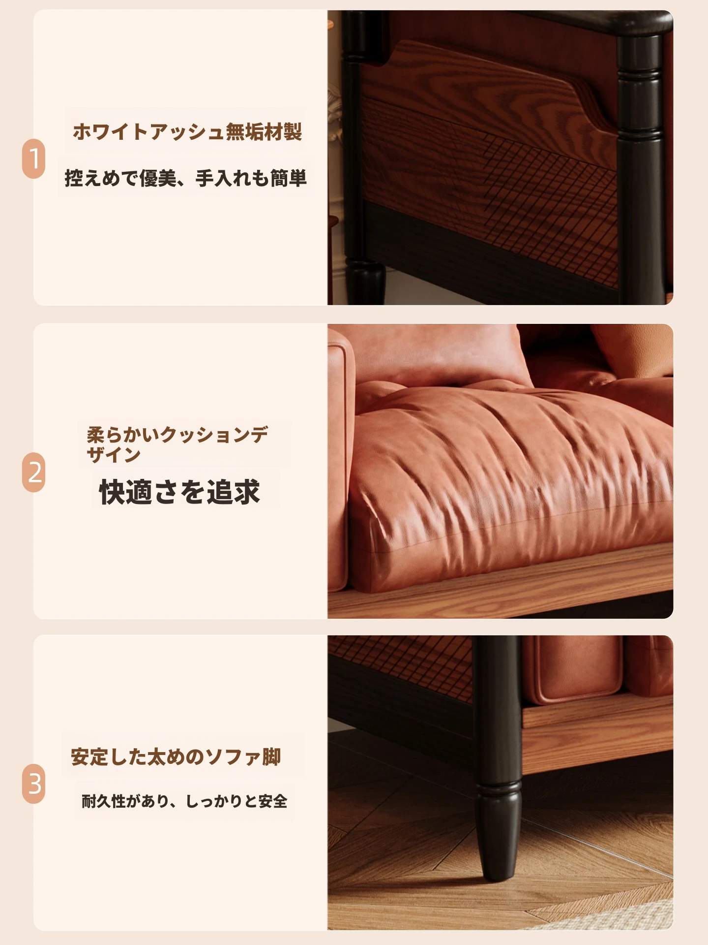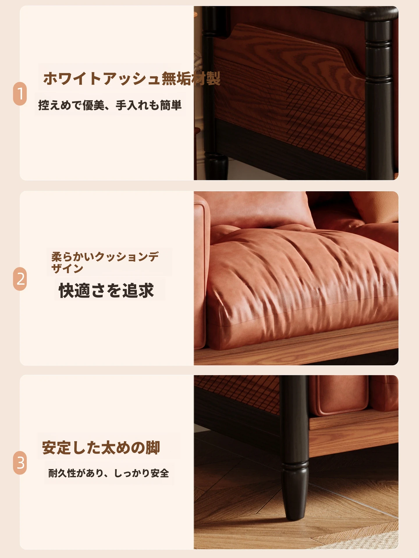 フランス風レトロ直線デザインの無垢材ソファ3人掛け、小型リビングに最適なアンティーク調ホワイトアッシュ製ソファとテーブルのセット。おしゃれでコンパクトなインテリアを実現!