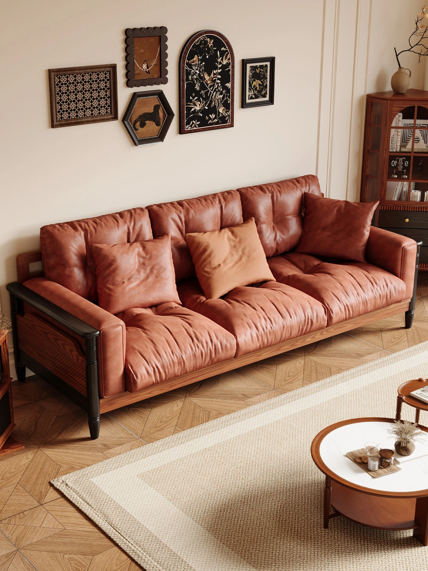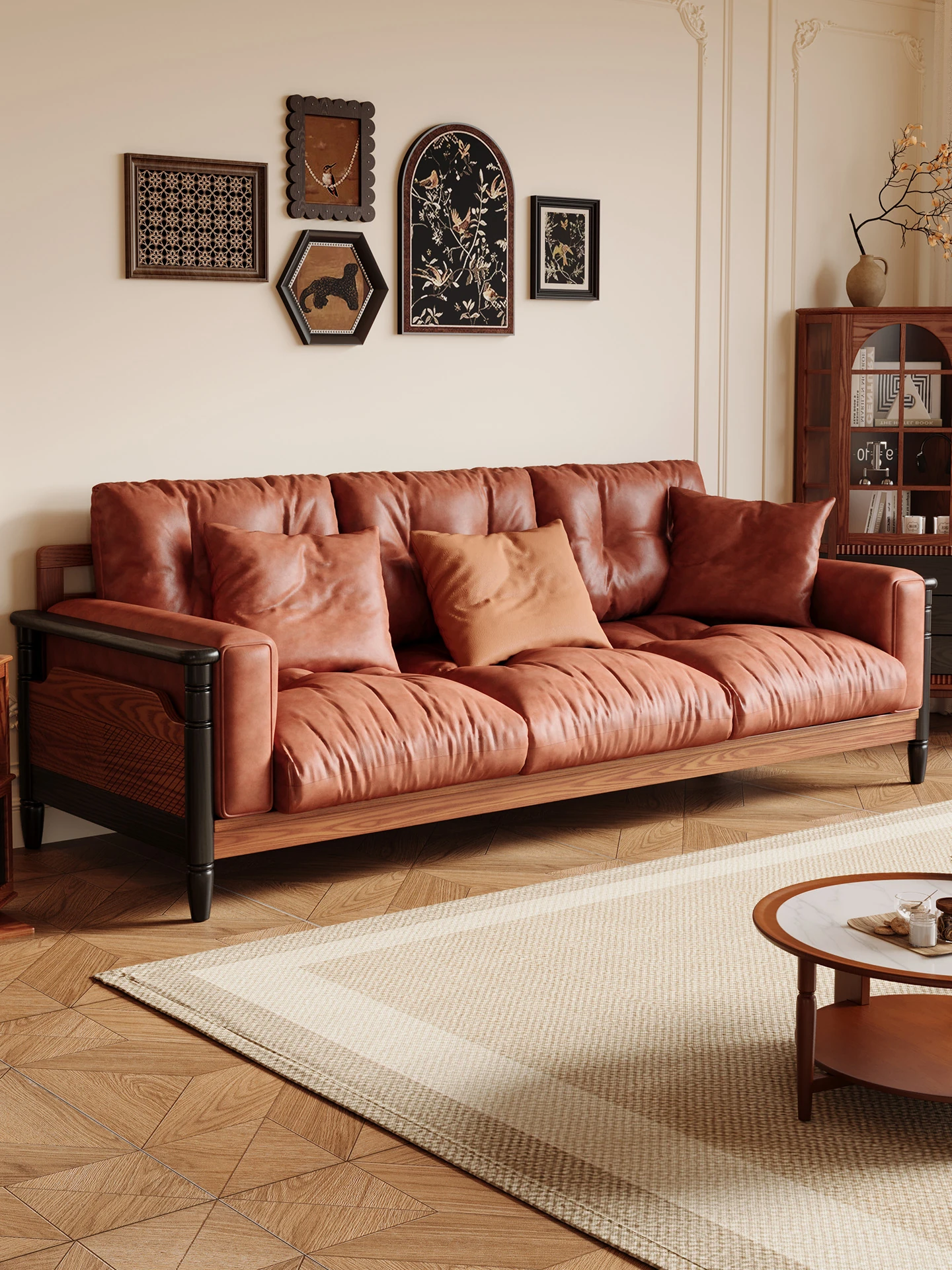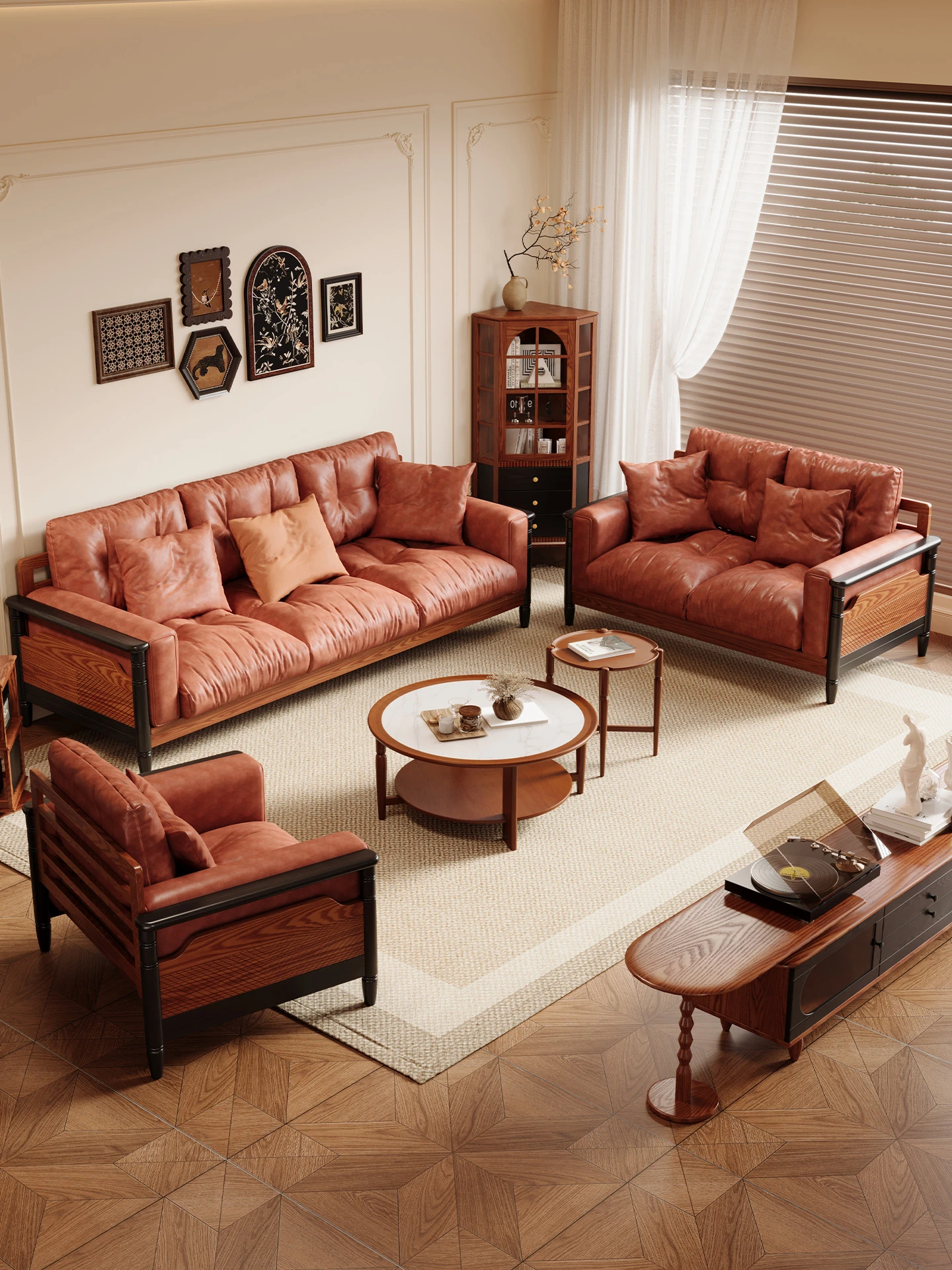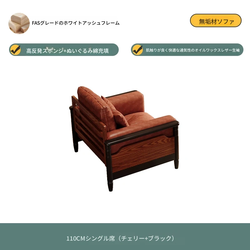 フランス風レトロ直線デザインの無垢材ソファ3人掛け、小型リビングに最適なアンティーク調ホワイトアッシュ製ソファとテーブルのセット。おしゃれでコンパクトなインテリアを実現!