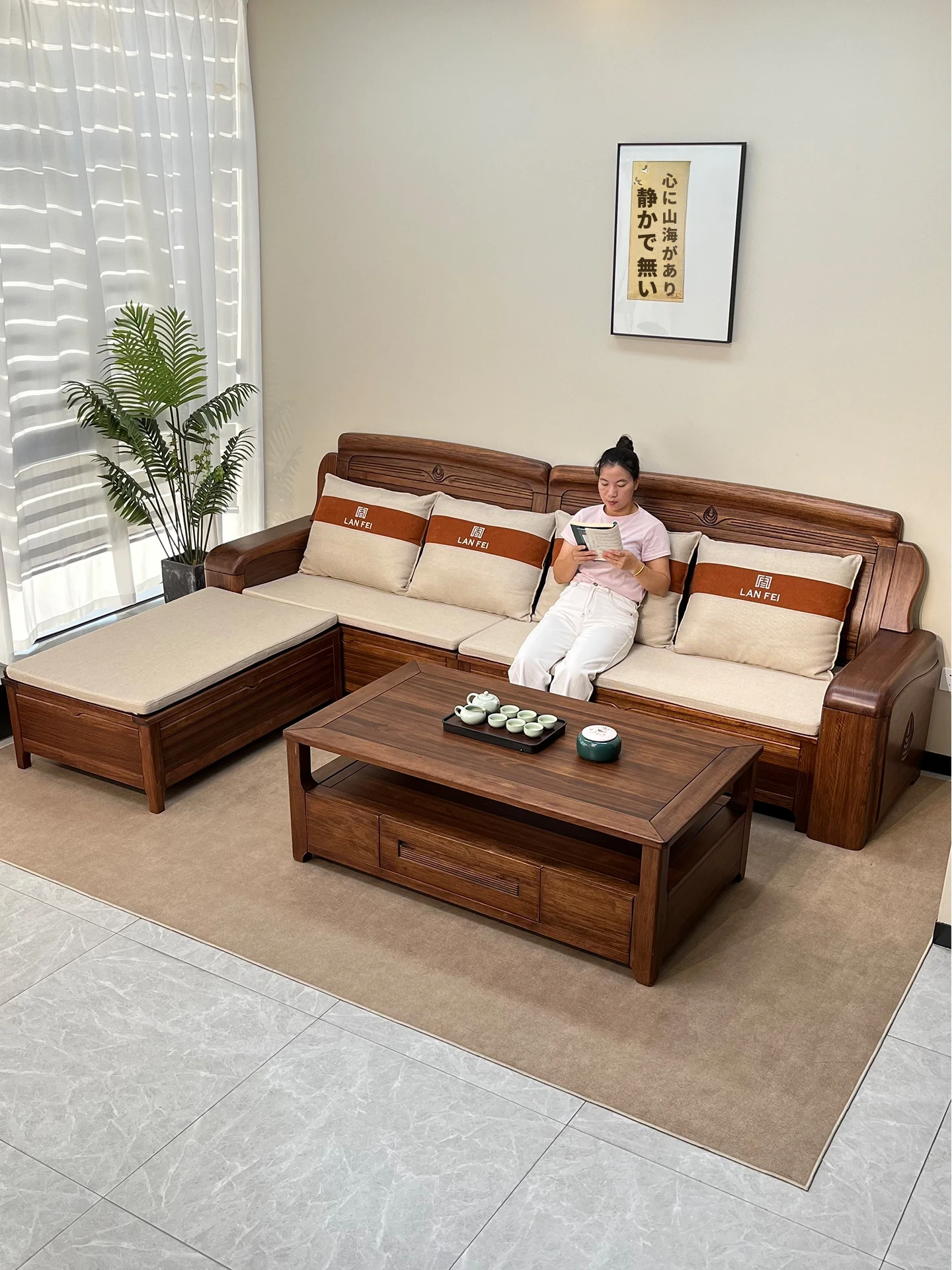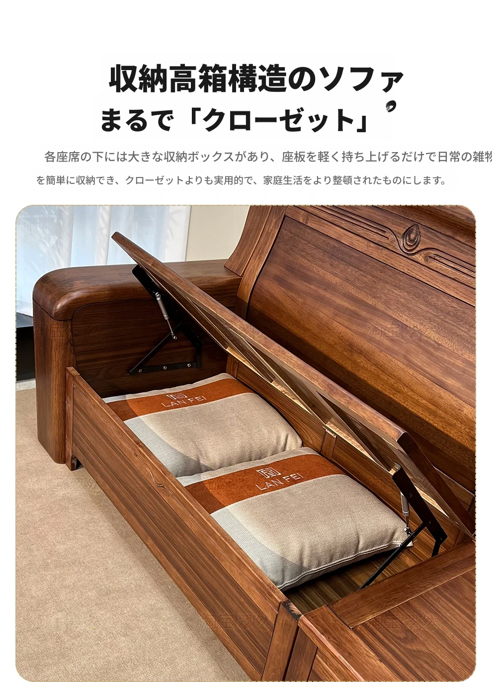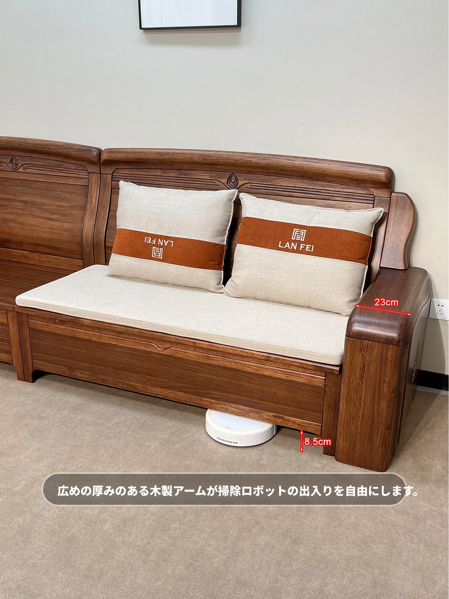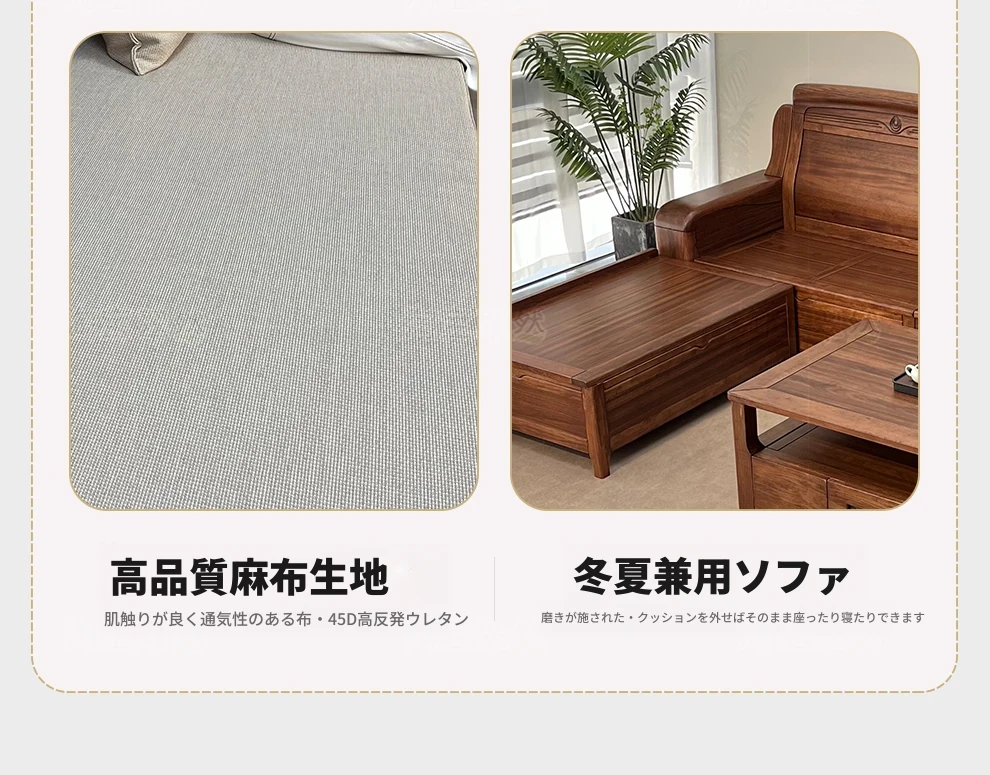 冬夏兼用の貴妃椅子付き、収納力抜群の五人掛けゴールドナシの無垢材ソファセット!小型リビングにもぴったりな中華風家具で、心地良い空間を演出します。