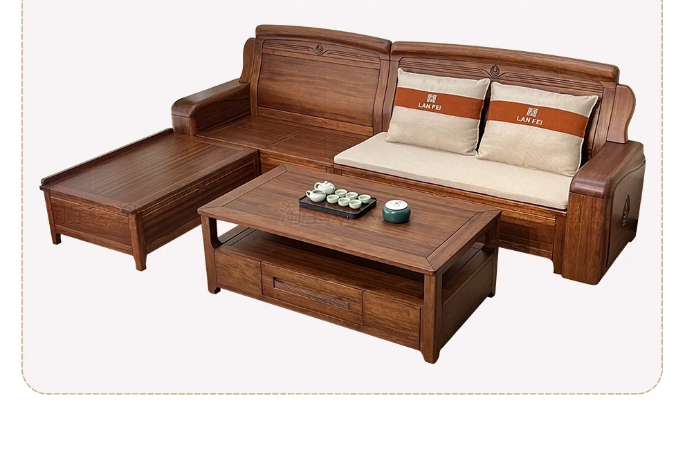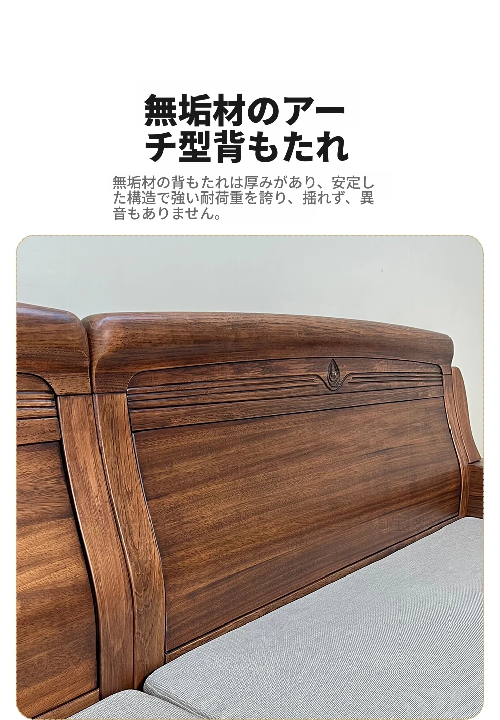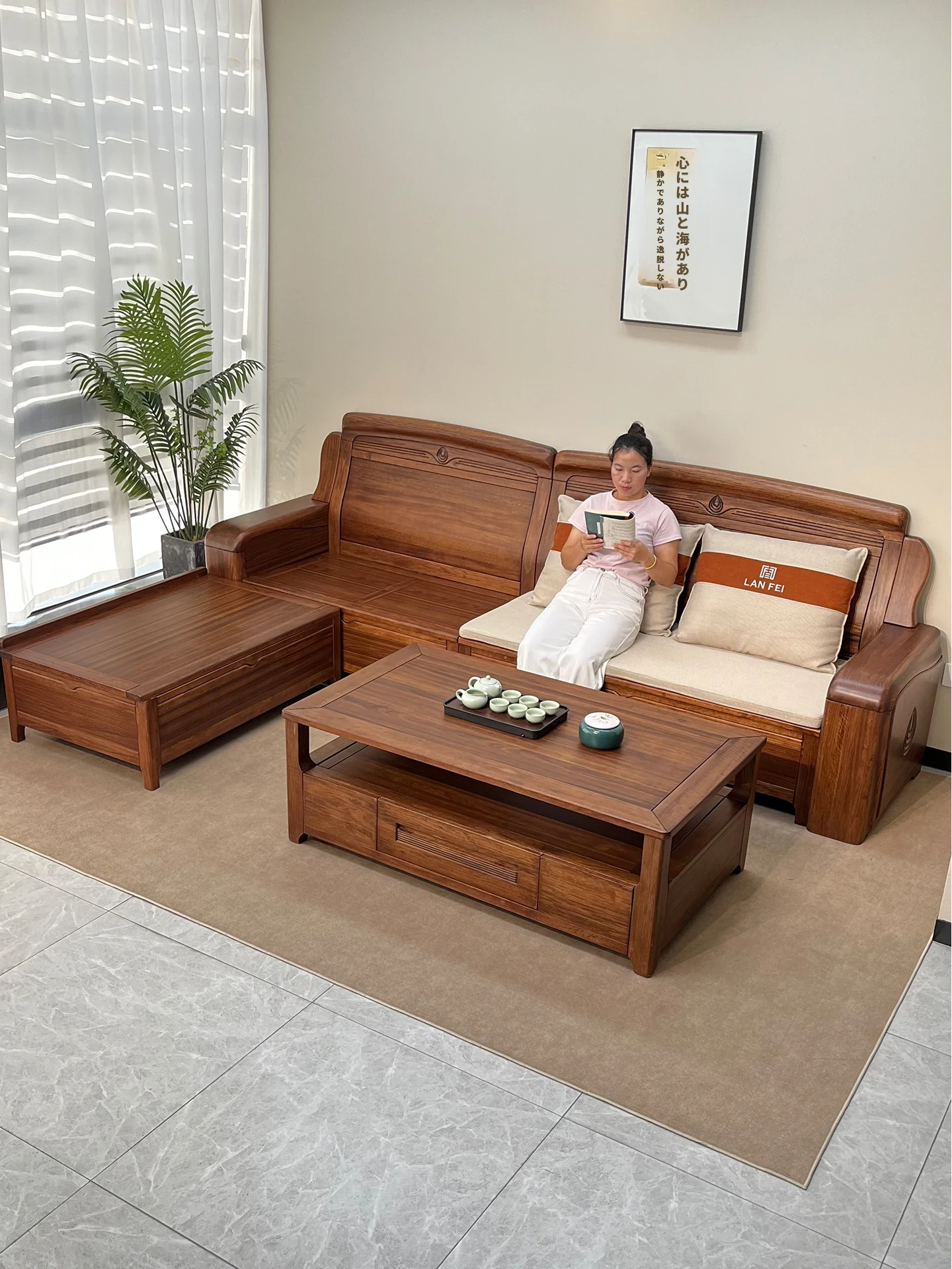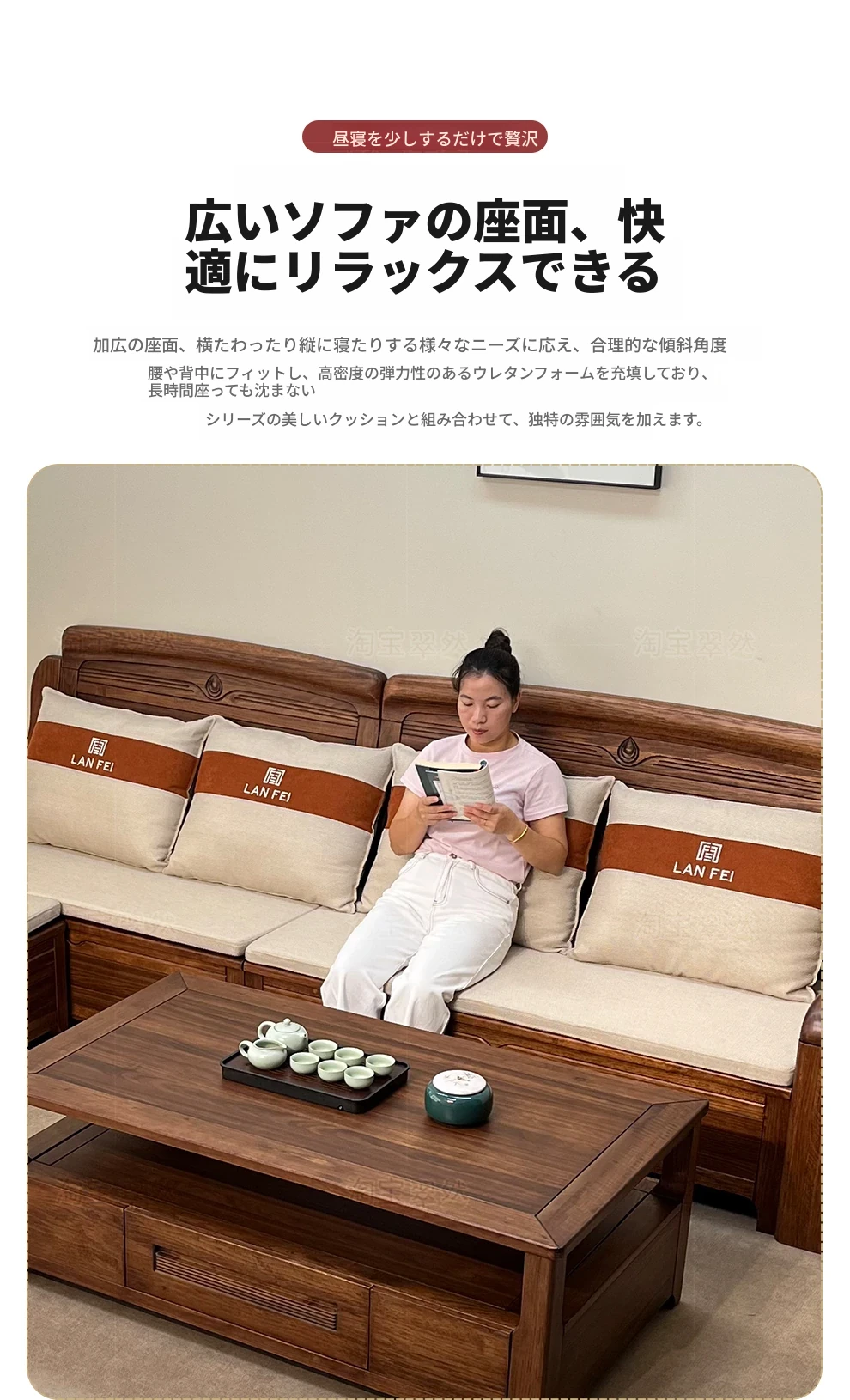冬夏兼用の貴妃椅子付き、収納力抜群の五人掛けゴールドナシの無垢材ソファセット!小型リビングにもぴったりな中華風家具で、心地良い空間を演出します。